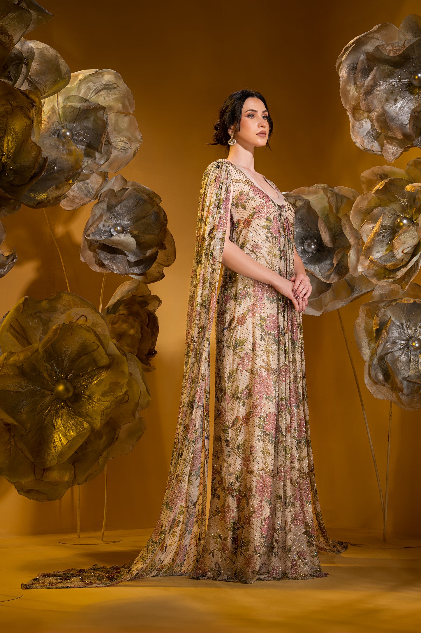 Chiffon Printed Long Gown With Trail Sleeves Full Swarovski Stylish Neckline.