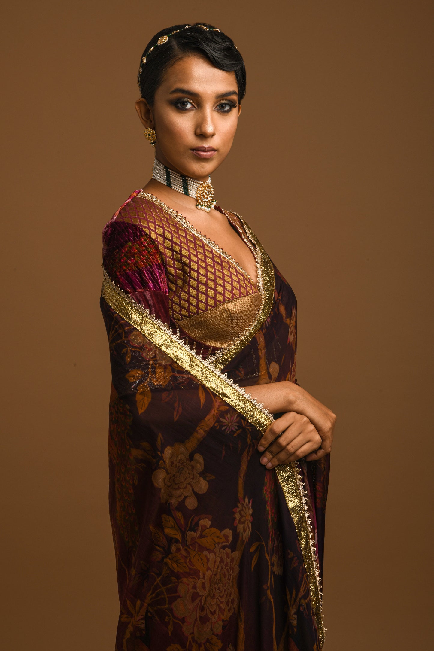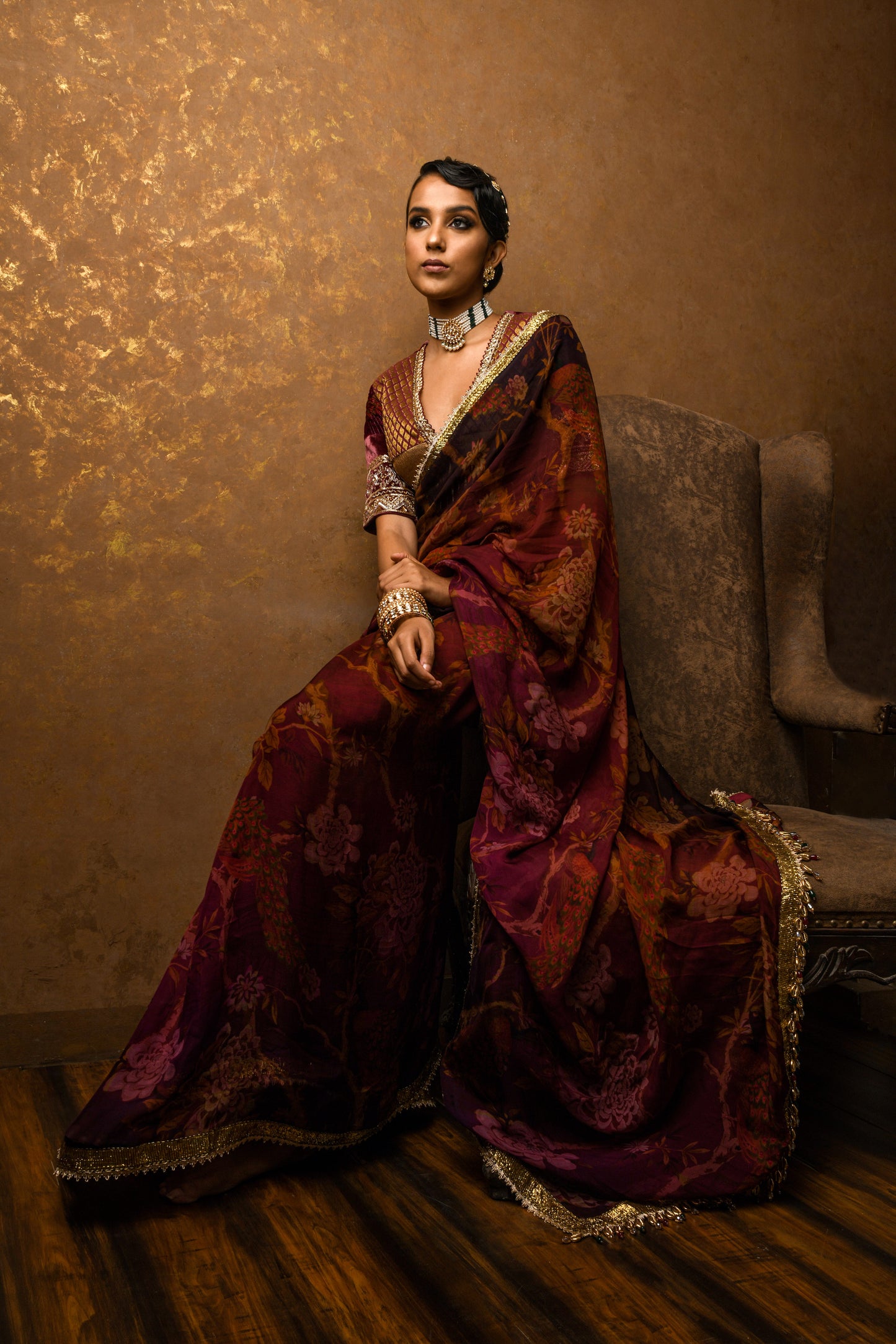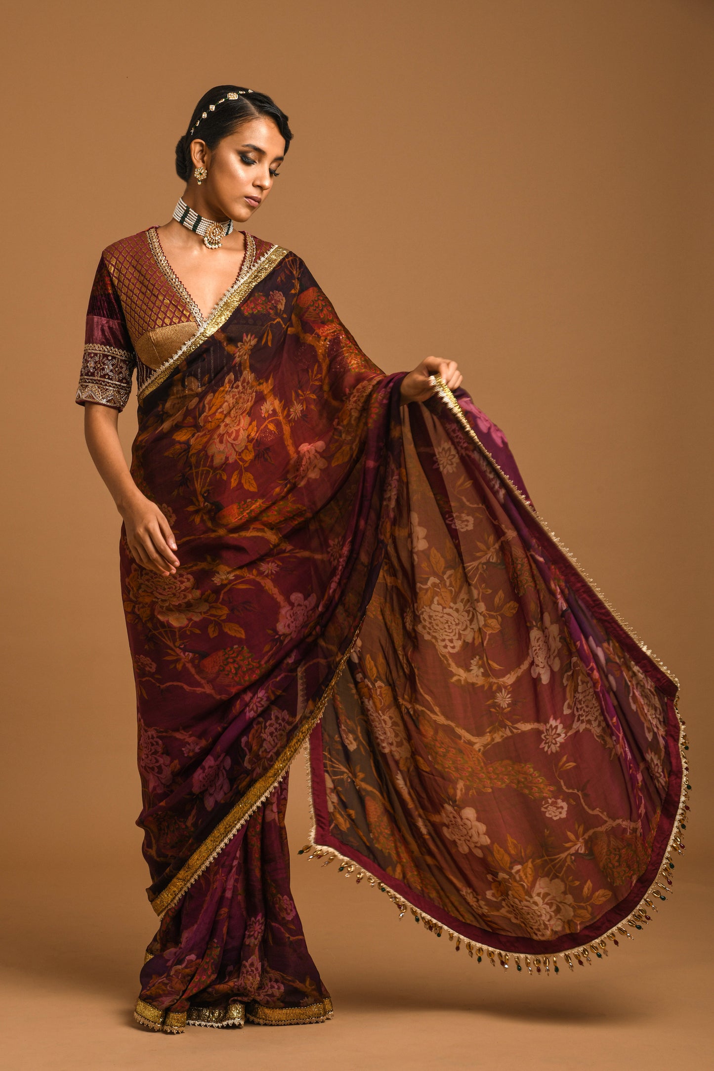 Maroon Saree Based On Paper Silk Features Captivating Royal Print And A Pure Gota Border With Multicolour Tassels. It Is Paired With A Royal Blouse Displaying V- Neck And Dark Gold Beads, Dabka And Sequin Embroidery.