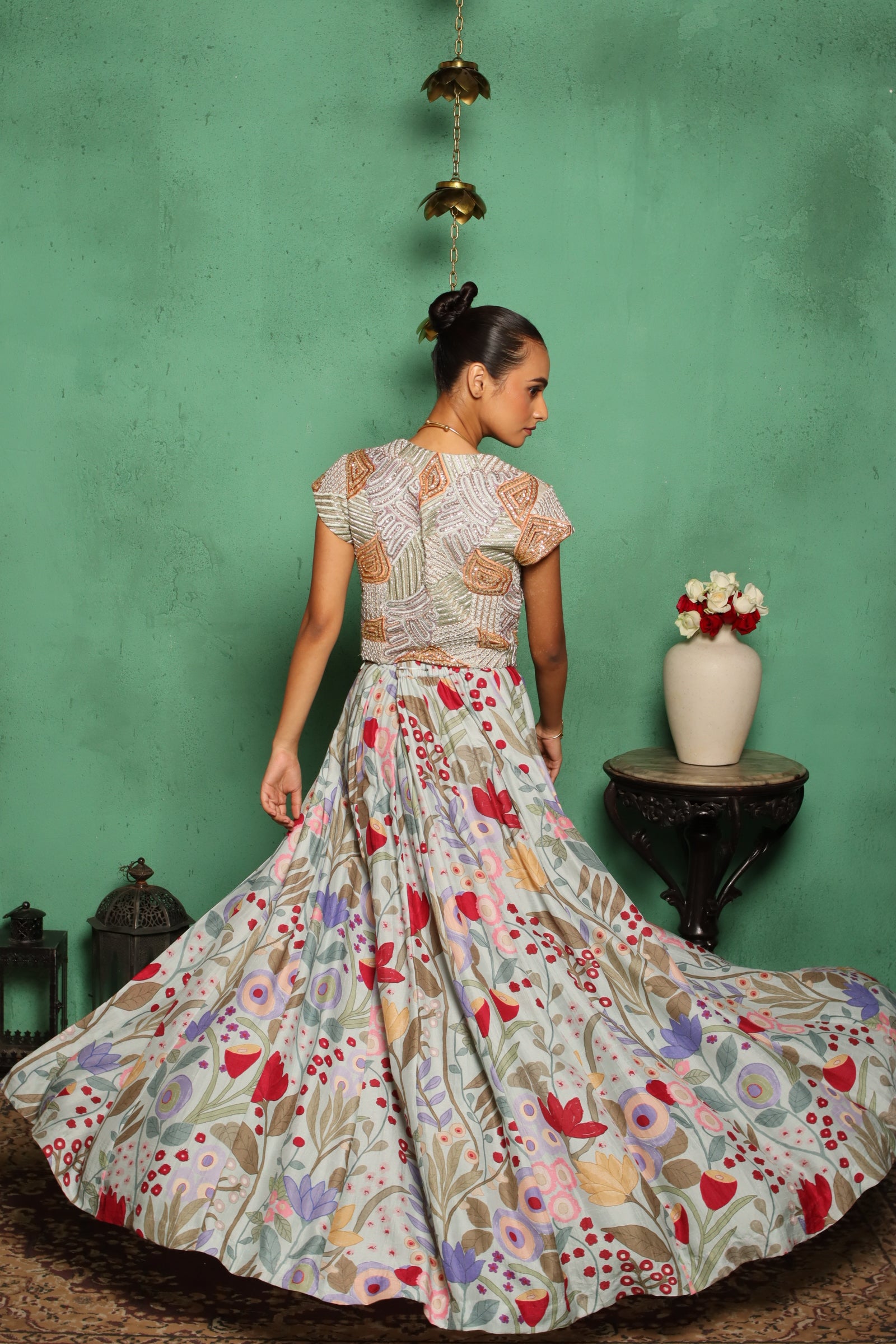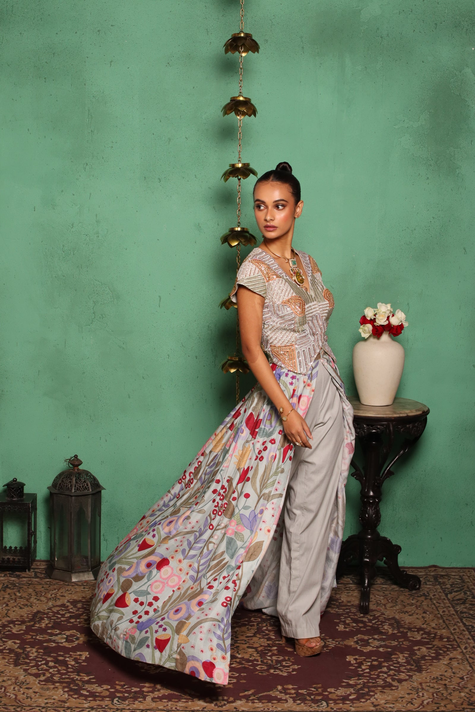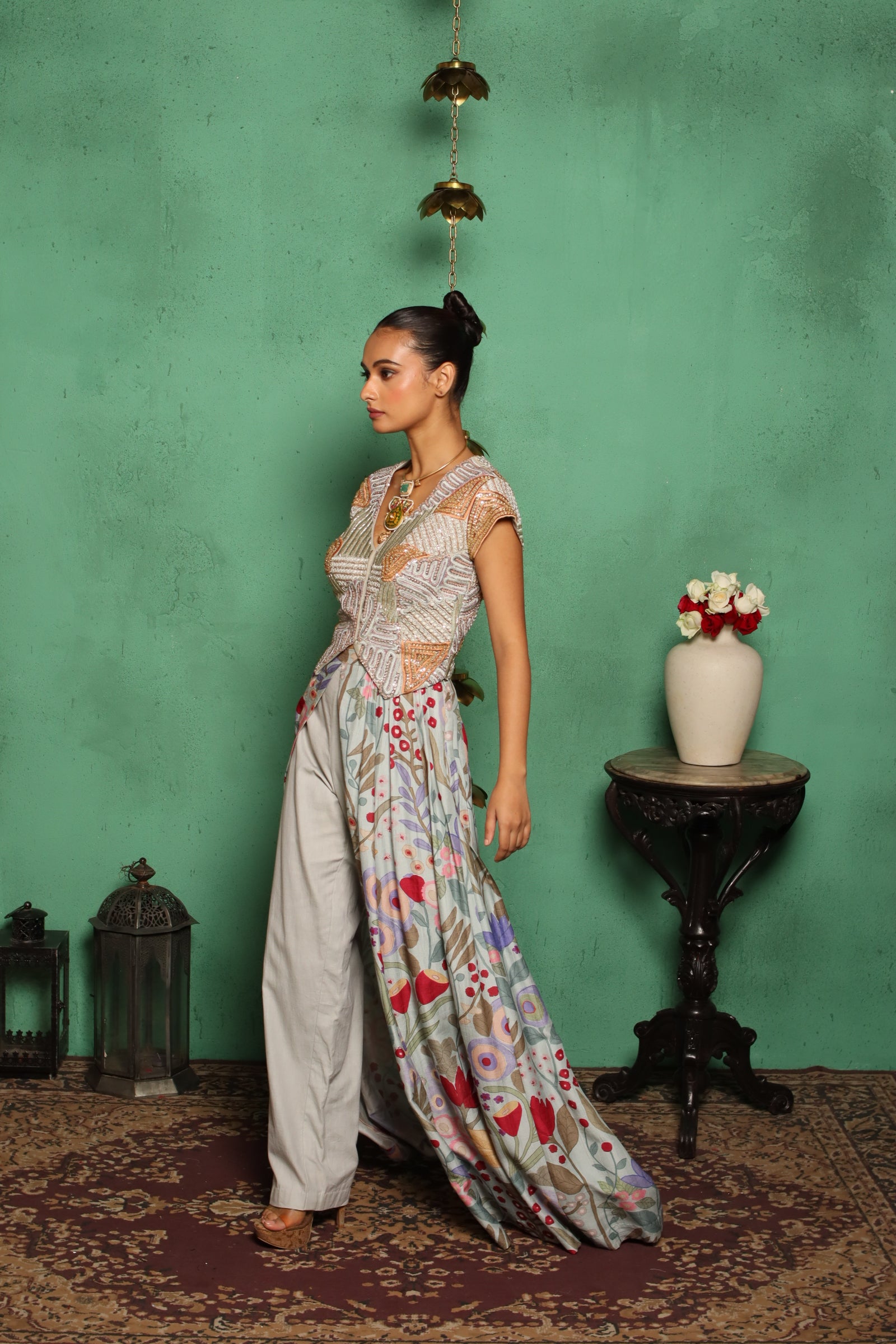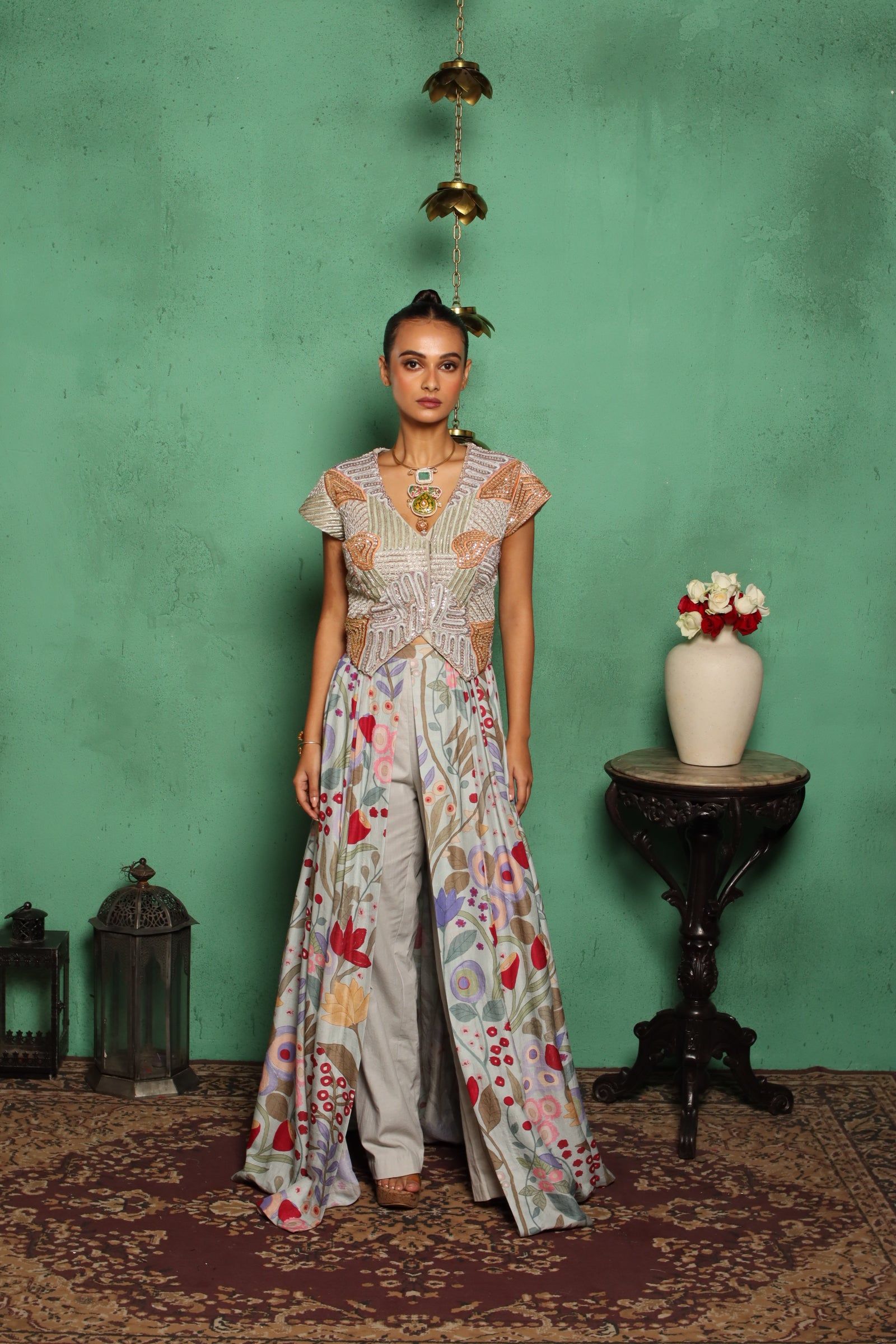 A Whisper Of Tradition, A Shout Of Style! This Classy Ensemble Features A Show-Stopping Embroidered Waistcoat Paired With Printed Pants & A Flowing Skirt Overlay. Geometric Artistry Meets Flowing Grace!