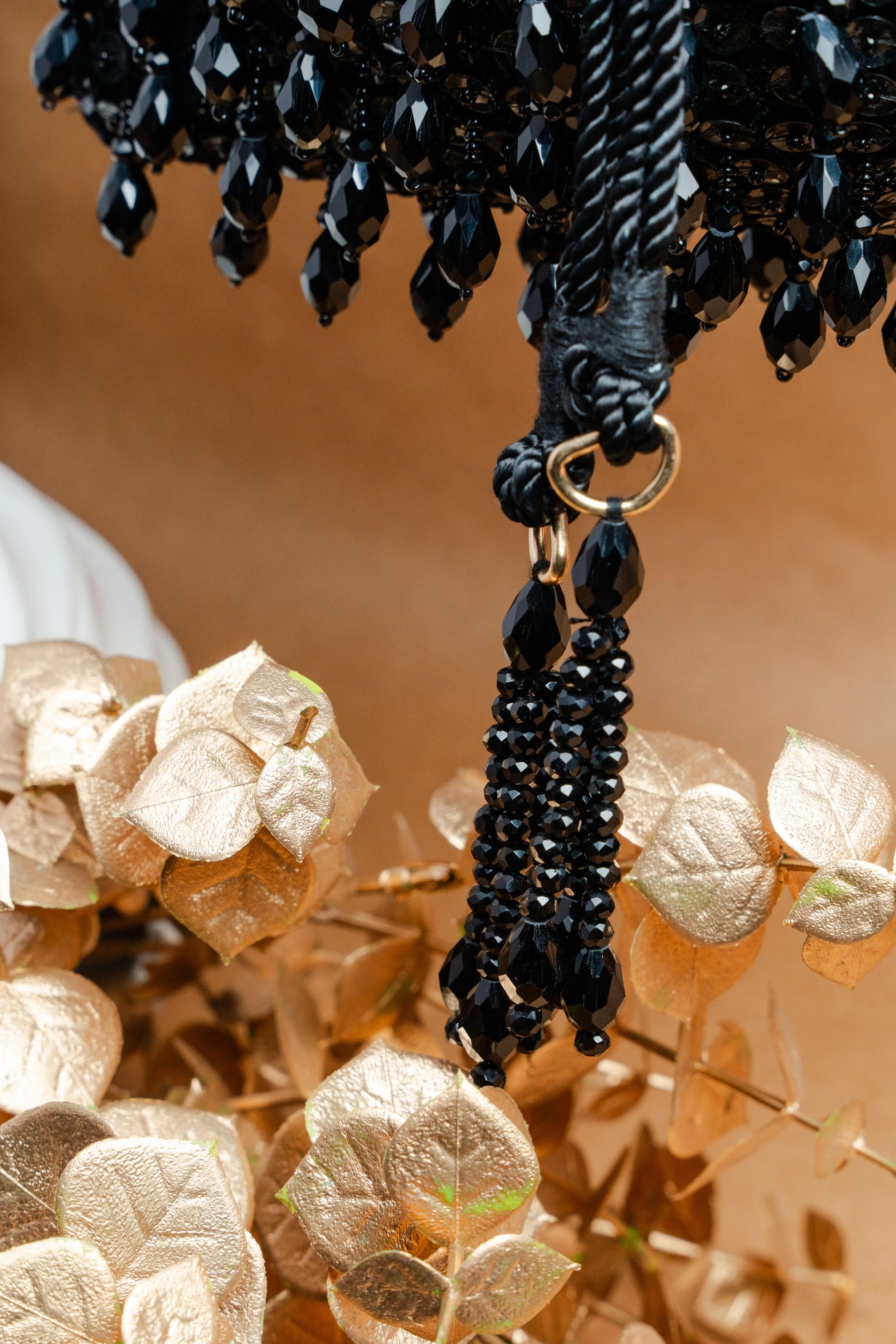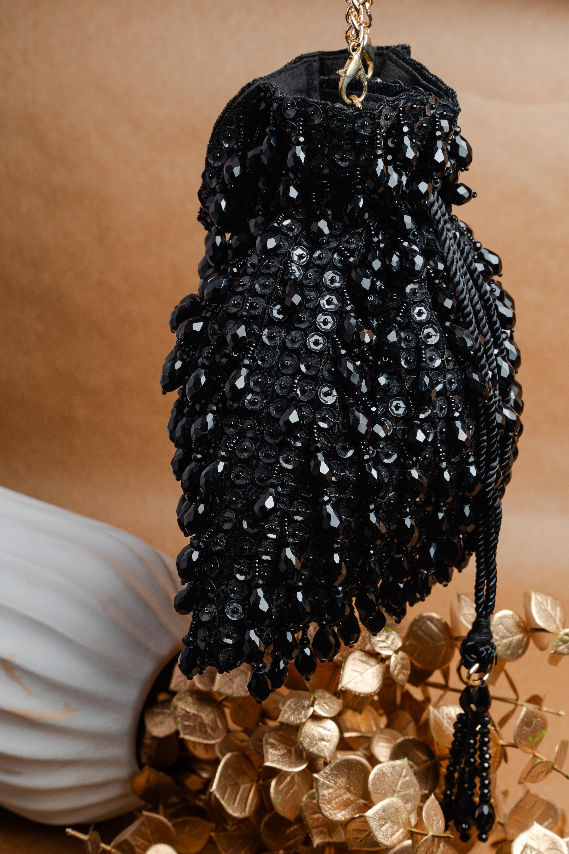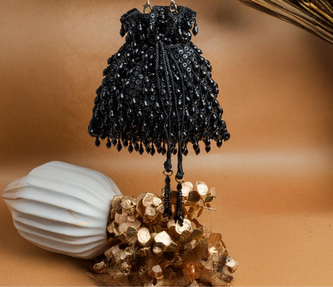 A Variation Of Black Jewels And Beads Dangling On This Voguish Potli, With A Subtle Sequinned Finish