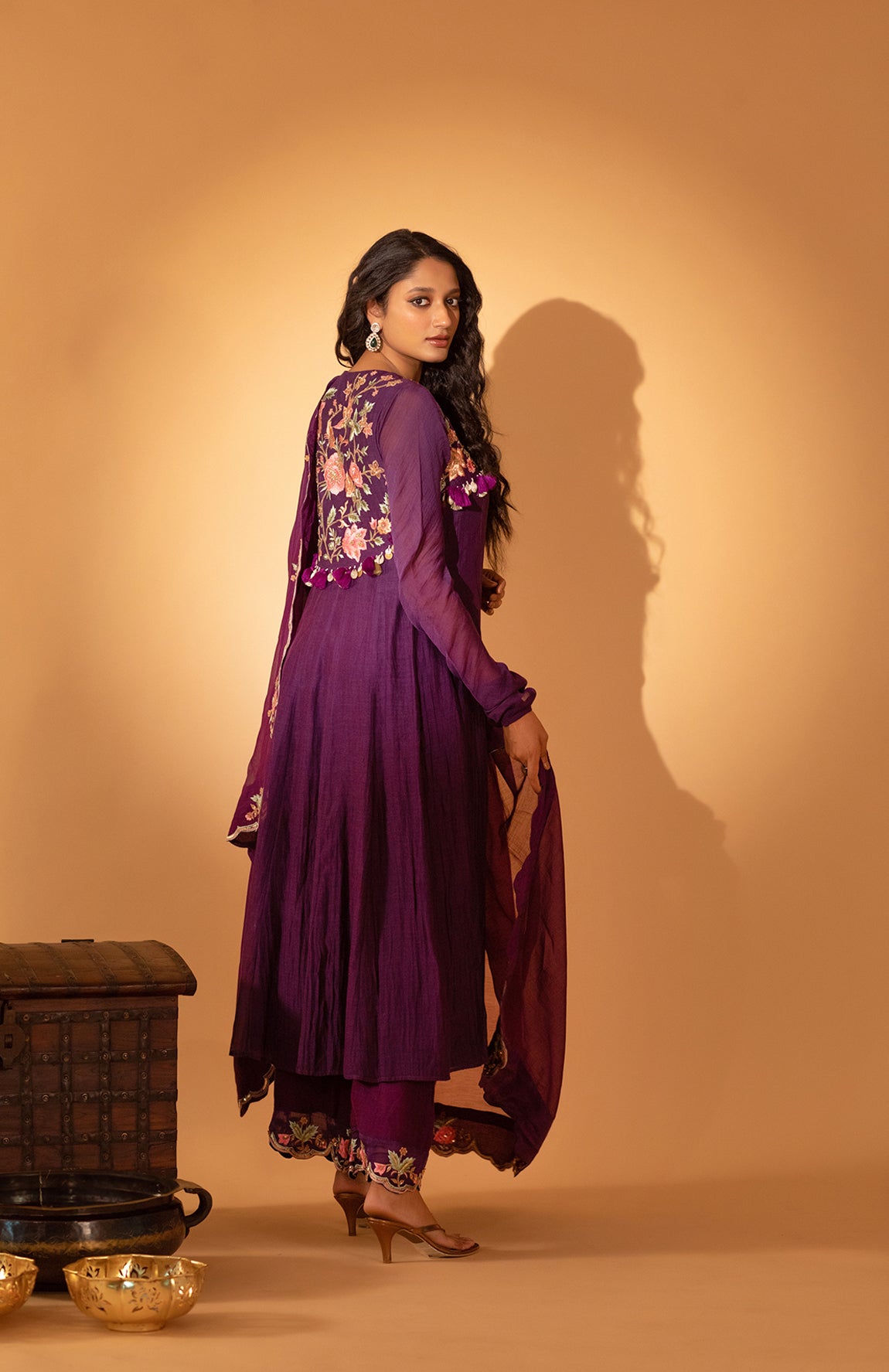 A Purple Outfit With Hand Embroidery All Over, Including On The Pants And Scallop Dupatta.