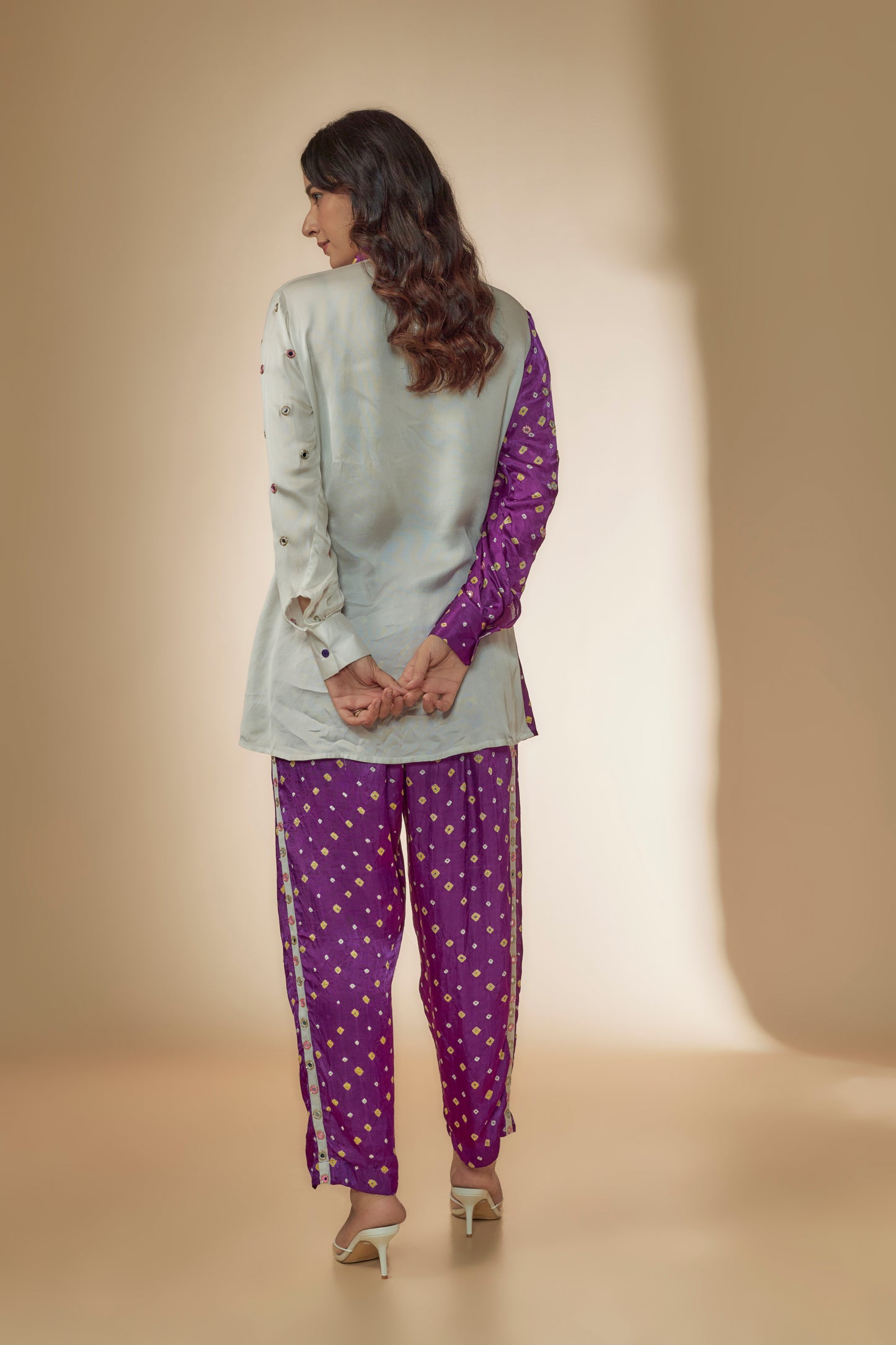 Purple And White Shirt Co-ord Set In Bandhani Fabric. The Purple Bandhani Is Offset With White Silk .The Shirt Features Over All Han Embroidery In Mirror Work, Resham And Beads. The Purple Bandhani Pants Feature A Contrasting White Embroidered Side Panel.