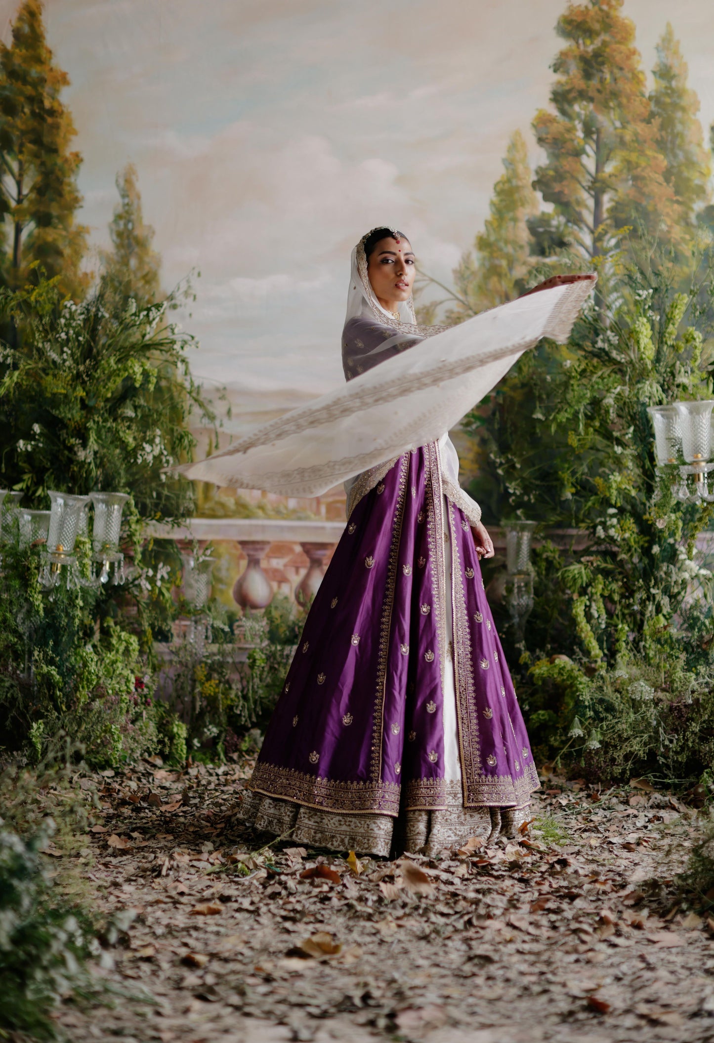This Ensemble Is A True Embodiment Of Timeless Beauty And Traditional Elegance, Designed To Make A Grand Statement On Special Occasions. Embellished With Delicate Aari Embroidery, Antique Gold Dori, And Intricate Motifs, The Jacket Pays Homage To The Rich Heritage Of Indian Craftsmanship. Complementing The Jacket Is A Chanderi Silk Lehenga And Organza Dupatta, Meticulously Designed To Match The Opulence Of The Ensemble. The Lehenga'S Intricate Craftsmanship And Regal Colour Palette Create A Sense Of Tradition And Modernity In Perfect Harmony. Whether You'Re Attending A Grand Wedding, A Cultural Celebration, Or Any Special Event, The Purple Jacket Set Ensures You Radiate With Unparalleled Style.