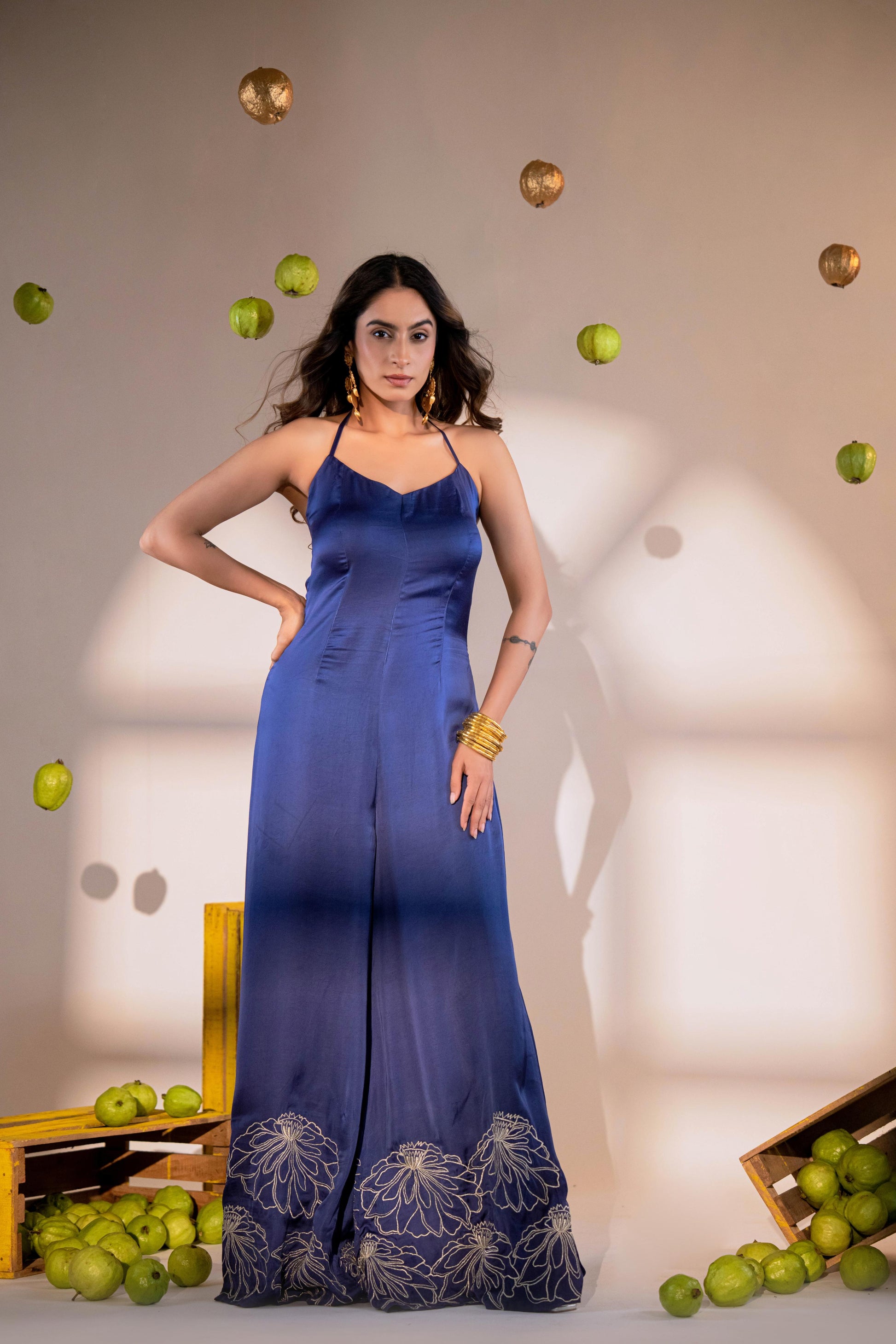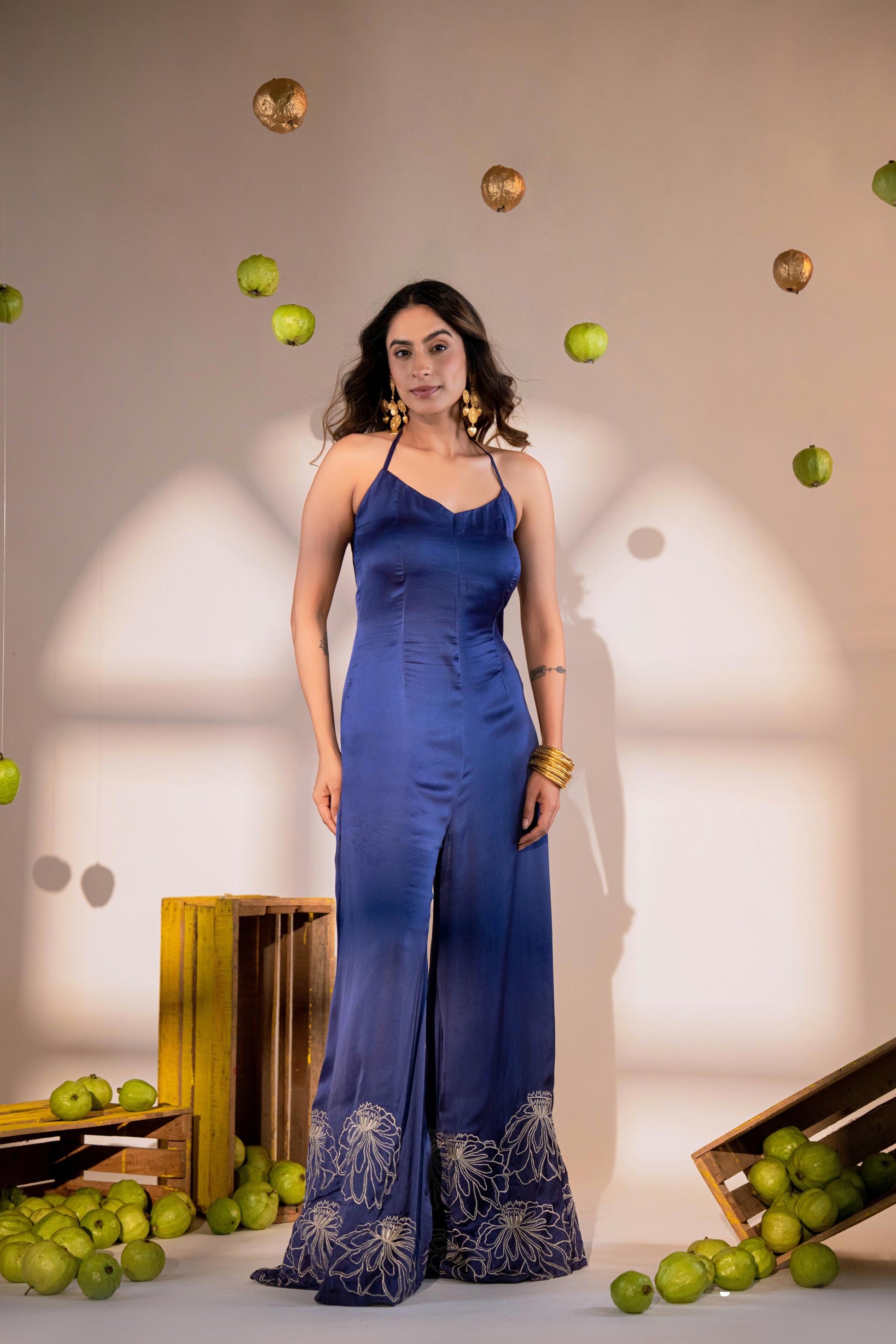 Make A Statement With This Stunning Purple Halter Neck Jumpsuit. Featuring Beautiful Embroidery On The Bottom, It's The Perfect Blend Of Elegance And Contemporary Style. Ideal For Special Occasions Or A Chic Night Out!