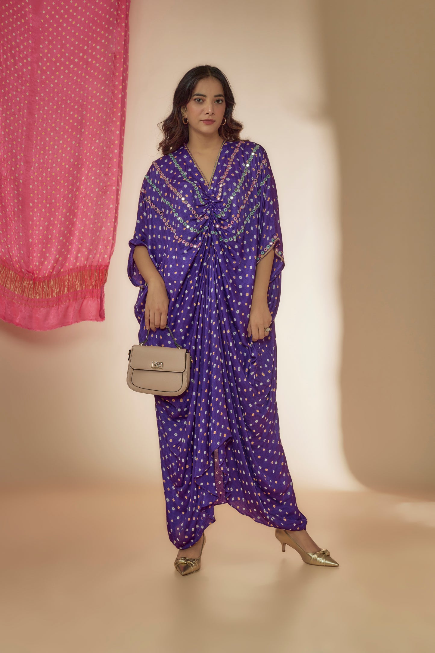 Purple Kaftan Dress With Ruching Detail In Front. The Yoke Features Mirror Work And Beads Hand Embroidery In Contrasting Colour