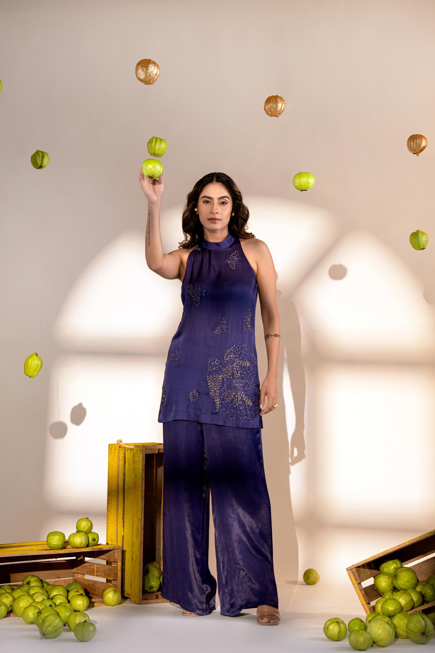 Radiate Elegance In This Beautiful Purple Halter Neck Kurta Set. The Kurta Features Delicate Hand Embroidery, Adding A Unique And Refined Touch To The Modern Silhouette. Perfectly Paired With Matching Bottoms, This Set Is Ideal For Making A Stylish Statement At Any Event.