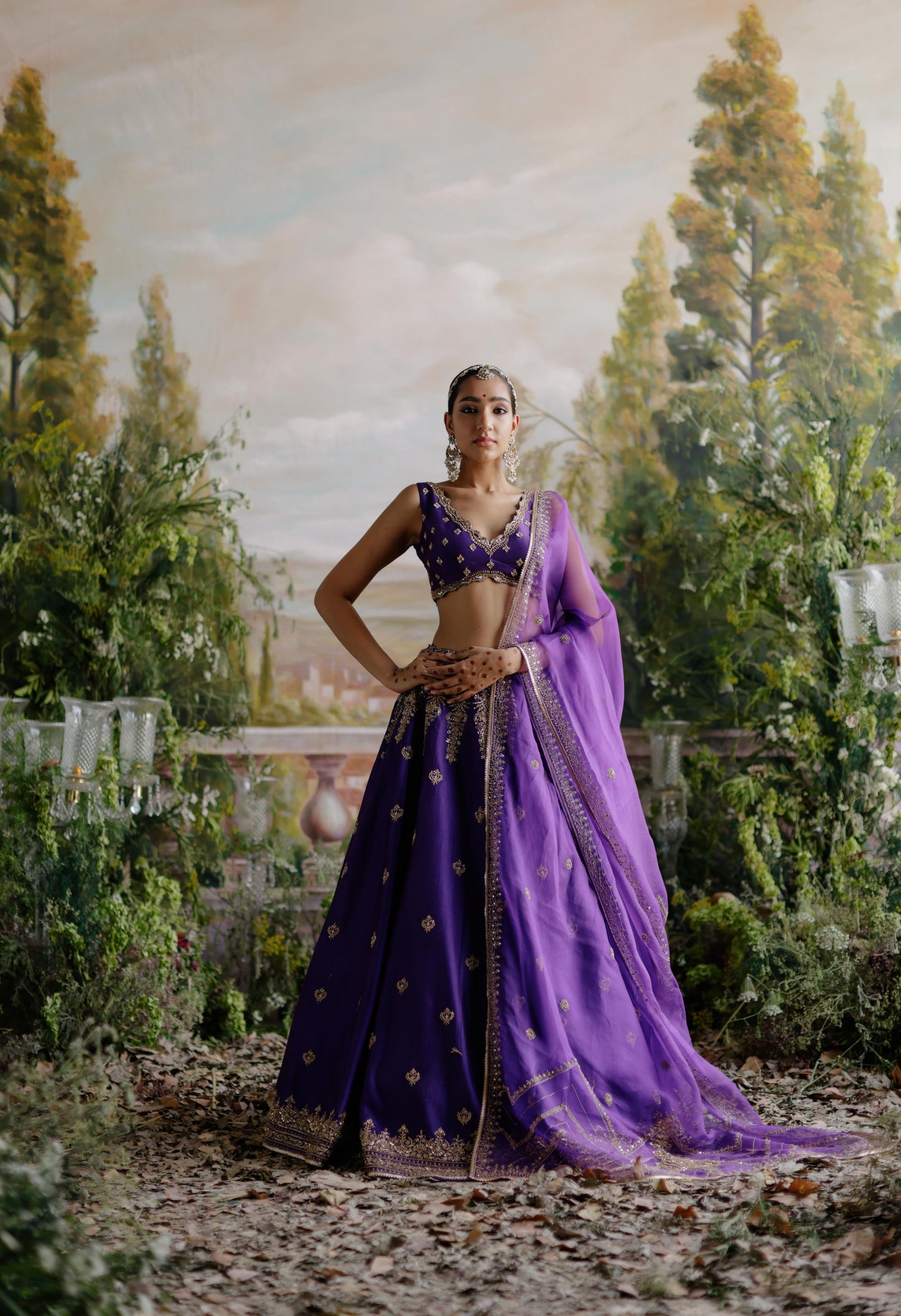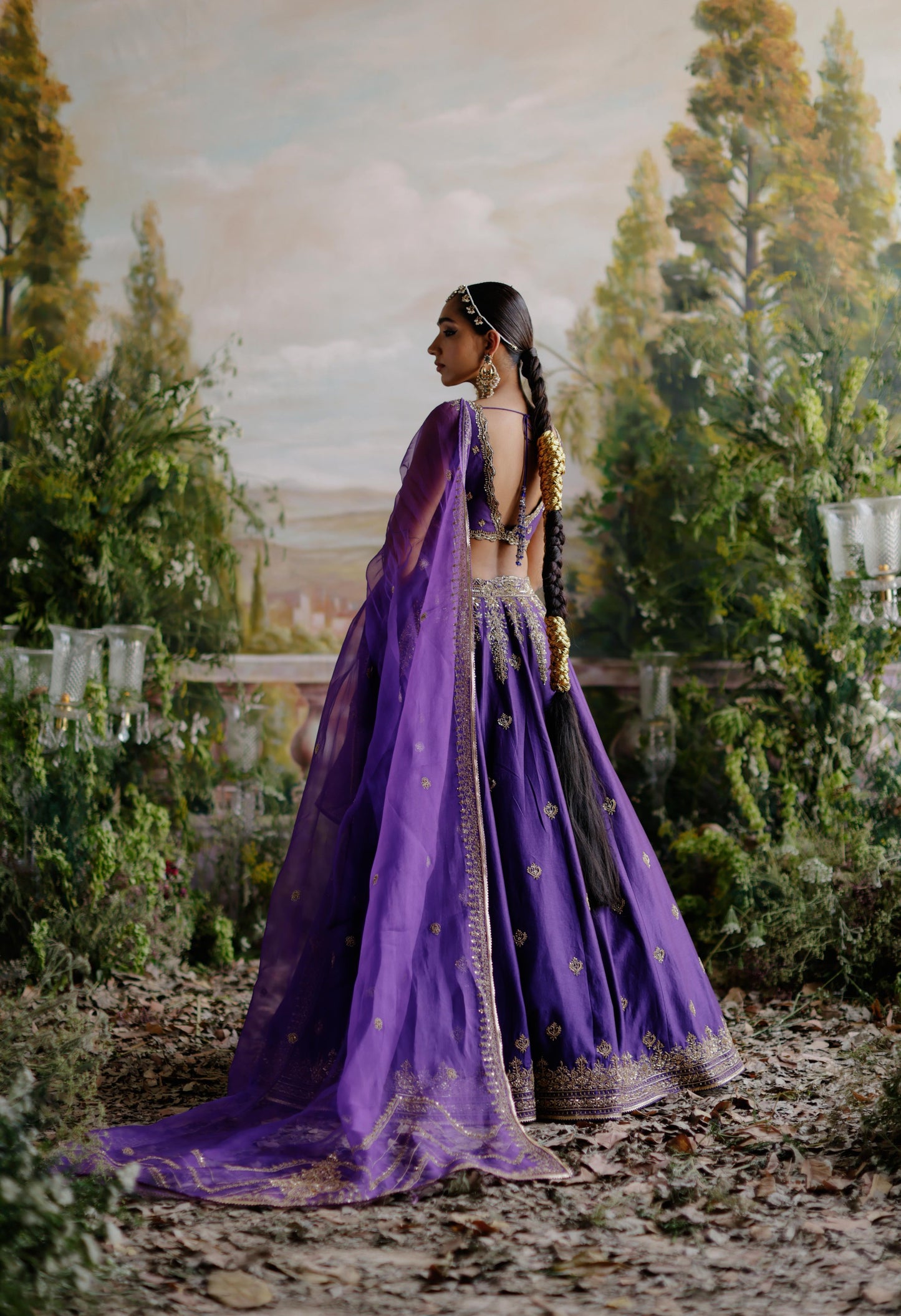 This Ensemble Is A Celebration Of Opulence And Traditional Allure, Designed To Make A Captivating Statement On Special Occasions. Adorned With Delicate Hand Embroidery And Antique Gold Dori, The Raw Silk Lehenga And Organza Dupatta Pay Homage To The Rich Heritage Of Indian Craftsmanship. The Regal Purple Hue Exudes An Air Of Grandeur And Charm, Making It A Perfect Choice For A Range Of Celebrations. Whether You'Re Attending A Wedding, A Cultural Event, Or A Special Celebration, The Purple Lehenga Set Will Ensure You Shine With Regal Elegance And Enduring Allure.