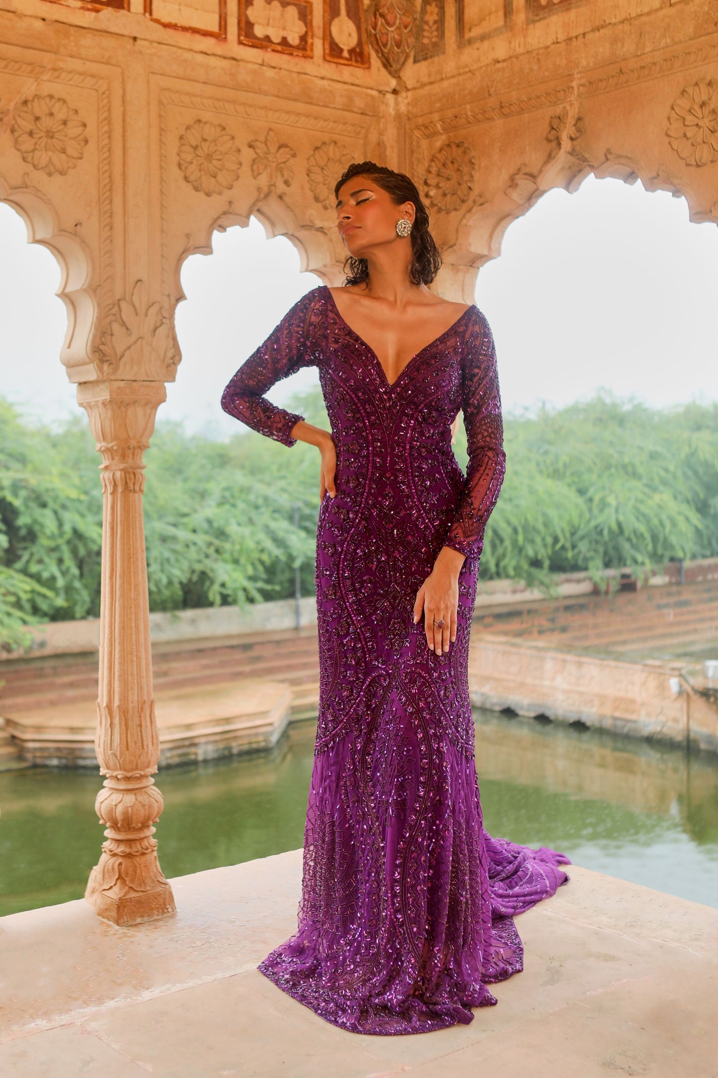 This Mesmerizing Purple Gown Based On Butterfly Net, Adorned With Delicate Tone-On-Tone Embellishments, Showcases A Flattering Mermaid Silhouette That Gracefully Accentuates Your Curves. The Trailing Design Adds A Touch Of Drama And Sophistication To Your Look.