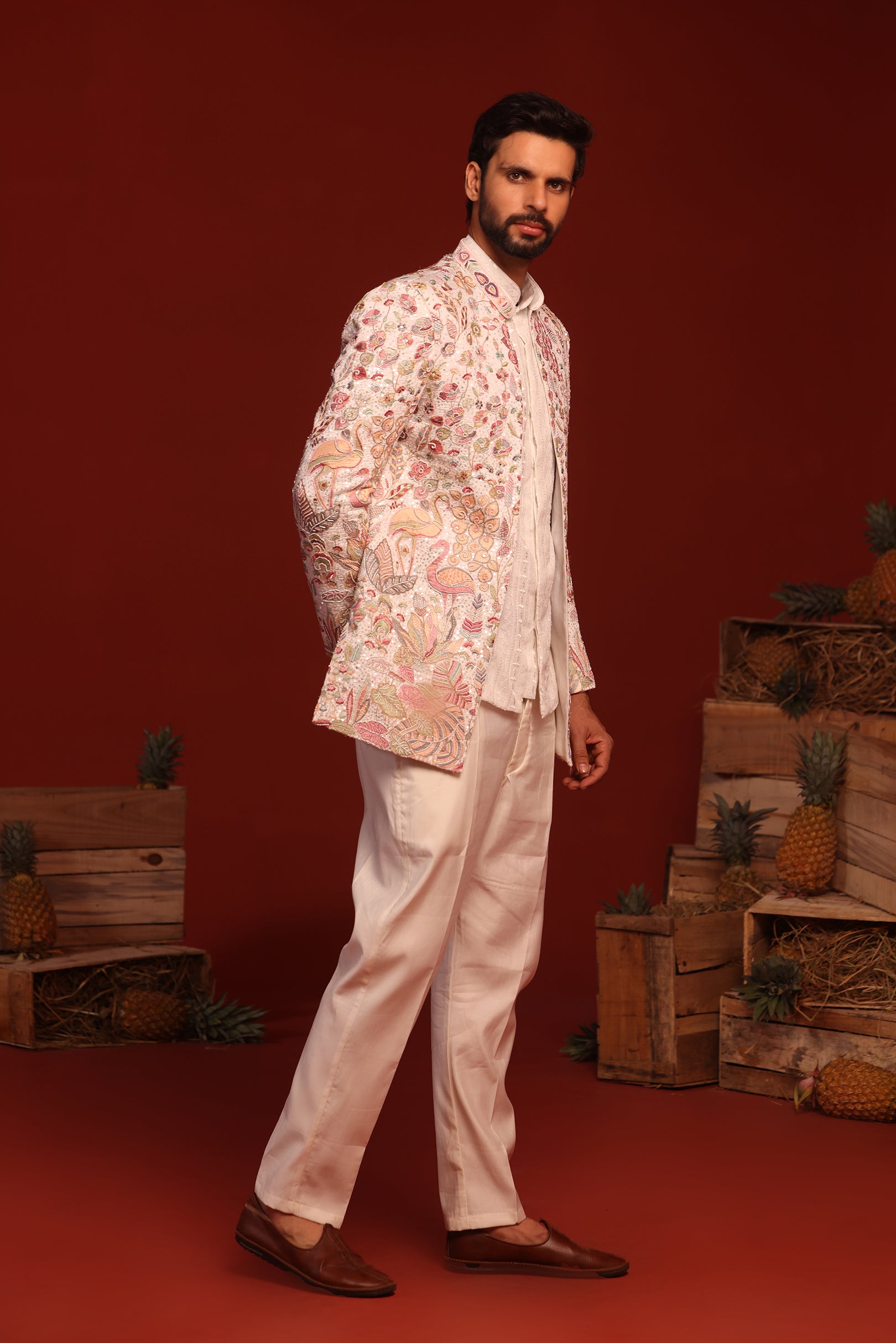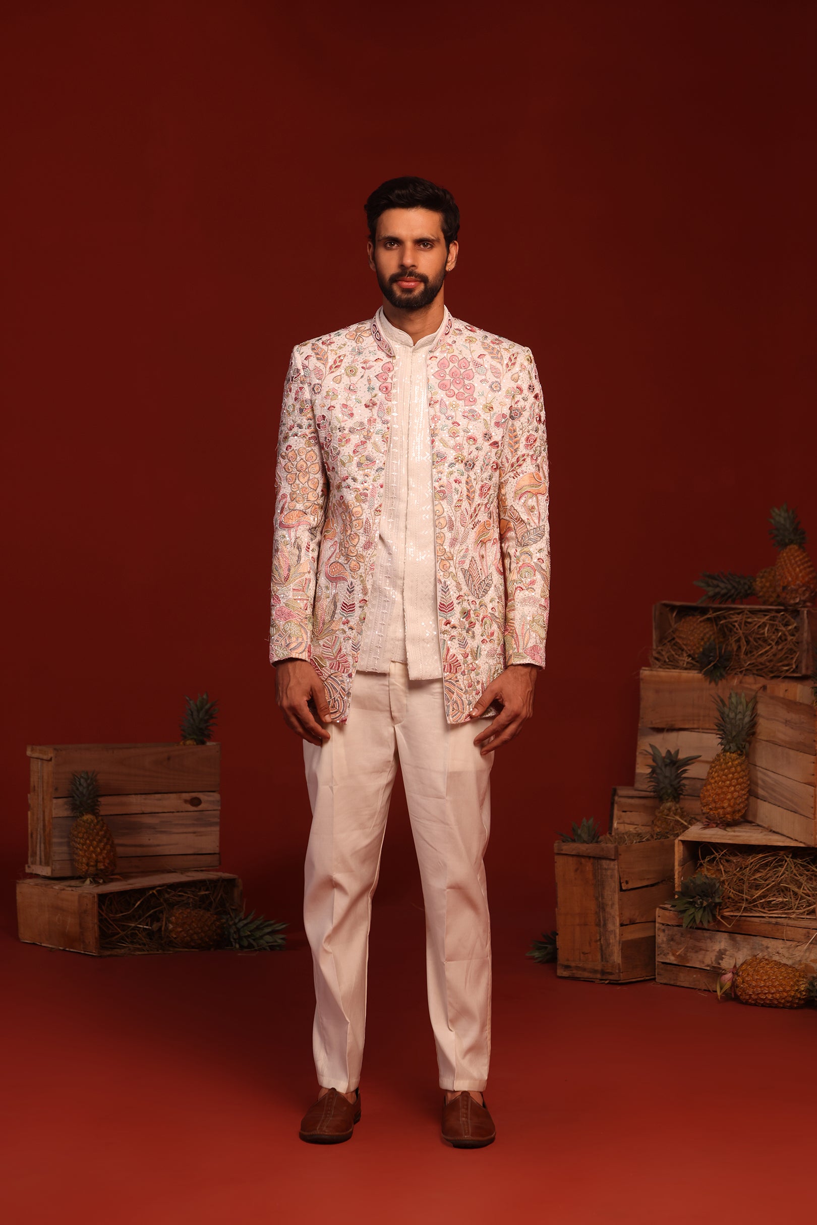 This Stylish Jodhpuri Set Features Intricate Cut Dana Handwork. Paired With A Short Embroidered Shirt With Detailing On The Collar, It Is A Refined Choice. The Trousers With Two Pockets And Viscose-Lined Kurta Ensure Both Style And Functionality.