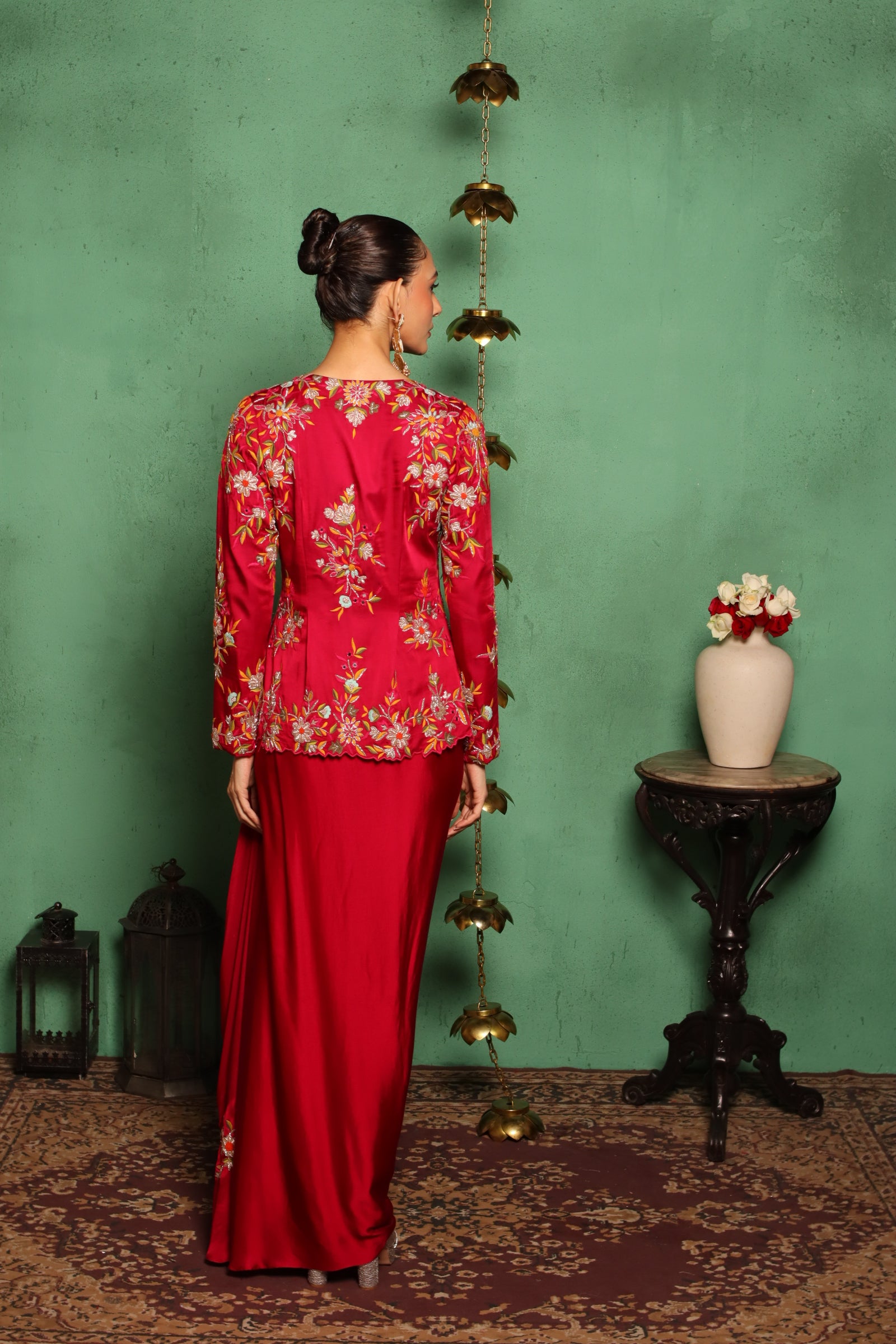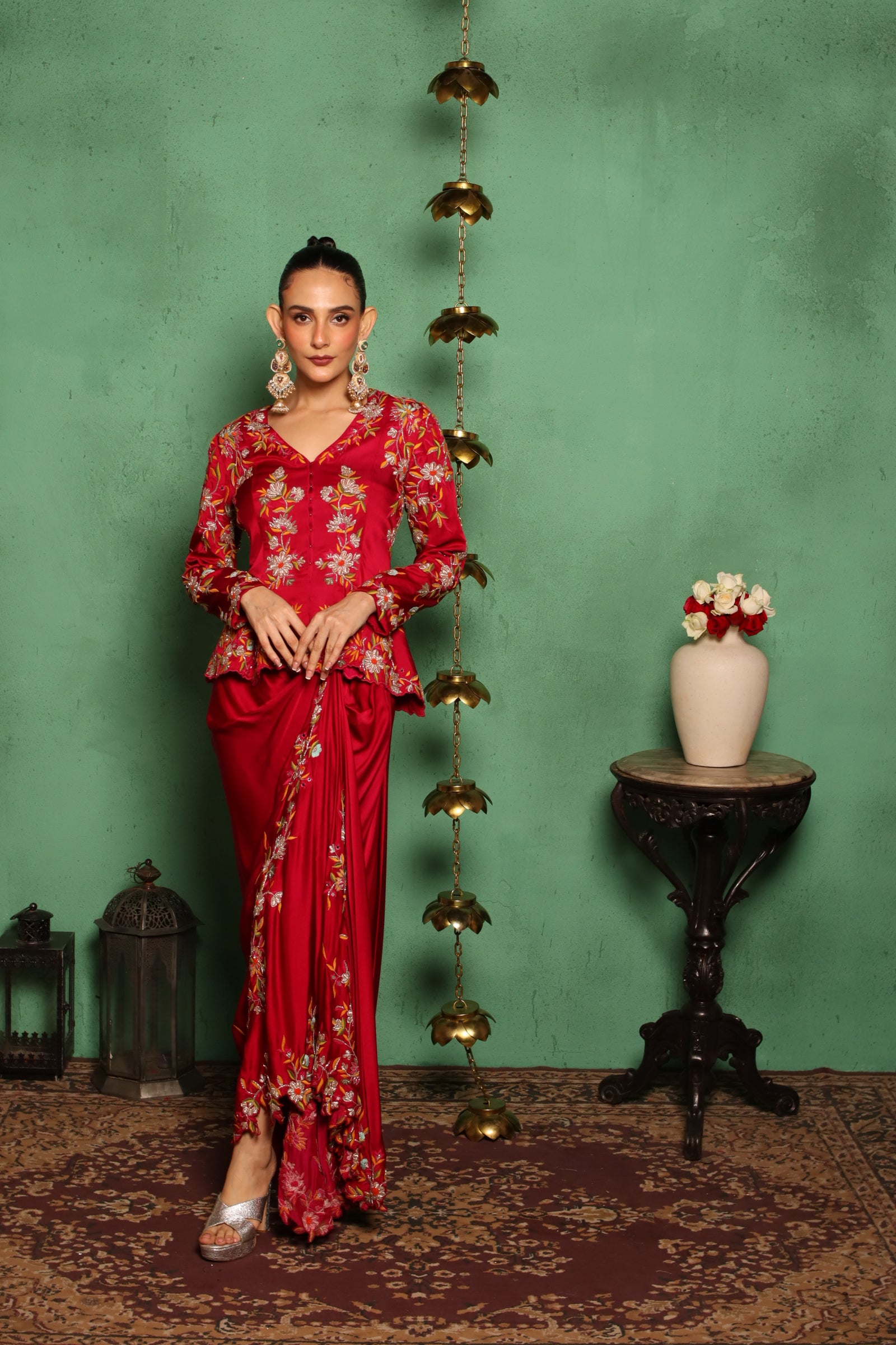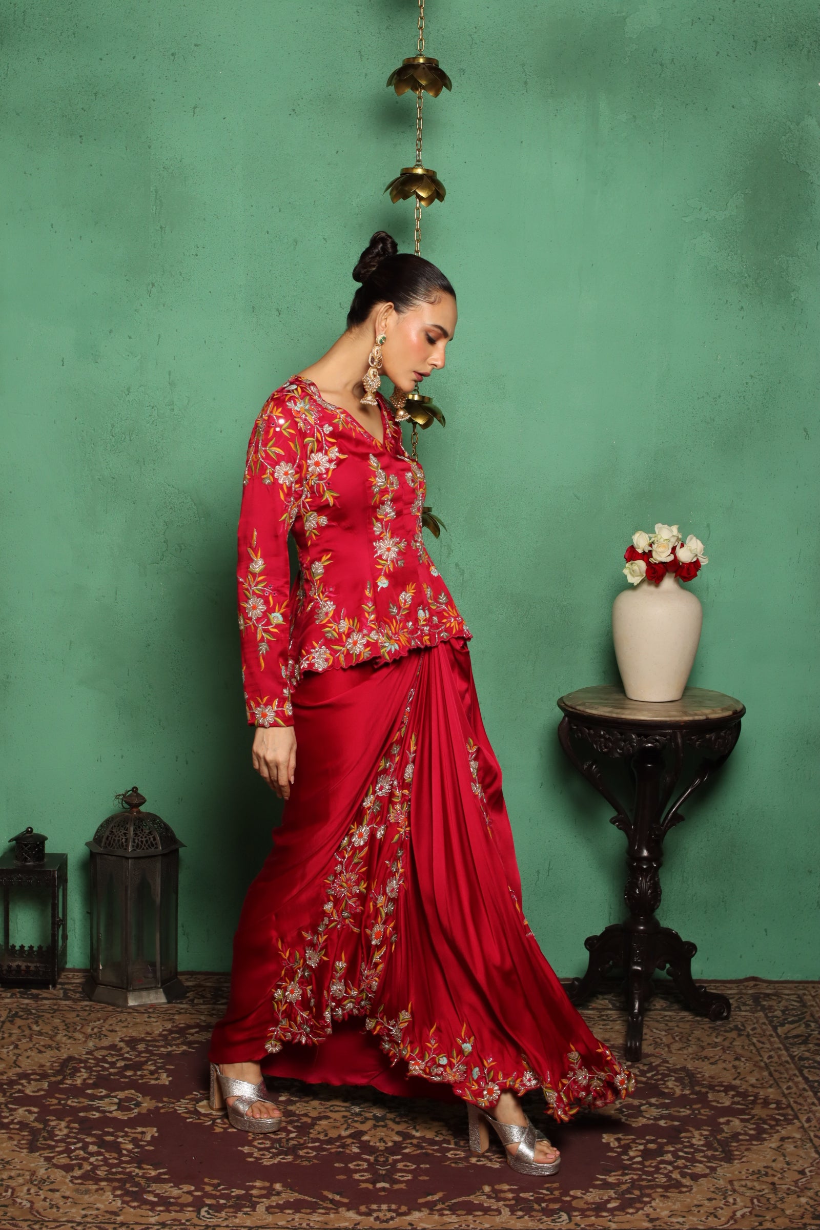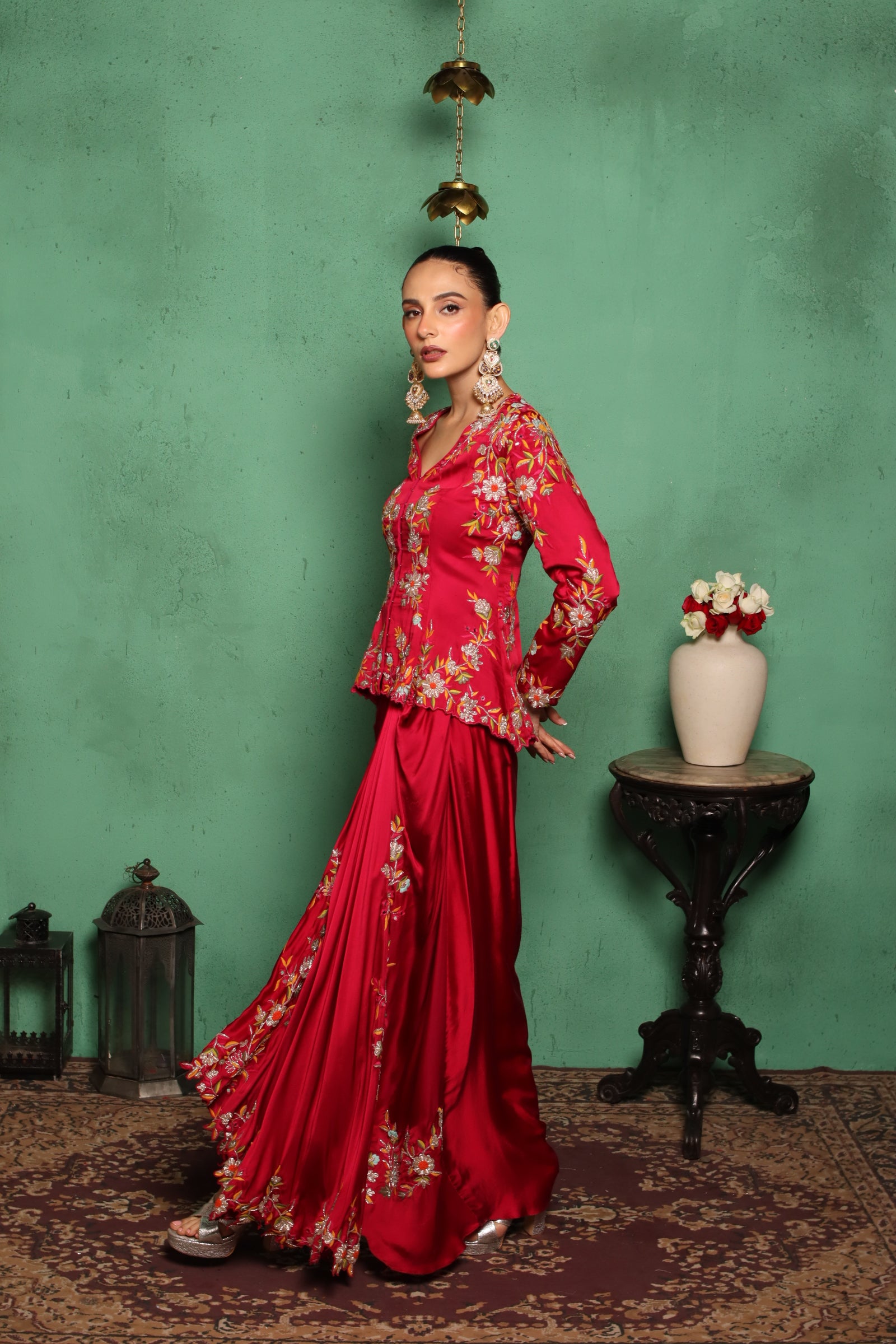 Fusion Fantasy At Its Finest! This Spellbinding Fusion Couture Features A Richly Embroidered Peplum Jacket & Flowing Dhoti Skirt. The Vibrant Hue & Ornate Floral Details Create A Look That's Both Majestic & Playful – Perfect For Celebrating Your Special Day In Style.