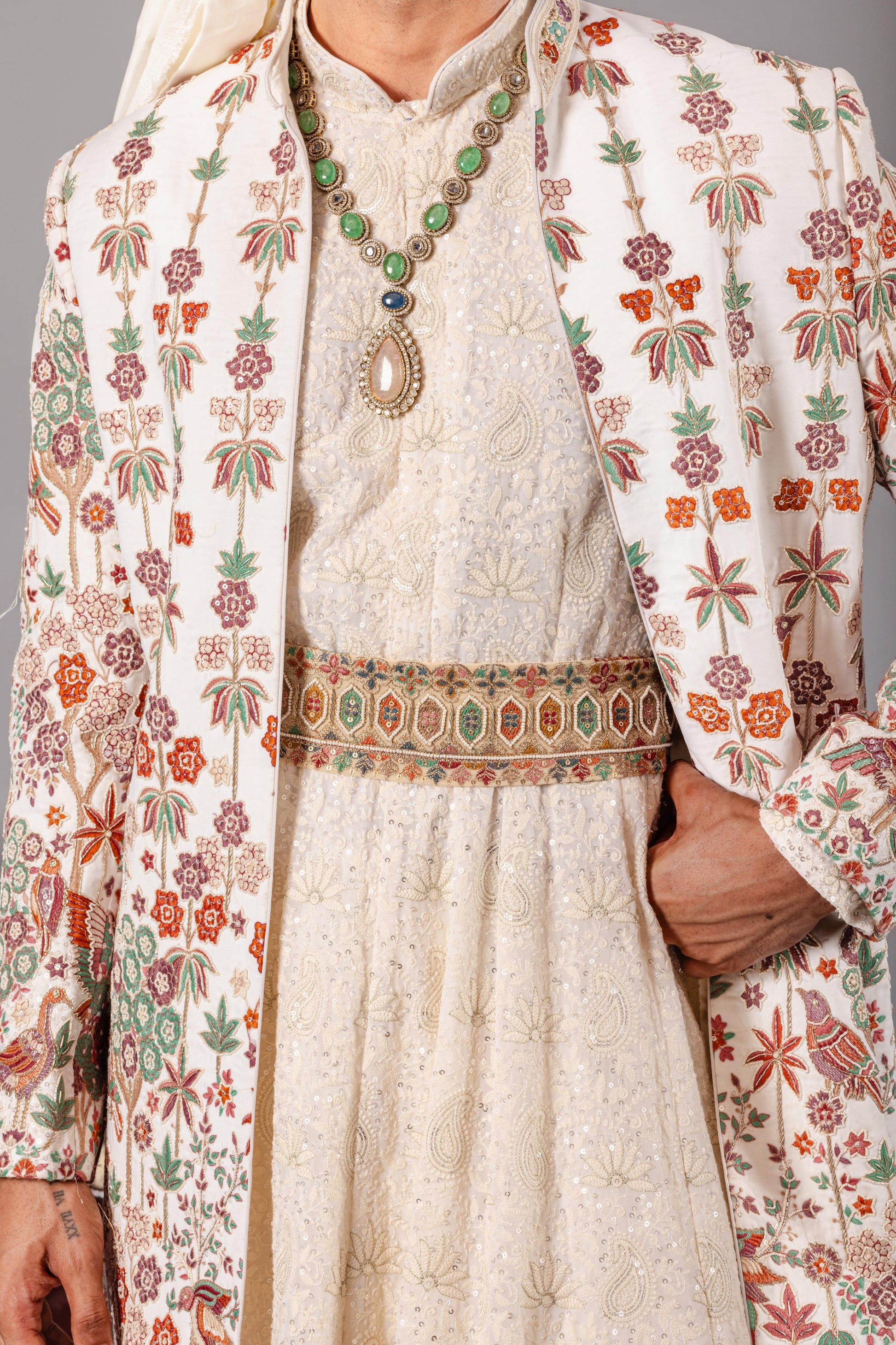 Inspired By The Timeless Craft Of The Rangrez — The Master Colour Artisan — This Ivory Sherwani Set Is Brought To Life With A Beautifully Embroidered Jacket Bursting With Multicolour Floral And Jaali Motifs. It Is Paired With Anarkali Inside, Which Is Also Beautifully Embroidered, Come With Churidar Bottom And Ivory Safa (Turban) For A More Royal Look. Waist Is Cinched Using Embroidered Belt.