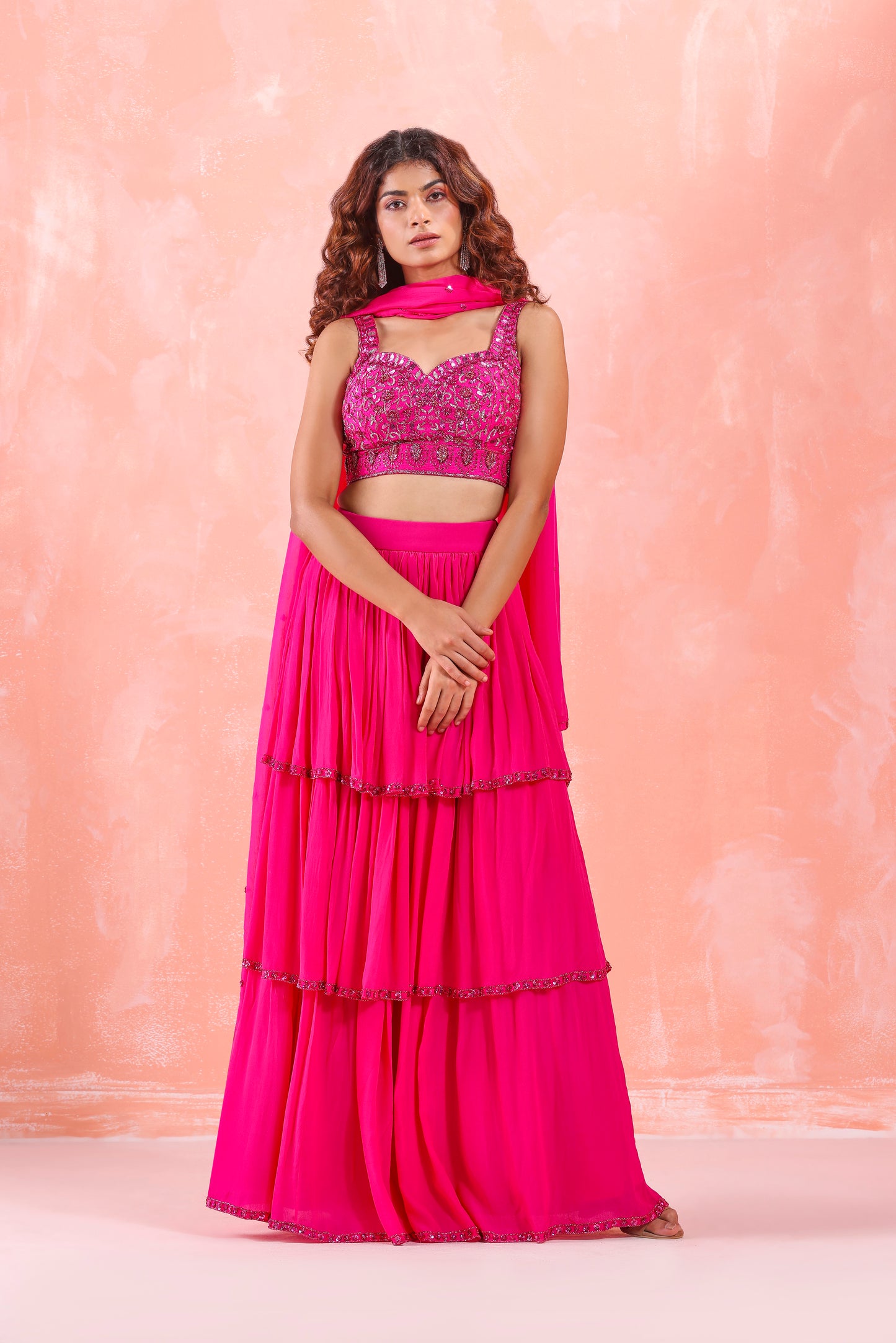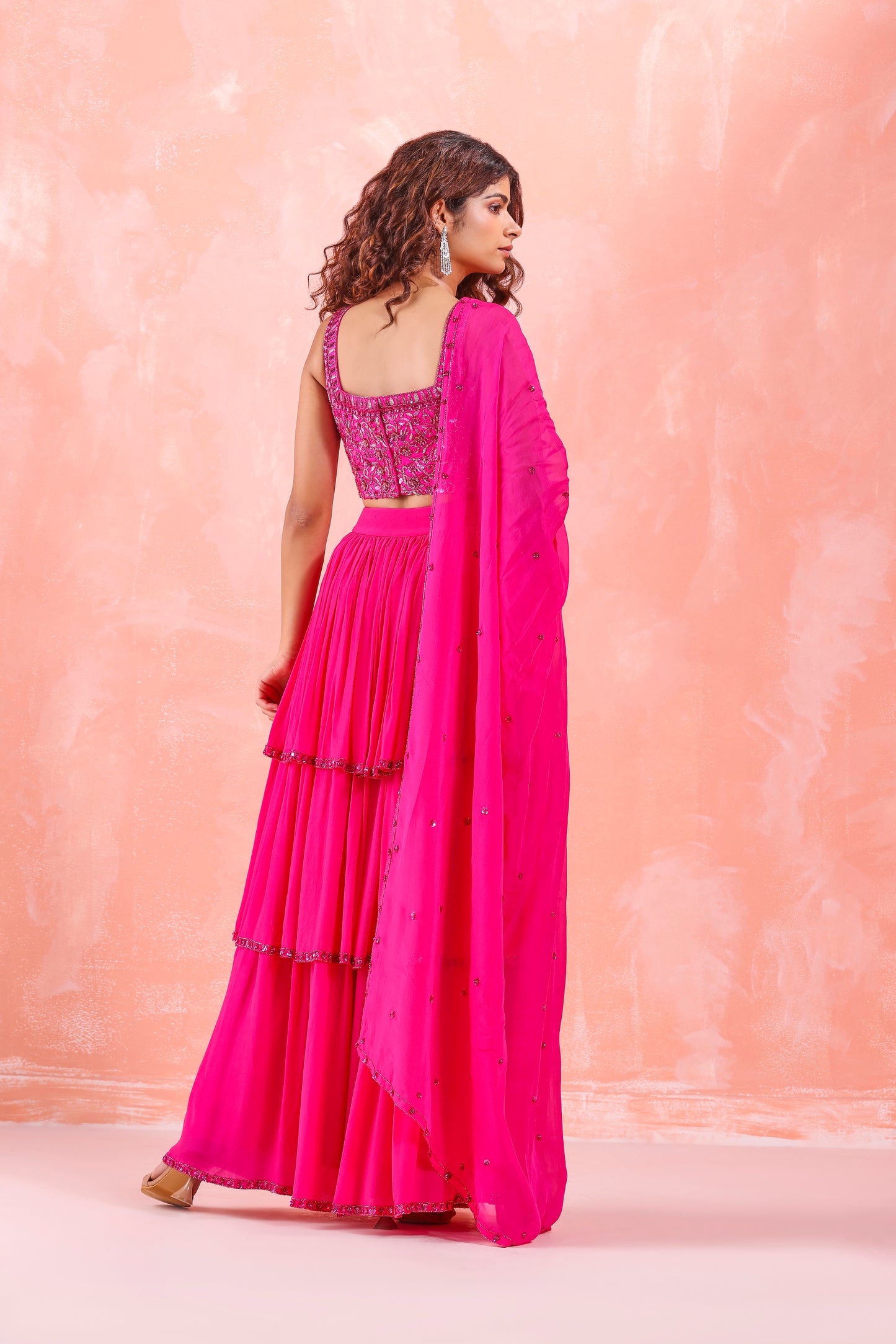 Rani Pink Lehenga Paired With A Finely Detailed Dupatta And A Blouse Adorns Pink Sequins And Beads Embroidery Woven On Silk Organza, Net And Viscose Georgette.