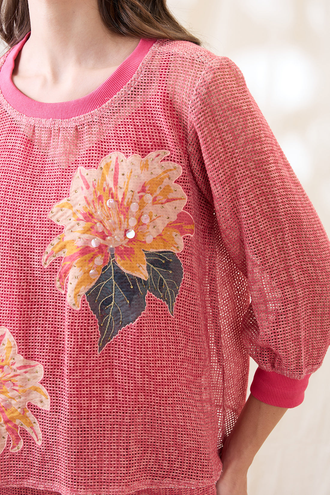 Pink Ravya Appliqued Top And Pants In Cotton Net, Comes With A Slip A