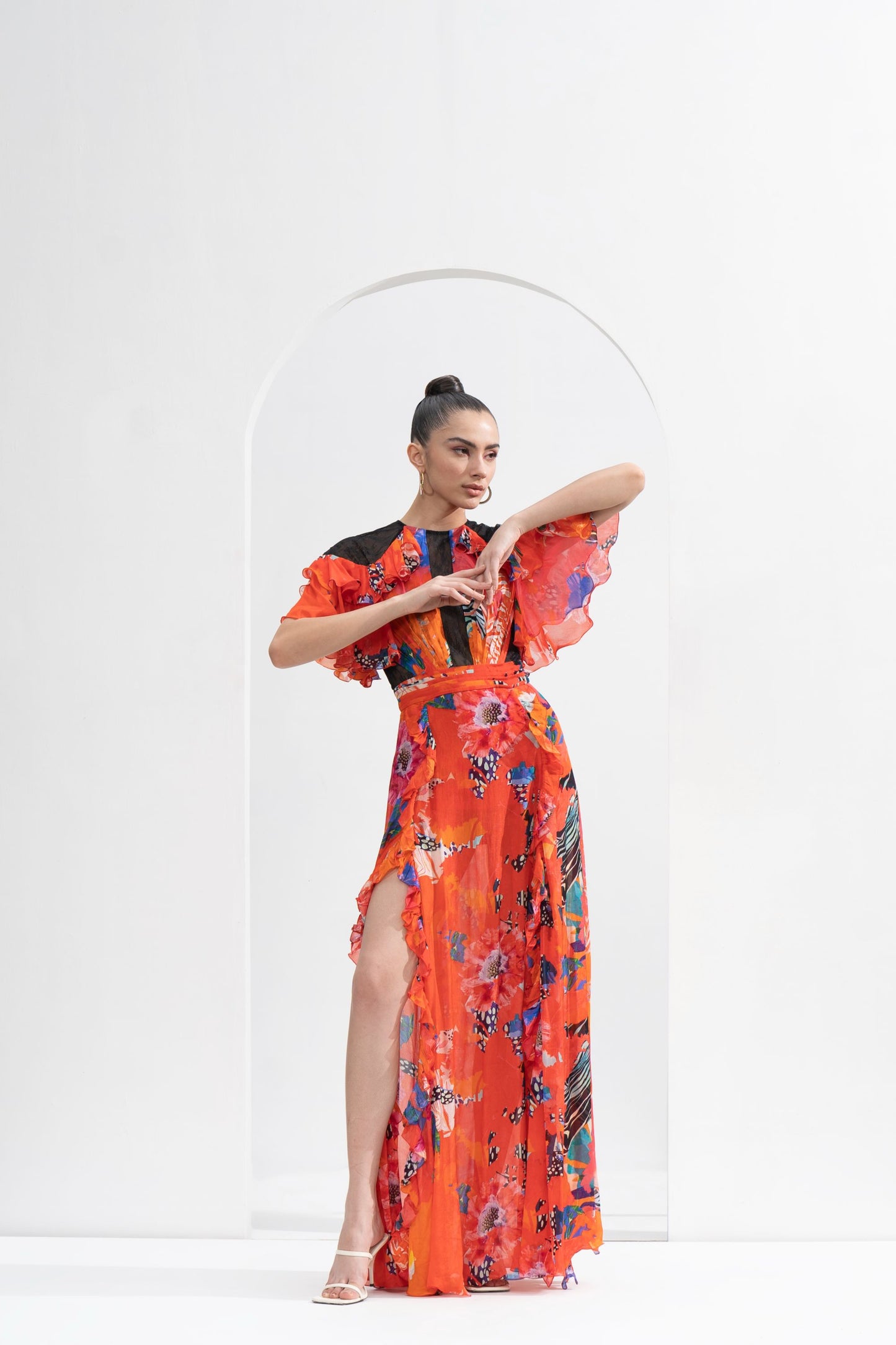 Crafted From Delicate Chiffon, This Red Garden-Printed Dress Drapes Gracefully, Creating A Flowy Silhouette. It Features A Captivating Floral Motif And Intricate Chantley Detailing On The Bodice. The Pleated Bodice Enhances The Dress'S Structure And Adds A Flattering Touch To Your Figure.