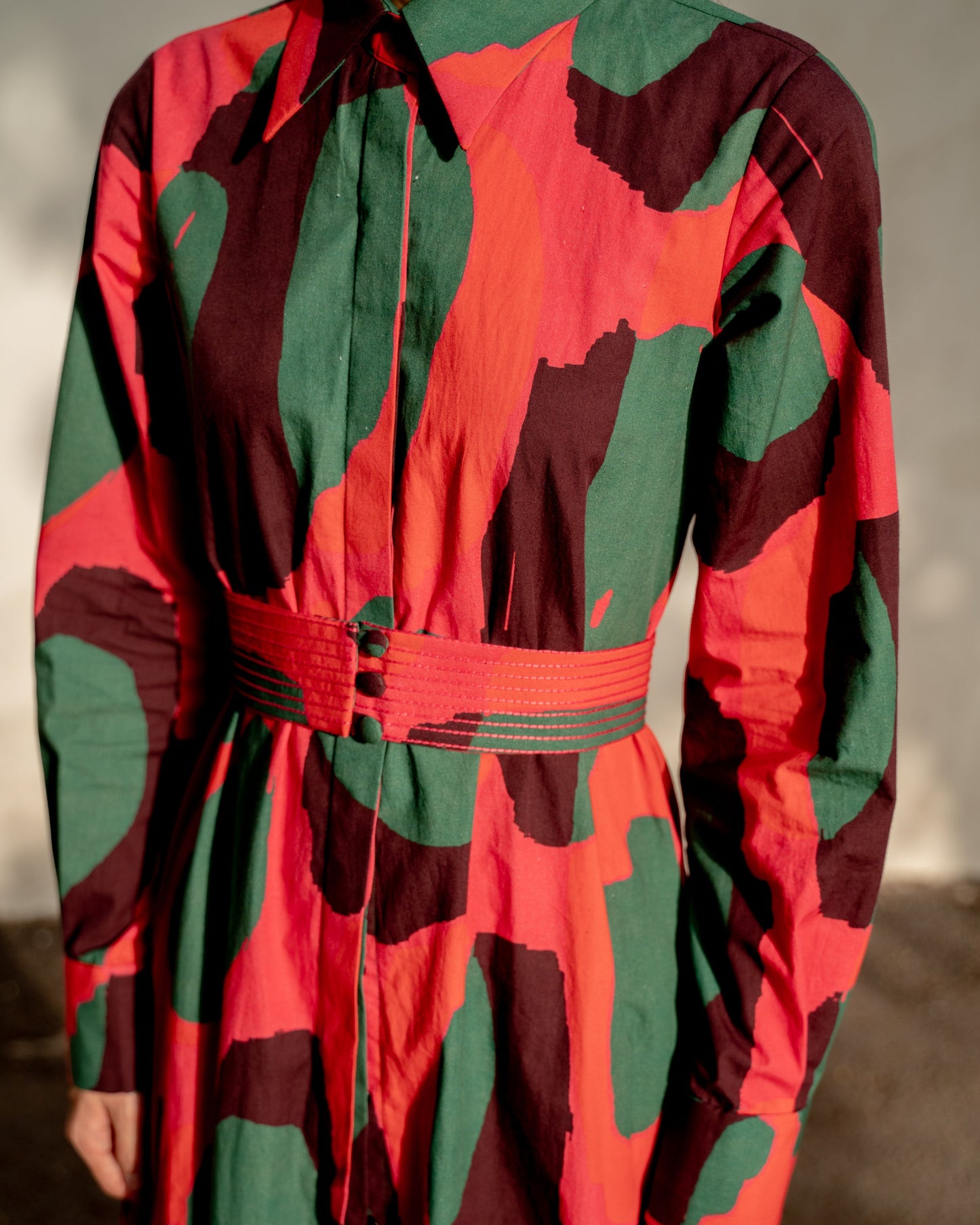 Red, Green And Black Shirt Dress Based On Poplin Cotton Feature Abstract Print. It Is Paired With A Printed Belt.