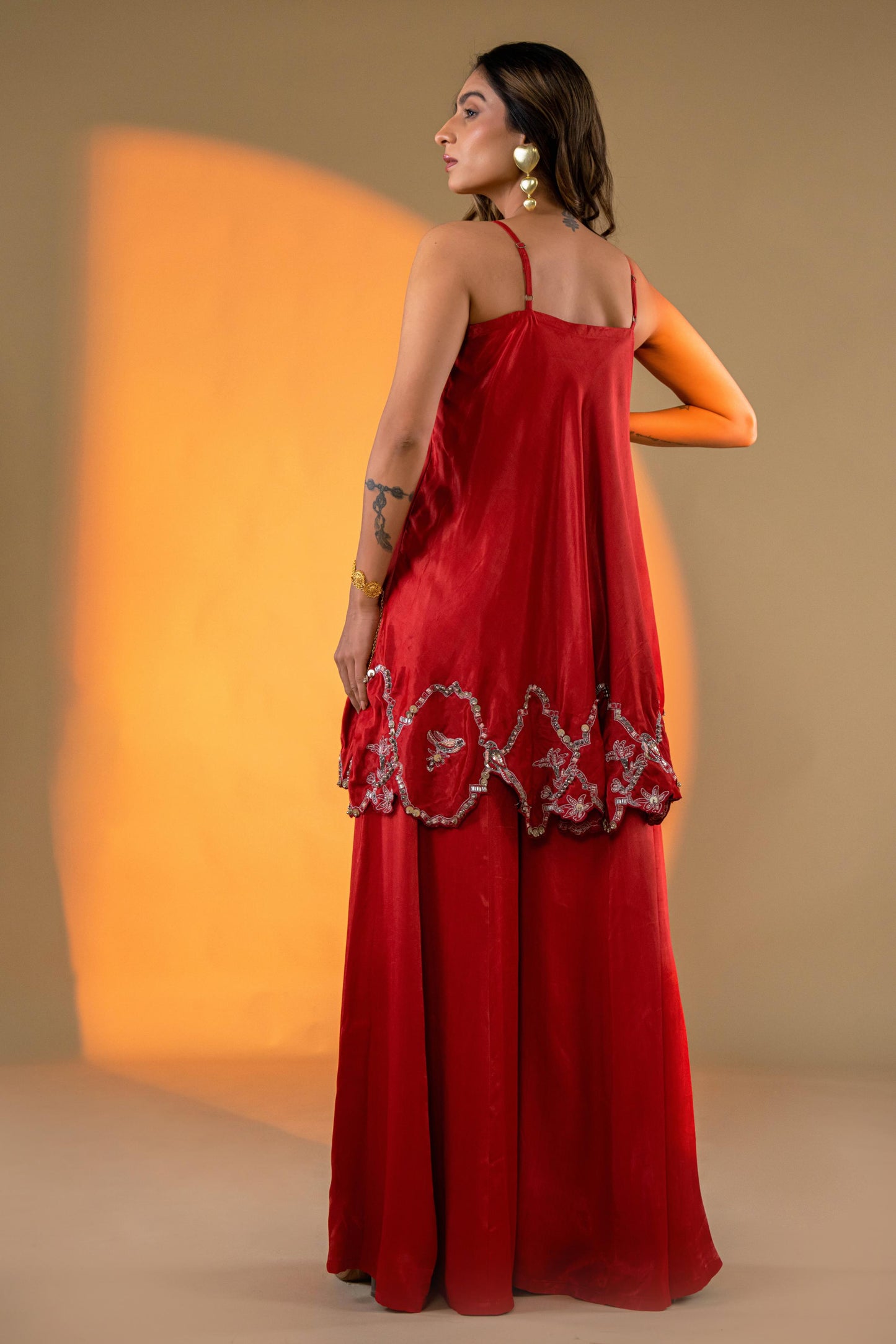 Brighten Up Your Style With This Red Kurta Set. The Kurta Features Cut Sleeves And Intricate Embroidery, Beautifully Paired With A Flowing Sharara. Ideal For Adding A Vibrant Touch Of Elegance To Any Occasion.