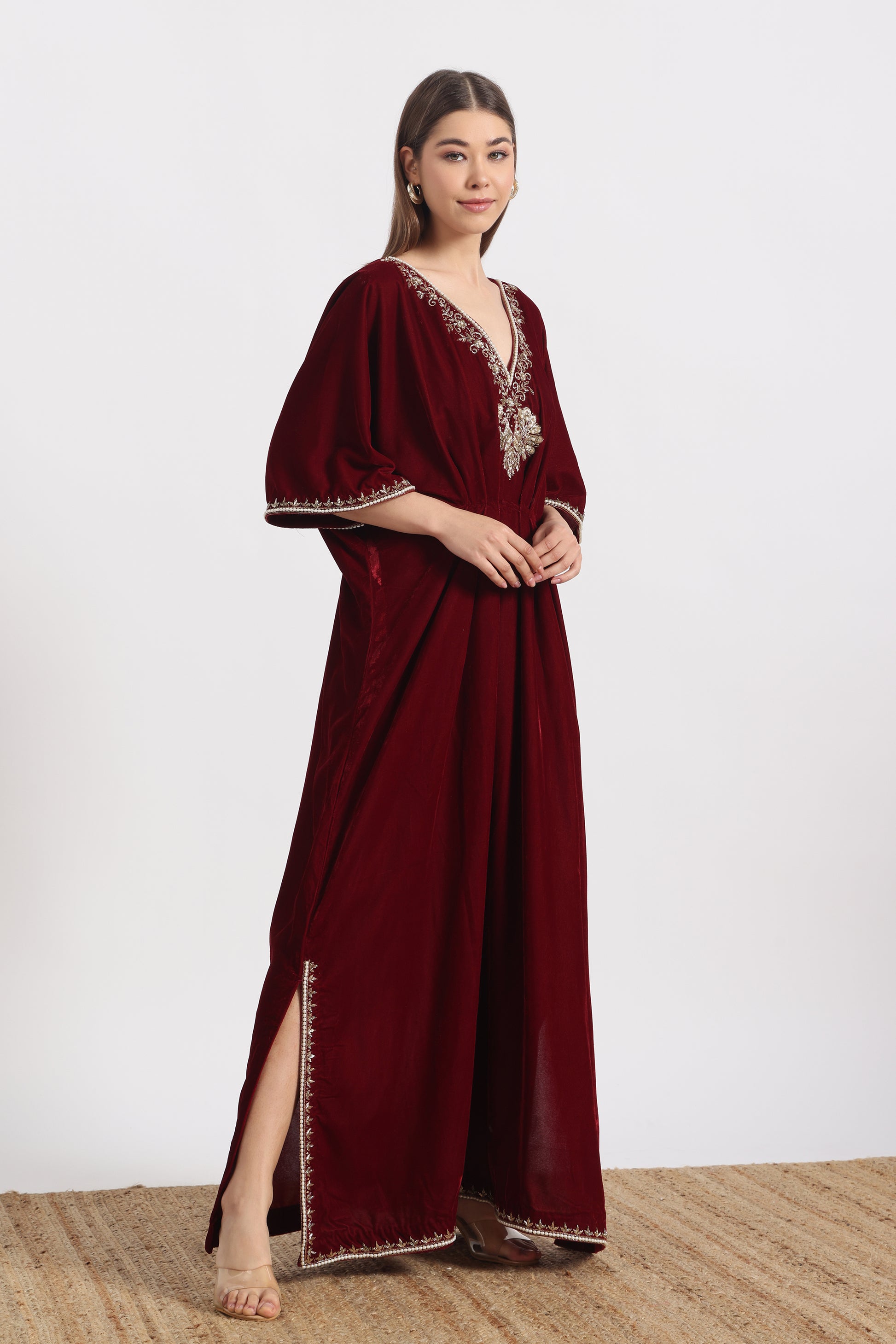 Deep Maroon Velvet Kaftan With Antique Gold Zari Embroidery And Pearl-Detailed Neckline. Features Twin Peacock Motifs And Gathered Pleats. Festive, Elegant, And Flattering For All Body Types.
