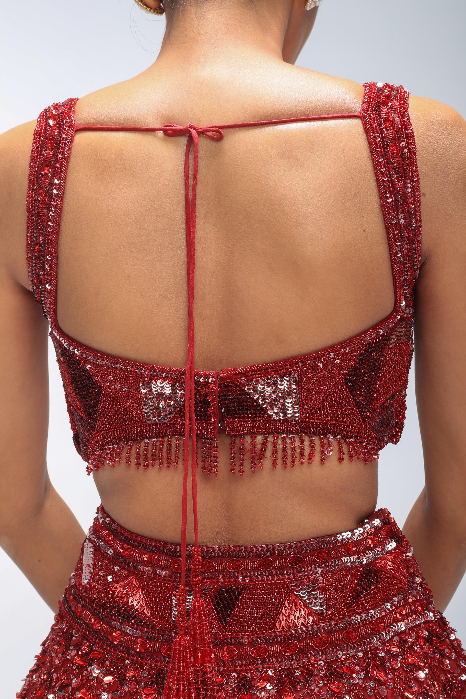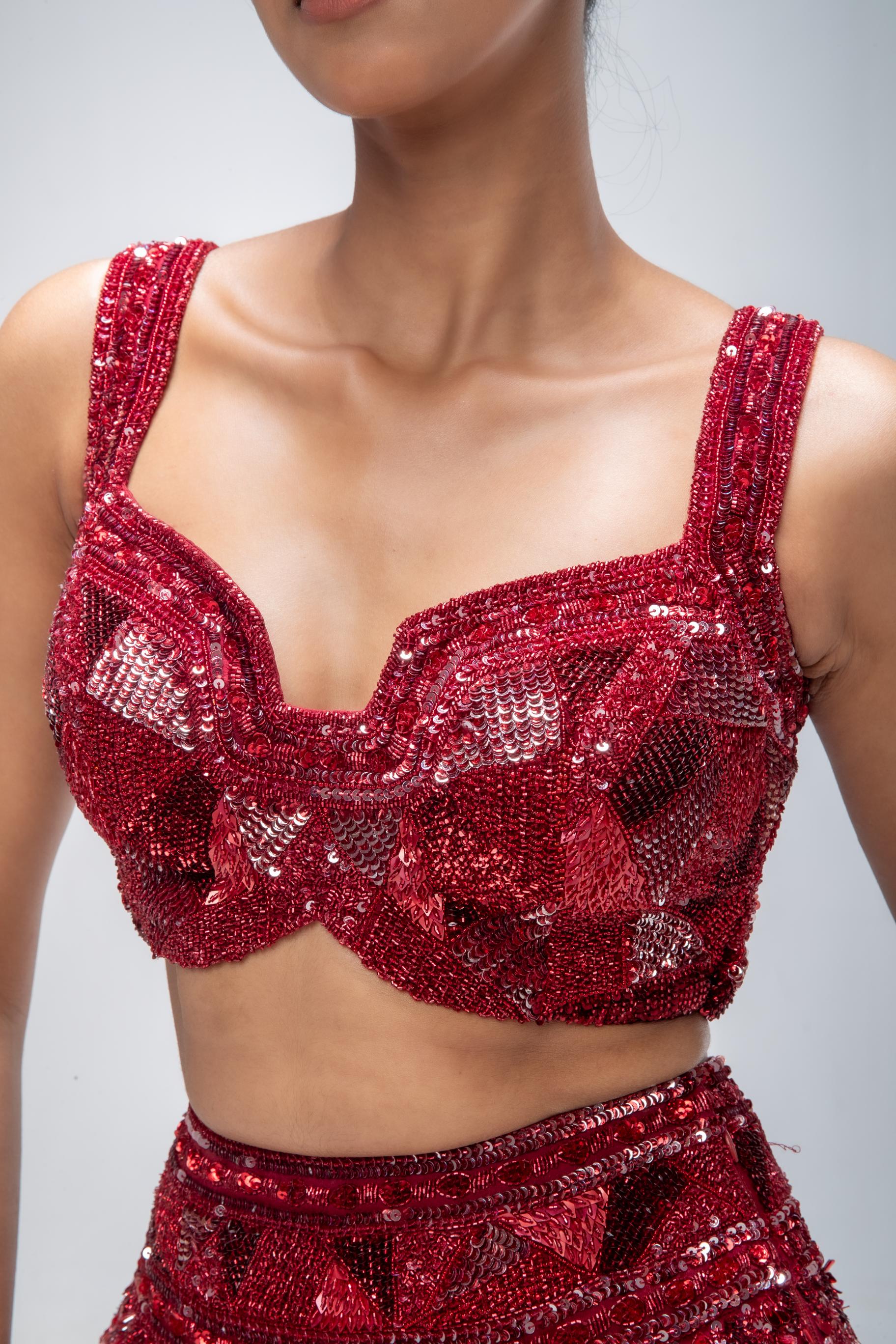 Ruby Red Lehenga Embellished With Sequin Work And Paired With Embroidered Blouse And Dupatta.