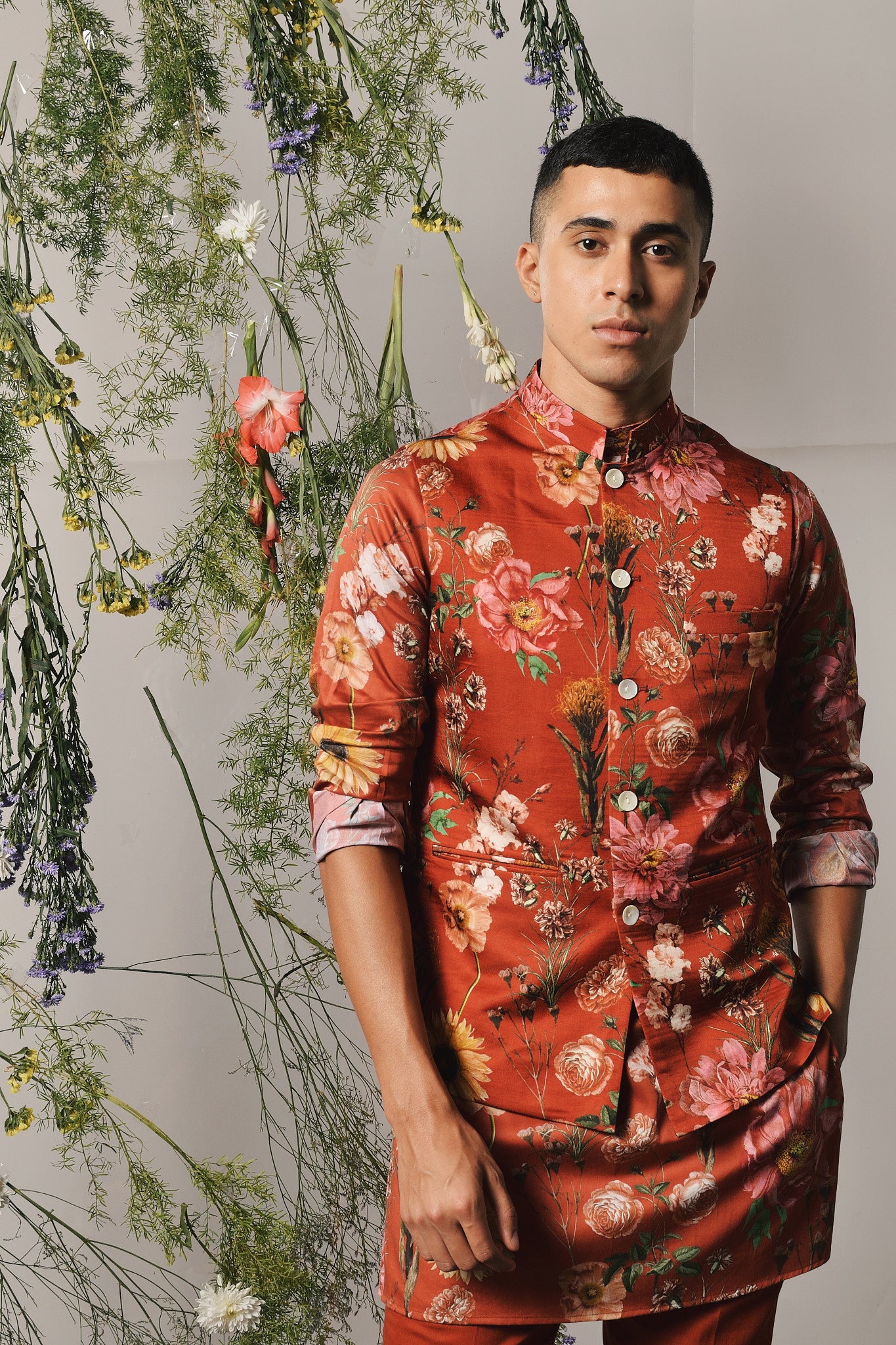 Floral Print Bandi Constructed With A Rich Linen Satin Fabric. This Bandi Features Laser Cut Mother Of Pearl Shell Buttons, A Mandarin Collar, One Chest Pocket And Two Hip Pockets.