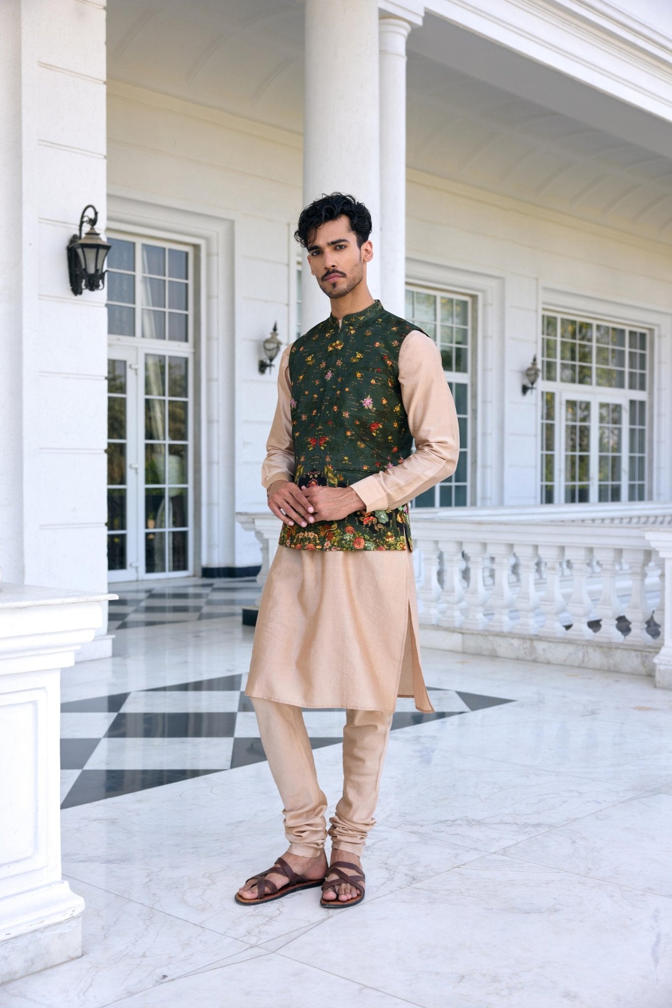 Take A Festive Notch In Stylish Rehyan Bandi Set Adorned With A Vintage Floral Design And Intricate Textured Thread Work, Paired With A Coordinating Kurta And A Perfectly Matched Churidar. This Ensemble Is The Ultimate Choice To Achieve A Refined, Contemporary Indian Look.