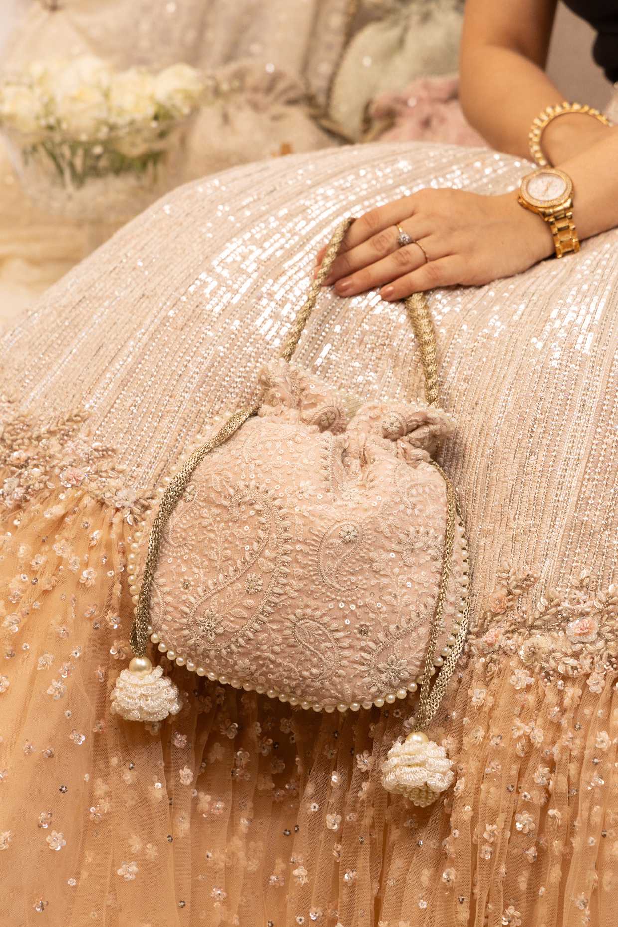 The Charming Crochet Pearl Tassels Gives A Graceful And Sophisticated Finish. Spacious Yet Stylish, It Is Perfect For Carrying Your Essentials While Complementing Your Attire. Whether For Weddings, Parties, Or Special Celebrations, This Potli Bag Is A Must-Have Addition To Your Accessory Collection.