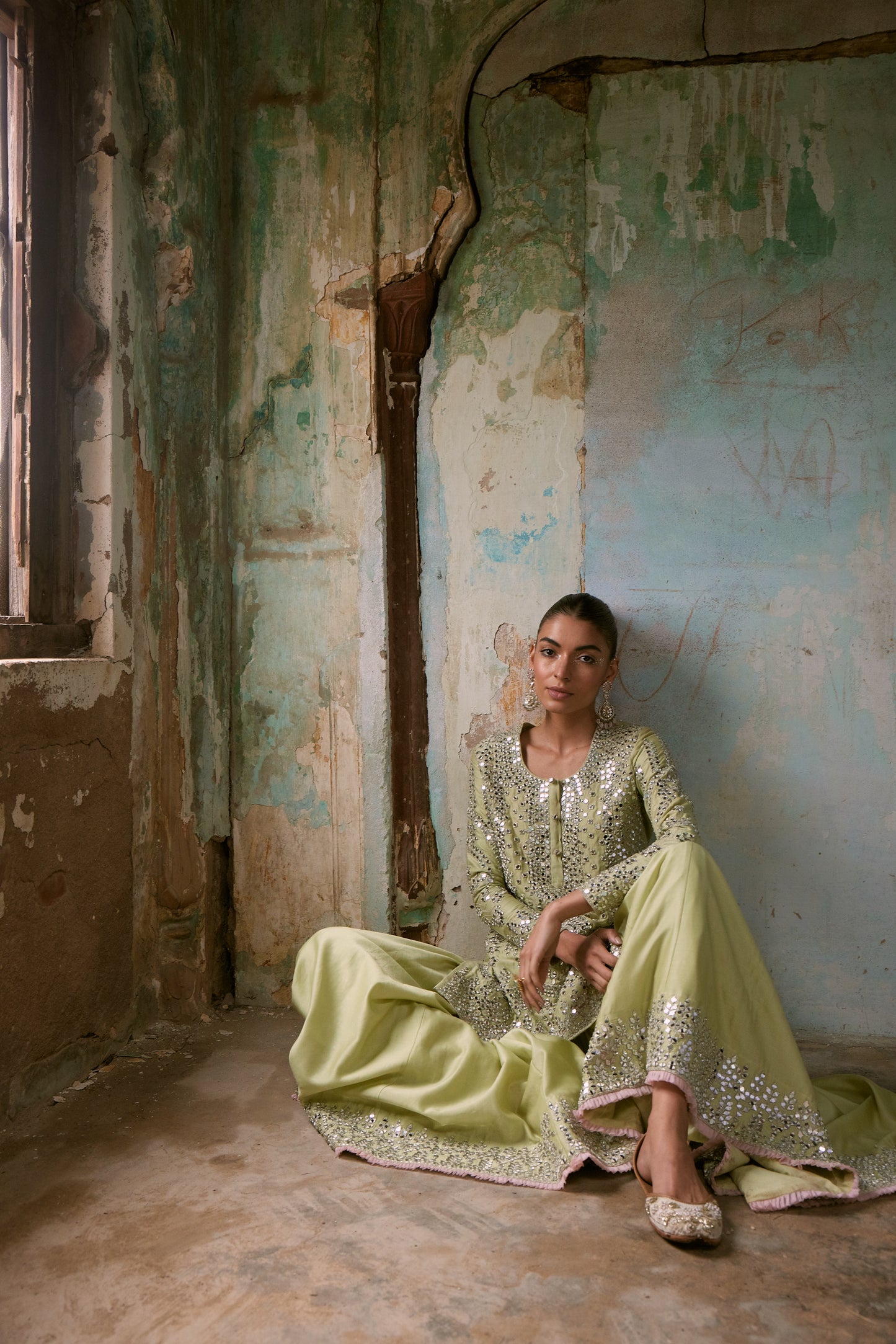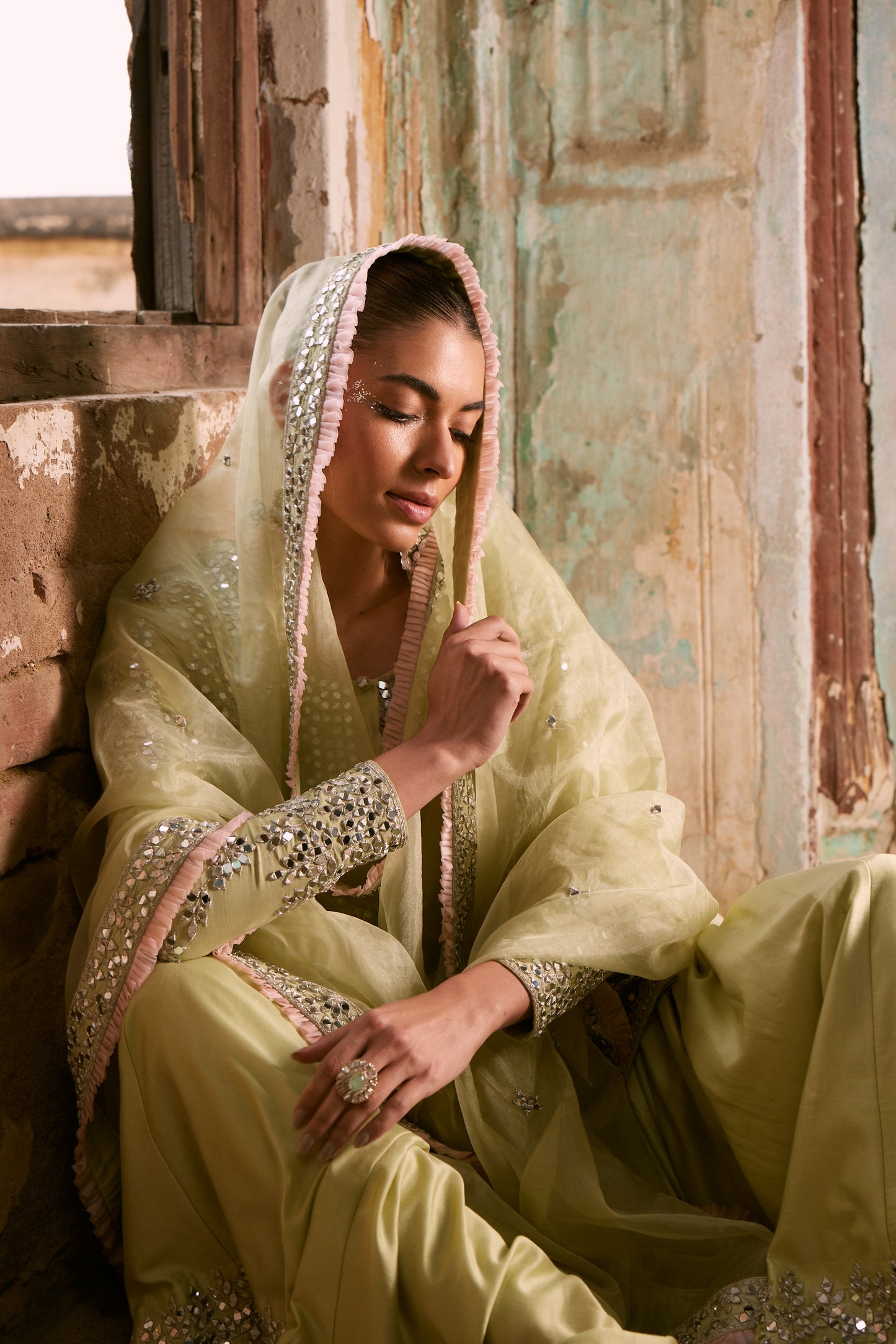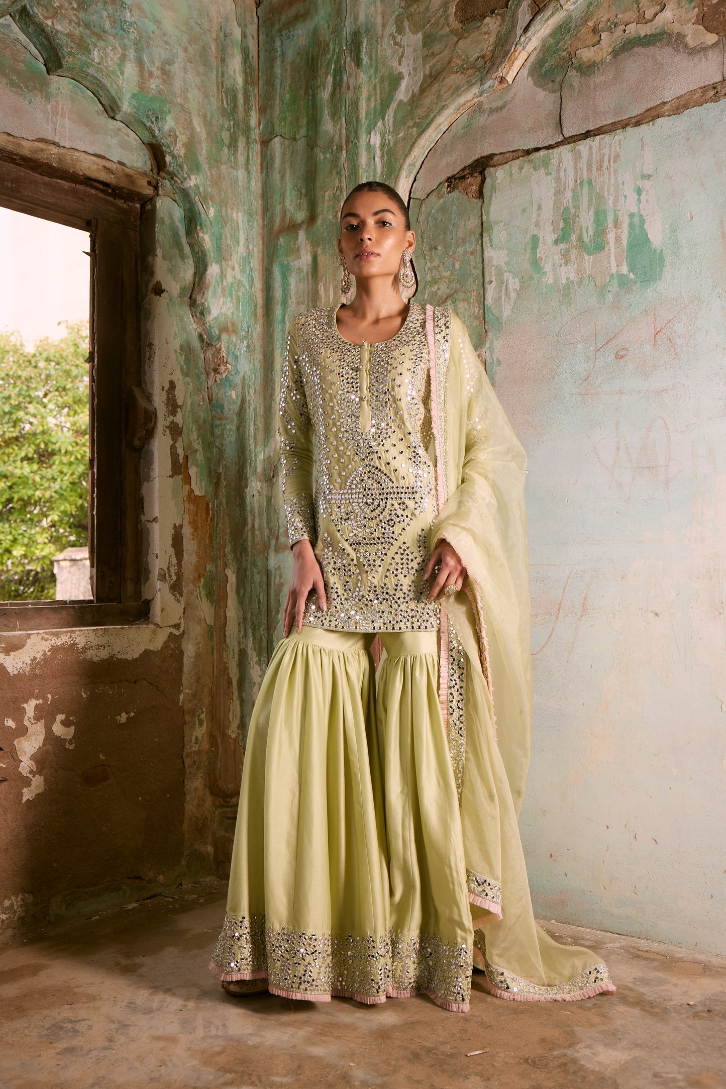 The Ridhi Sharara Ensemble Is A Captivating Showcase Of Timeless Elegance, Draped In A Serene Pista Green Hue. Crafted From Delicate Chanderi Fabric, Both The Kurta And Sharara Are Adorned With Heavy Thread And Mirror Embroidery, Creating A Mesmerizing Display Of Opulence And Craftsmanship. The Sheer Organza Dupatta Is A True Work Of Art, Featuring Intricate Embroidery That Harmoniously Complements The Kurta And Sharara, Adding A Layer Of Grace And Finesse. To Complete This Exquisite Ensemble, The Ridhi Sharara Includes A Matching Potli Bag, Providing A Final Touch Of Finesse And Completeness.