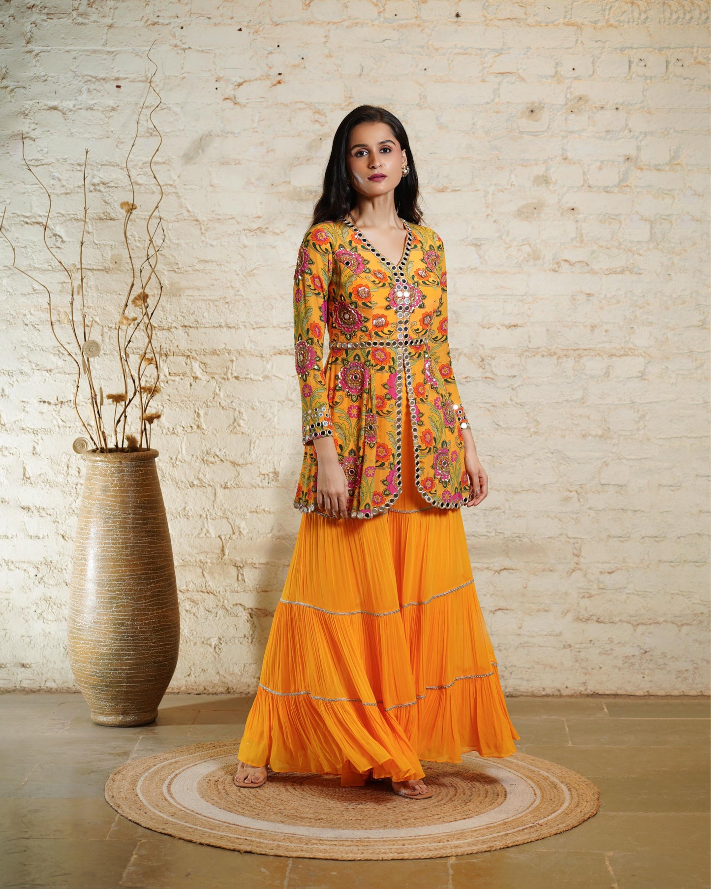 The Rooh Yellow Sharara And Peplum Set Is A Bright Burst Of Sunshine, Perfect For Festive Occasions. This Radiant Yellow Hue Brings Energy And Cheerfulness To Your Wardrobe. The Sharara’s Graceful Flare And The Peplum Top Create A Stunning, Flattering Shape. The Blend Of Crepe And Georgette Feels Luxurious, While The Sequin, Cut Dana, Crystal, And Mirror Embellishments Provide A Touch Of Sparkle. You’ll Look Radiant And Feel Beautifully Stylish At Any Mehendi, Haldi, Or Festive Event.