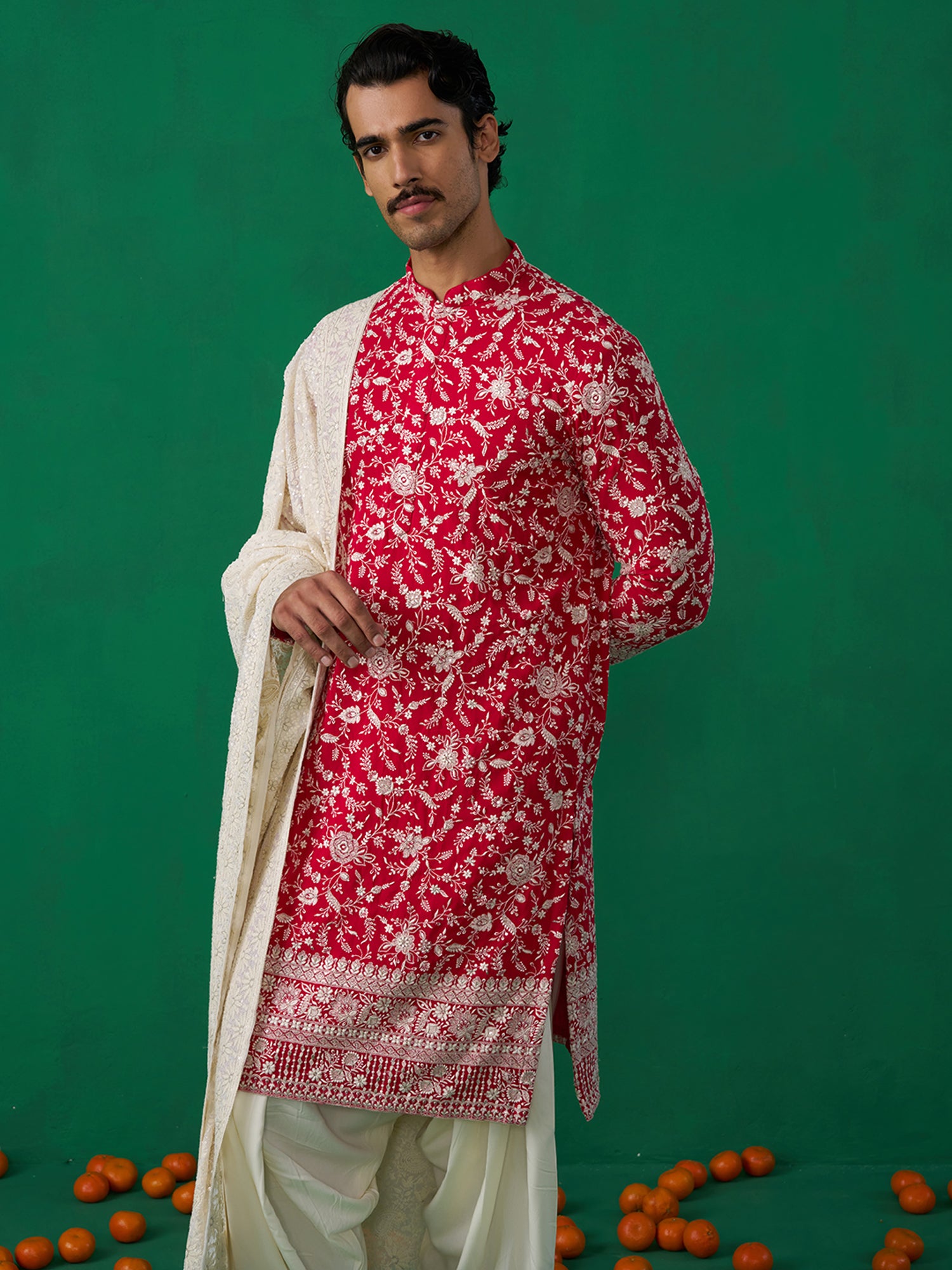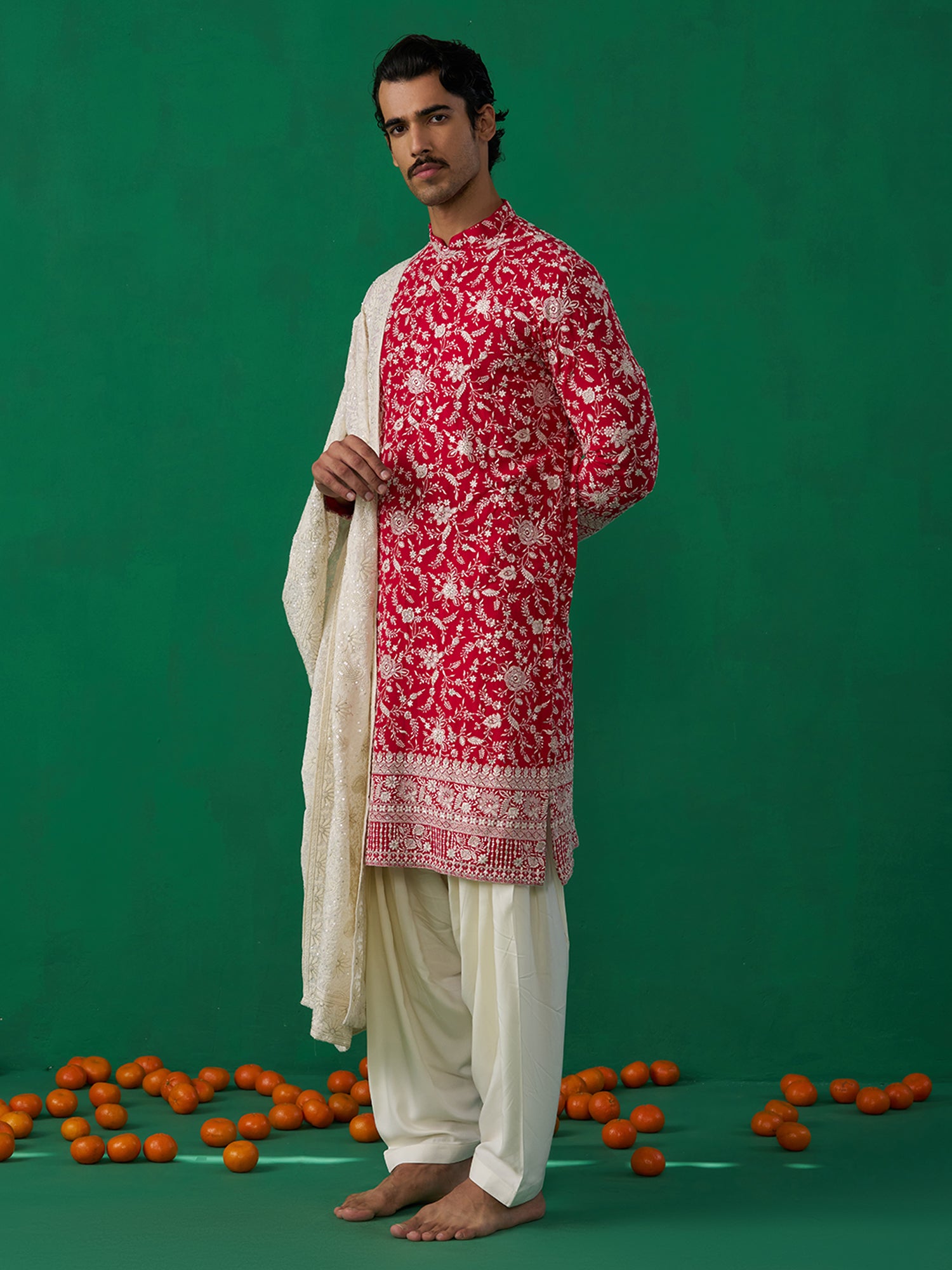 This Kurta Set Features A Long, Straight-Cut Kurta With Intricate All-Over Embroidery And Floral And Rose Inspired Motifs, Paired With Patiyala-Style Bottoms That Add Volume And Comfort To The Silhouette. It Is Styled With A Contrasting Heavy Dupatta, Richly Adorned With Elaborate Embroidered Borders And Detailed Motifs, Bringing A Regal Touch To The Look. The Ensemble Combines Traditional Craftsmanship With A Statement-Making Presence, Perfect For Festive And Ceremonial Occasions.