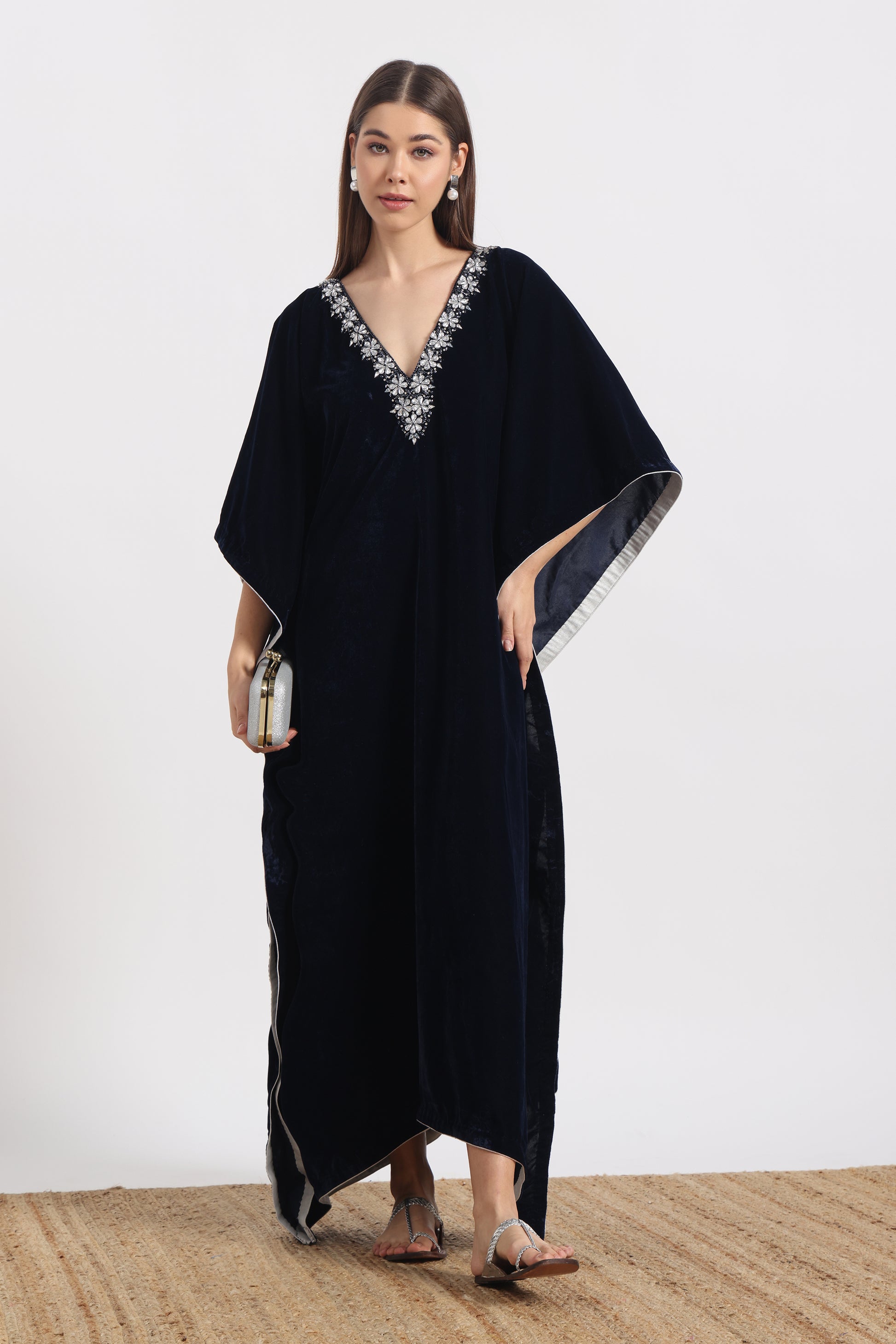 A Luxurious Midnight Blue Velvet Kaftan Adorned With Delicate Crystal Hand Embroidery In Floral Motifs Along The Neckline. Radiates Elegance And Grace — Ideal For Sufi Nights, Festive Evenings, Or Intimate Winter Weddings.