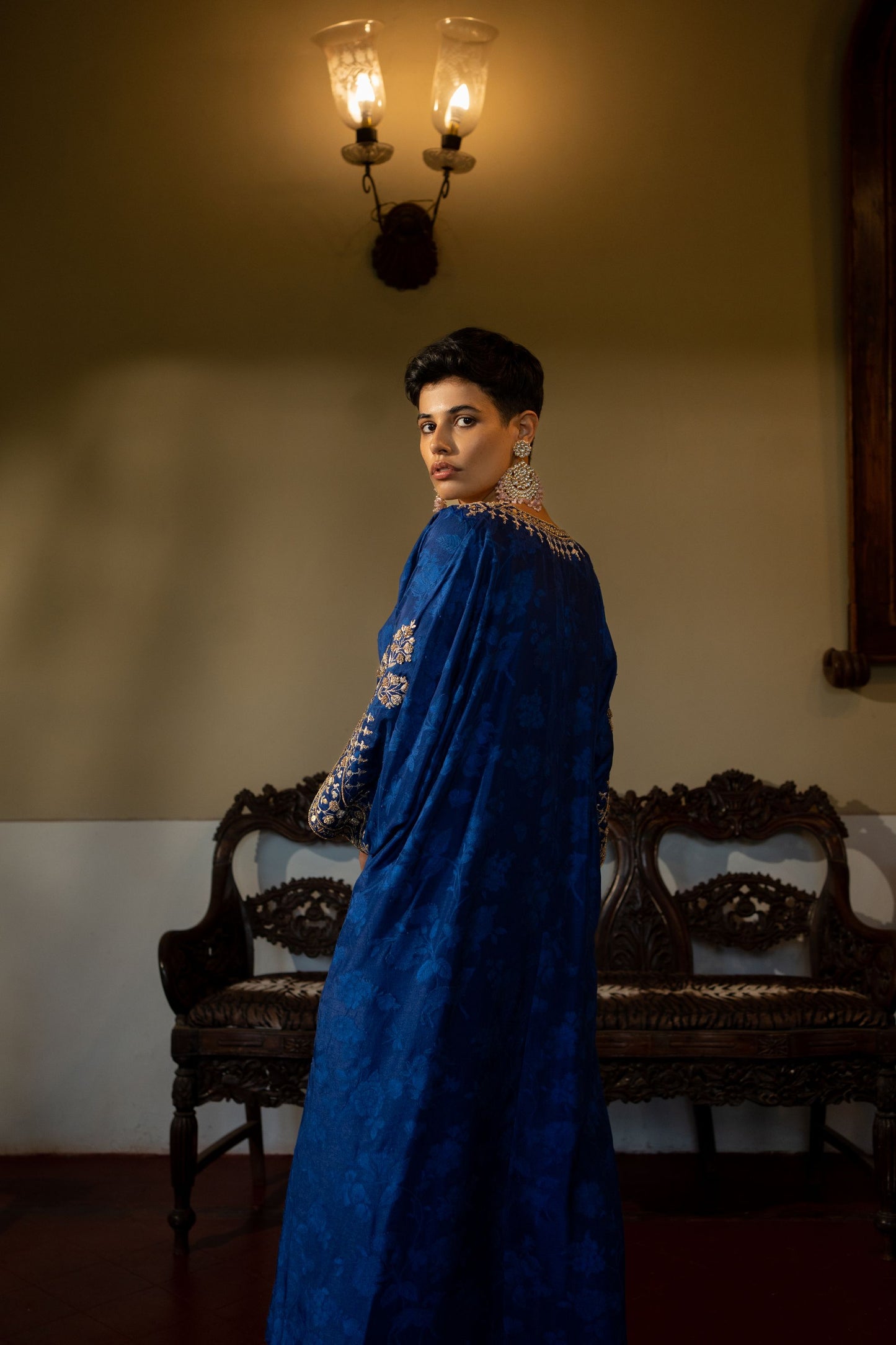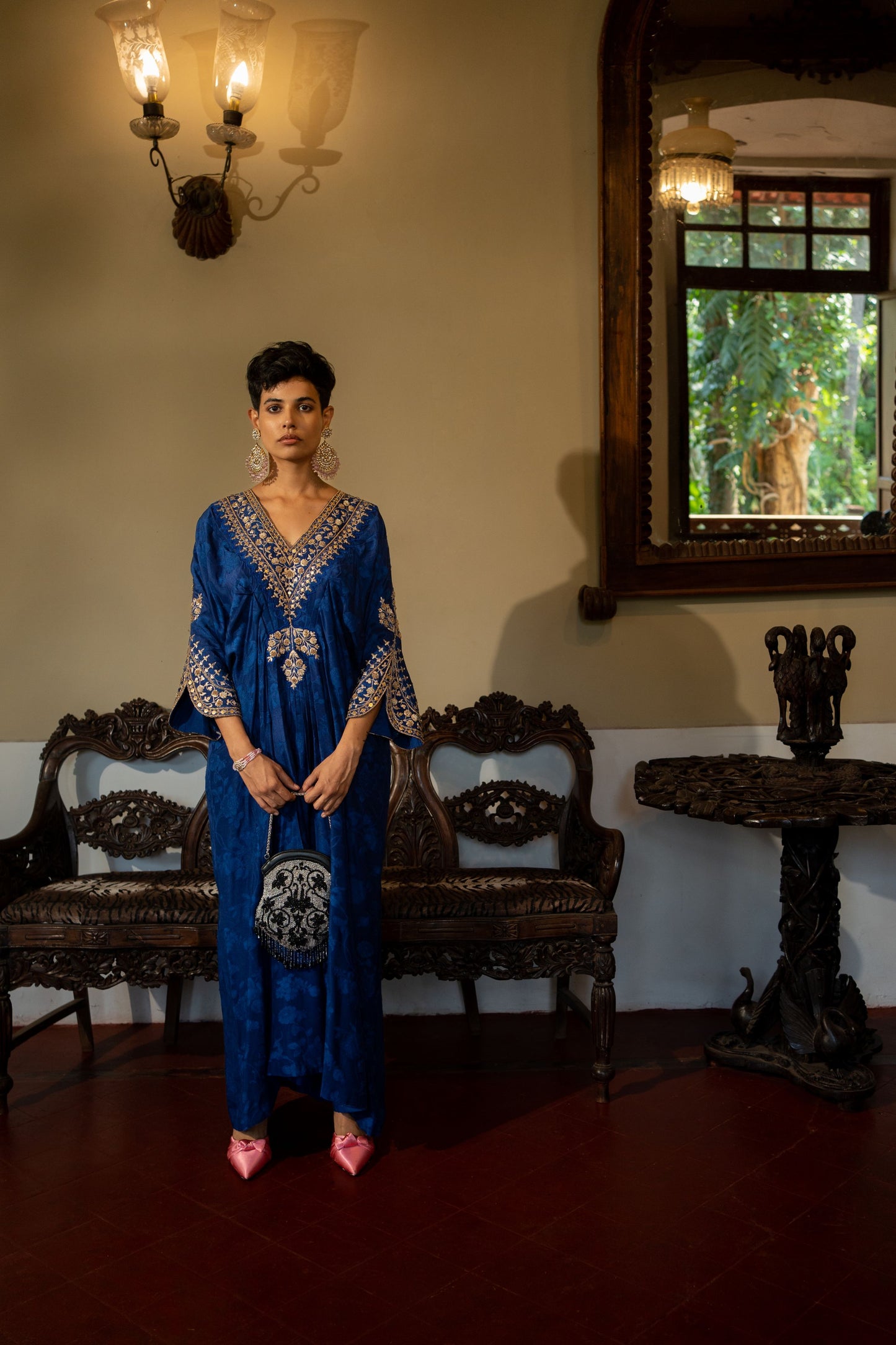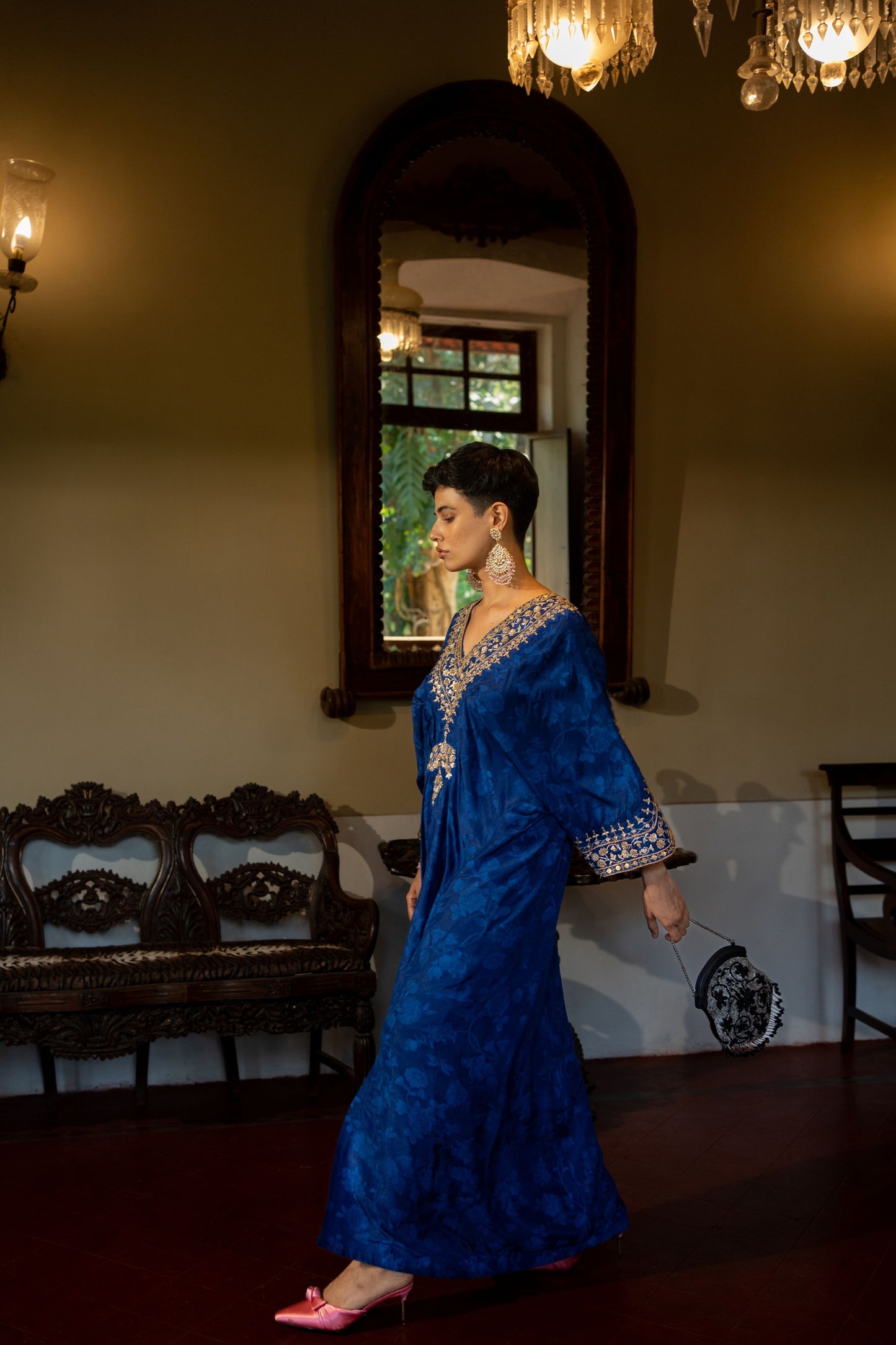 Royal Blue Self–Woven Kaftan Based On Russian Jacquard Features Antique Hand Embroidery On The Yoke And Cuffs.