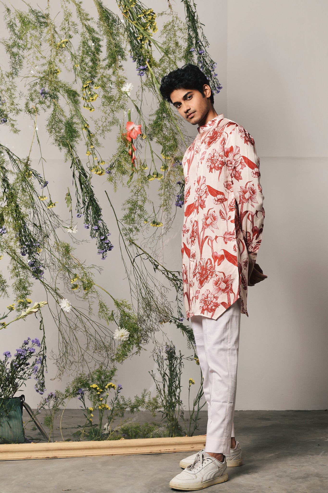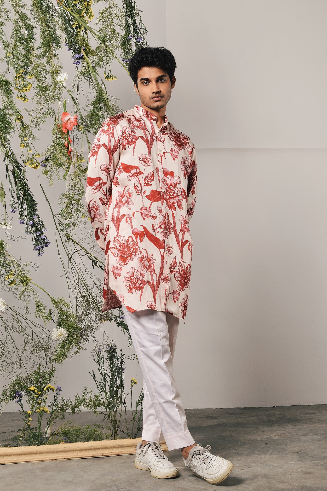 Floral Print Shirt Style Kurta Constructed With A Rich Linen Satin Fabric. This Kurta Comes With A Mandarin Collar, Cuffed Sleeves, Two Hip Pockets On Each Side And Has An Angular Hemline.