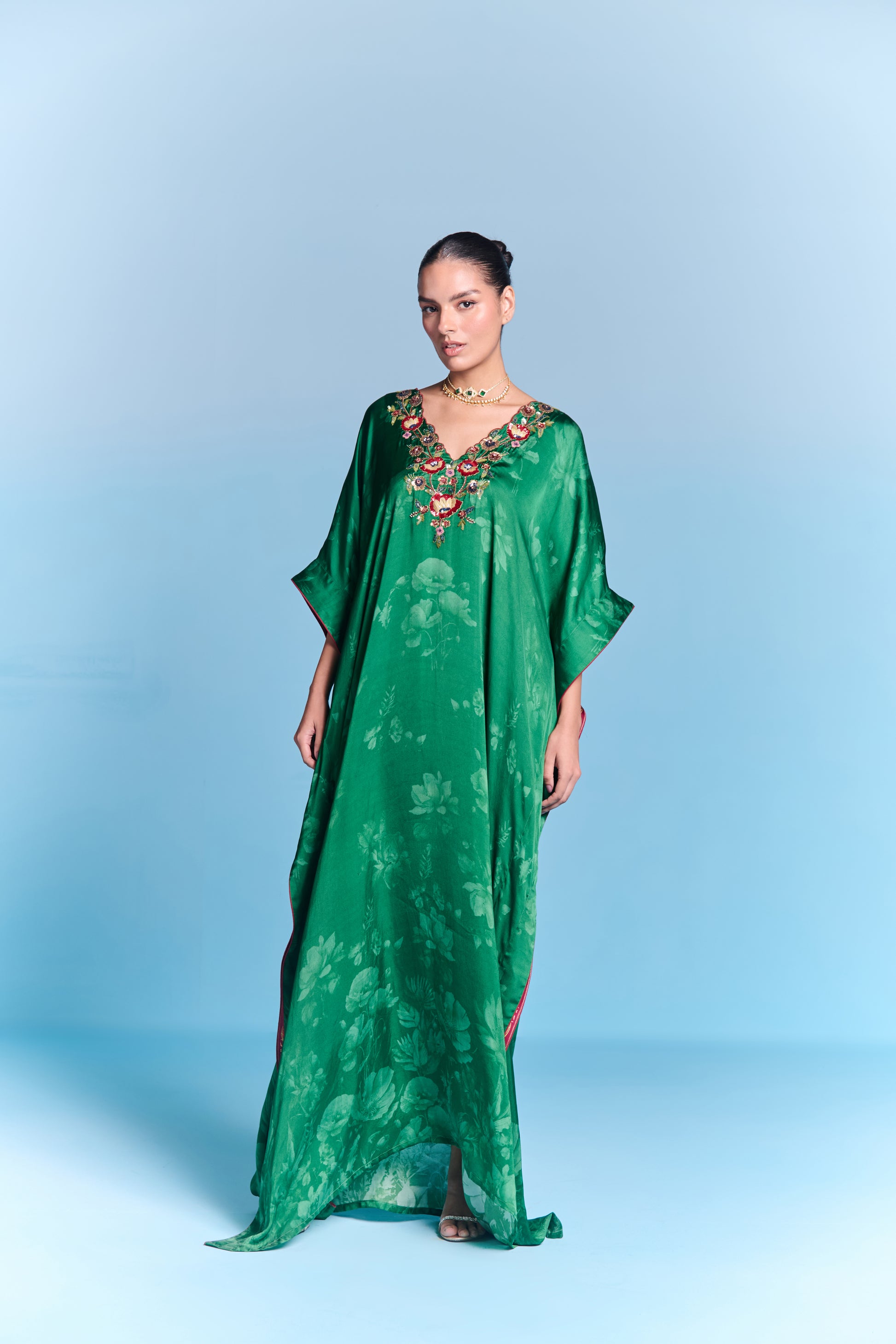 Elevate Your Style With The Vibrant And Seamless Blend Of Tropical Charm And Relaxed Elegance. This Flowy Kaftan With Its Wide Sleeves Gives Effortless Sleek Look. It Has V Shaped Neckline With Intricate Narration. Adorned With Handwork Embroidery And Contrast Detailing On The Sleeves. Perfect For Summer Style Statement Look.
