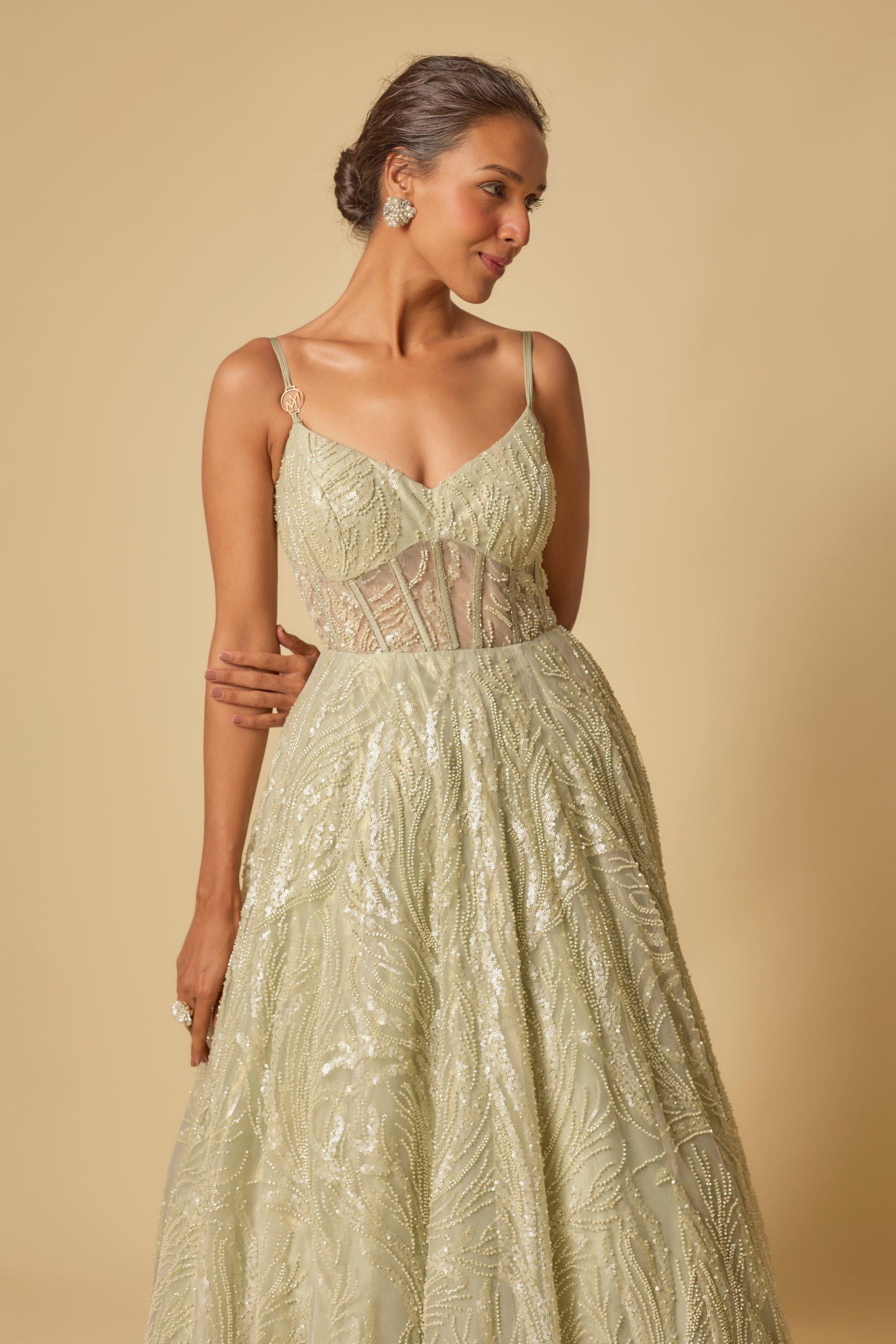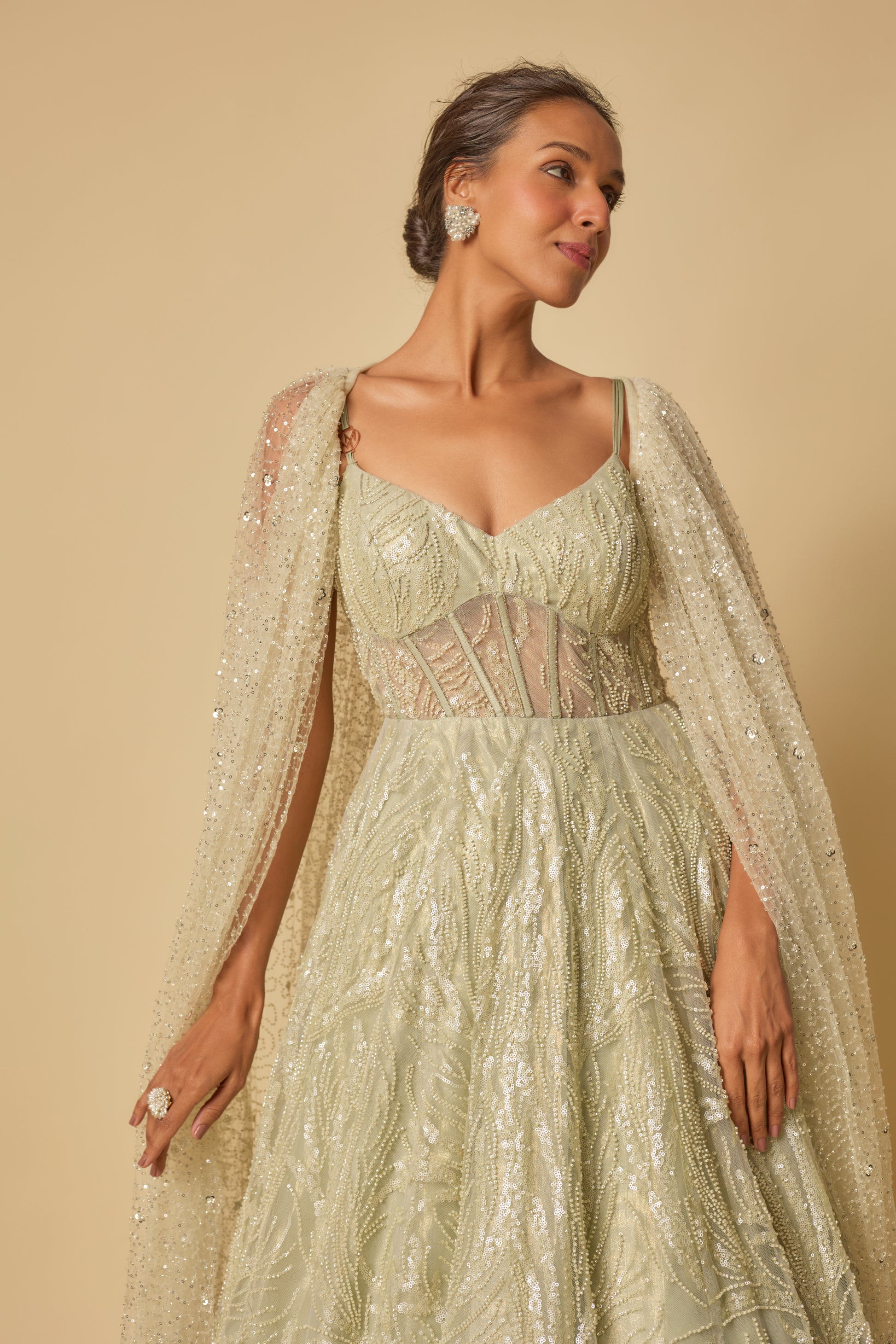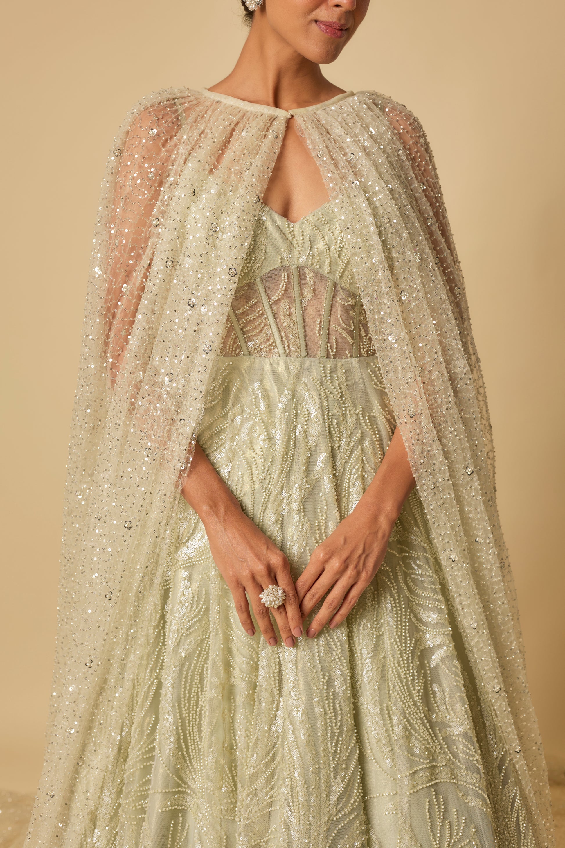 Featuring Sage Green Heavy Embroidered Gown In Tulle With Fully Embroidered Long Trail Cape.