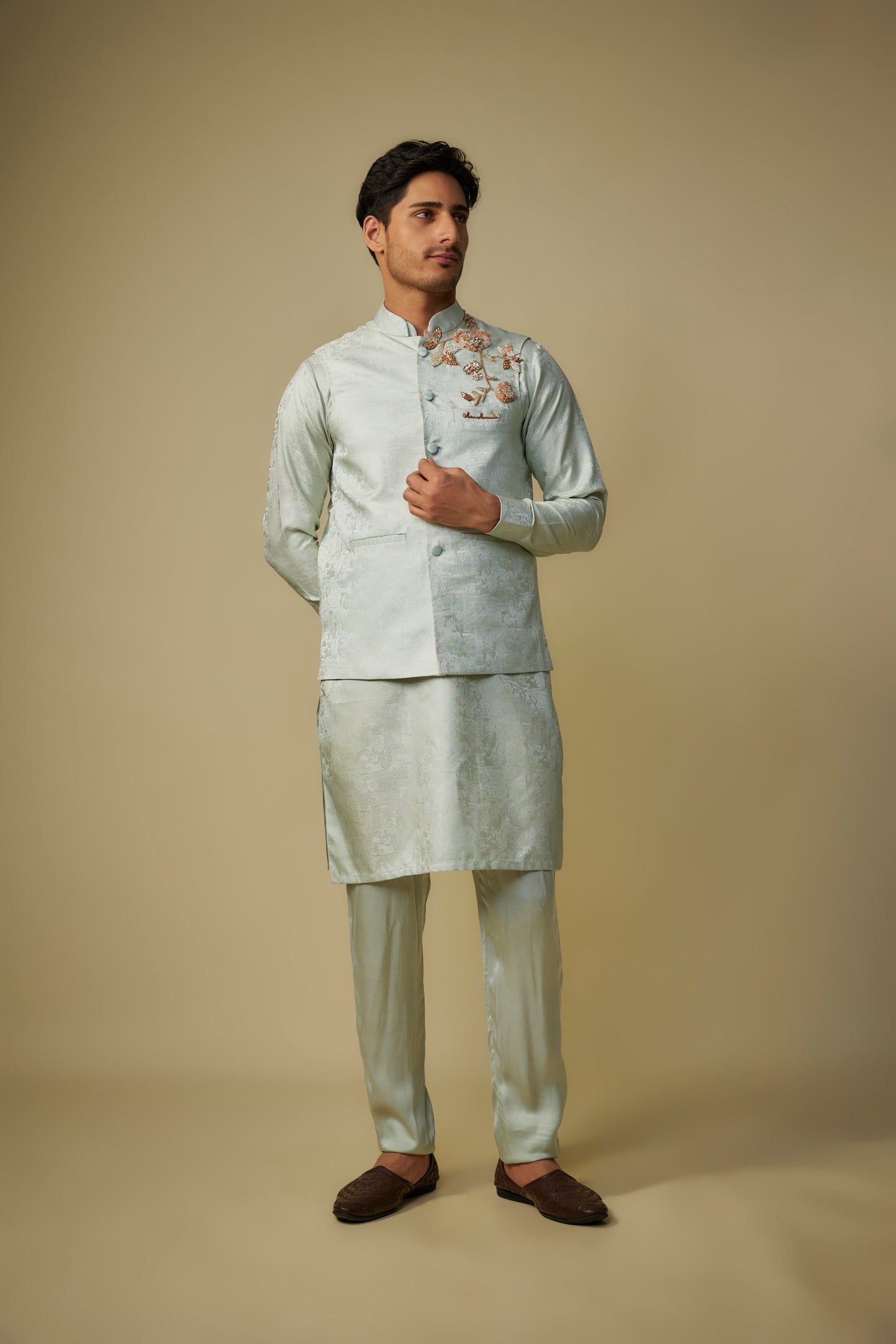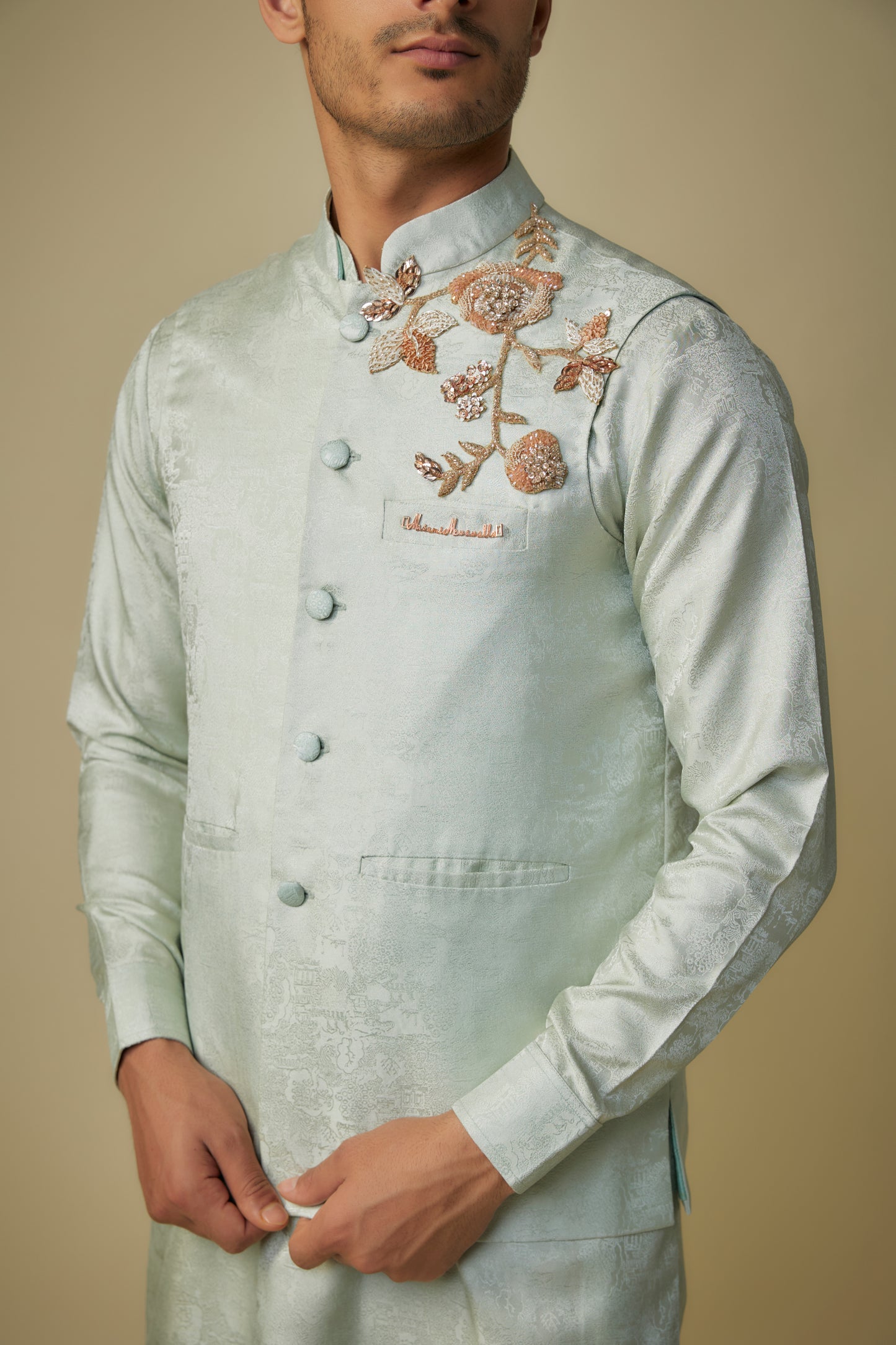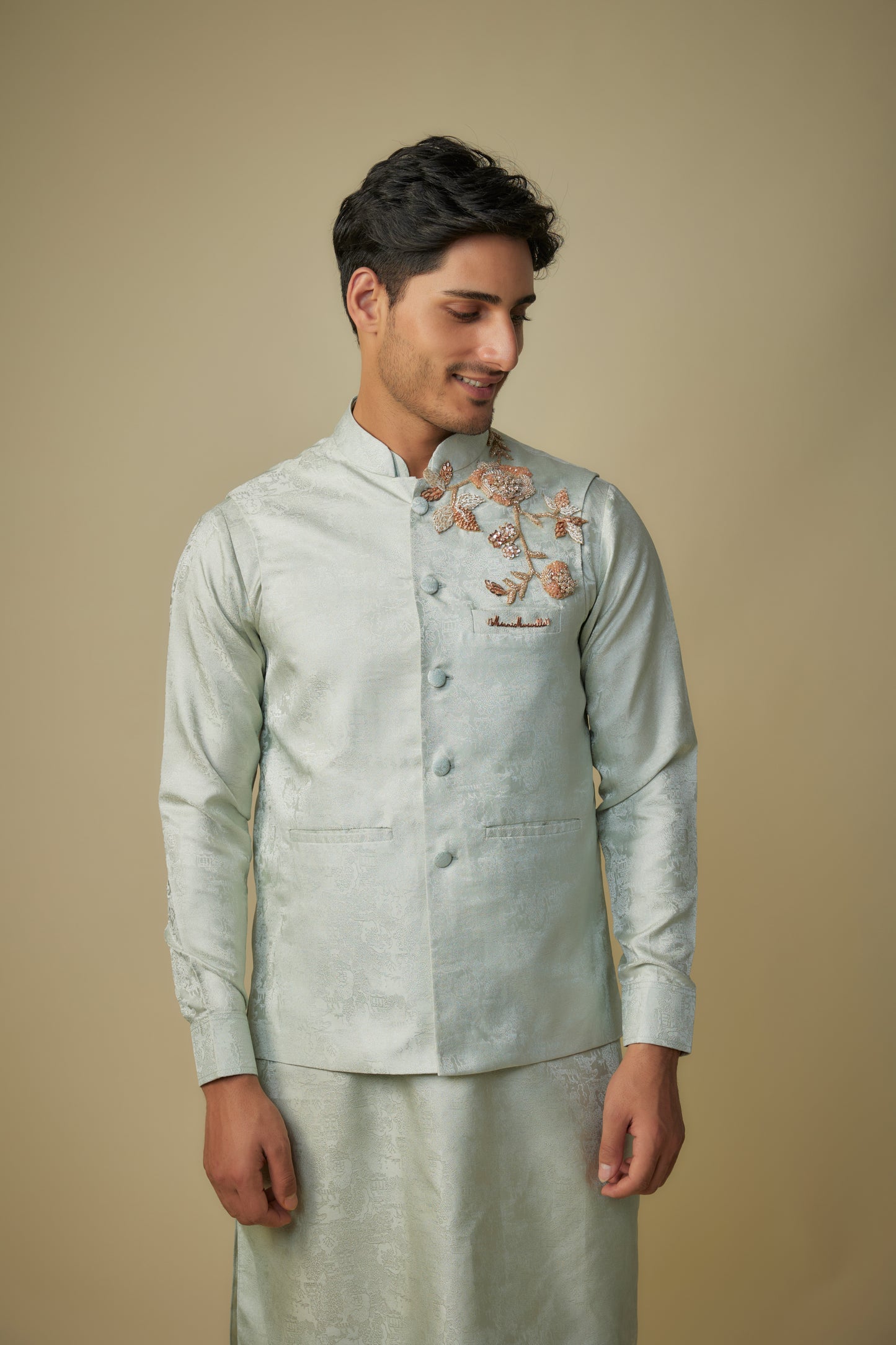 Featuring Sage Green Jacquared Bundi With Kurta With Mashroo Pant.