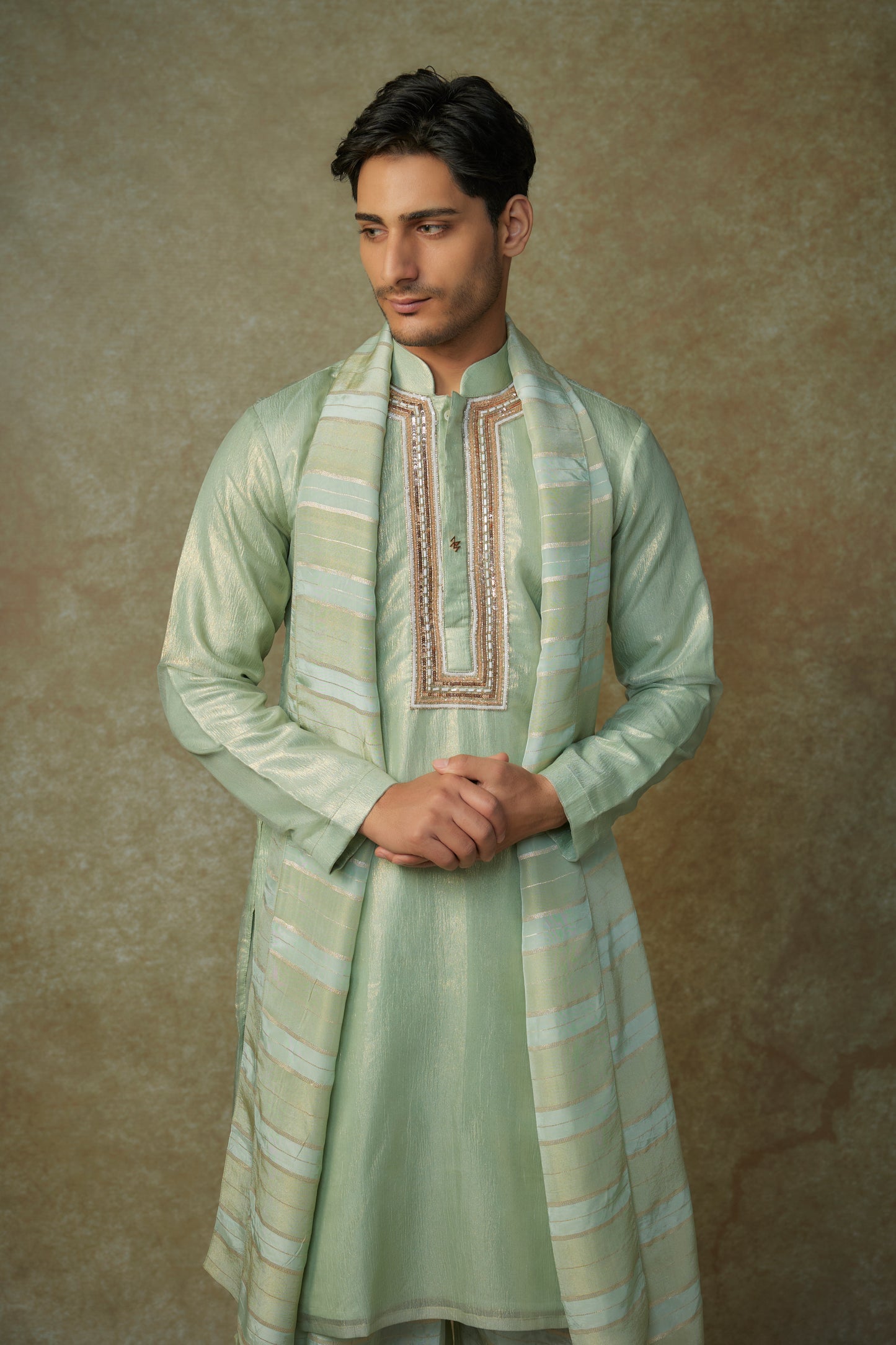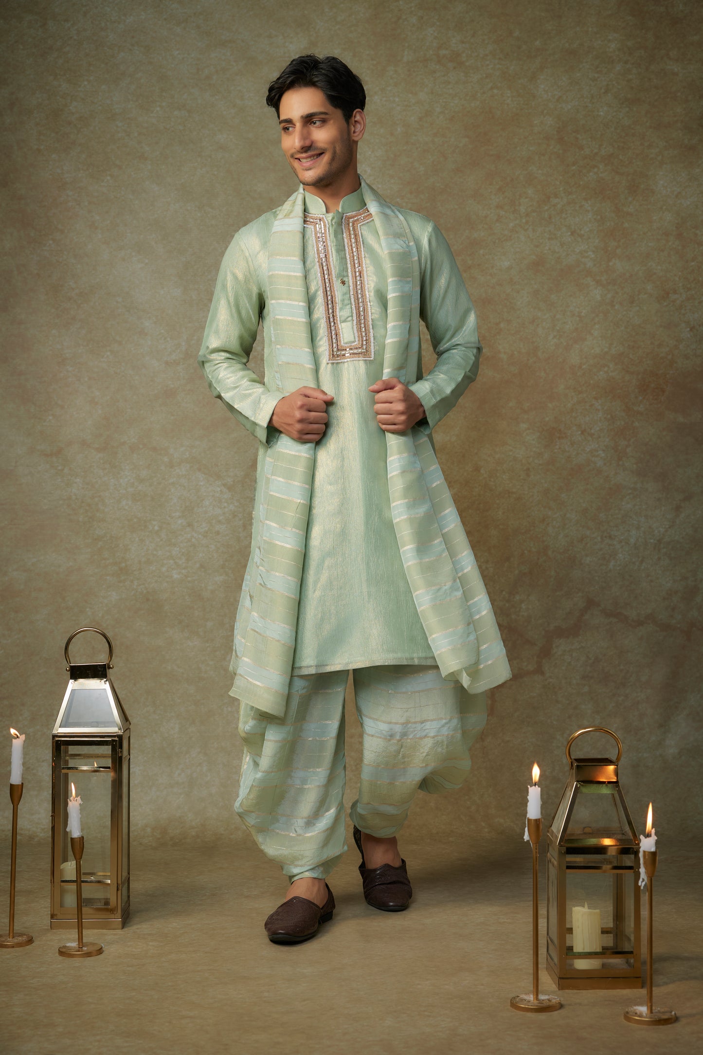 Featuring Sage Green Tissue Embroidered Kurta With Tissue Stripe Dhoti And Dupatta.