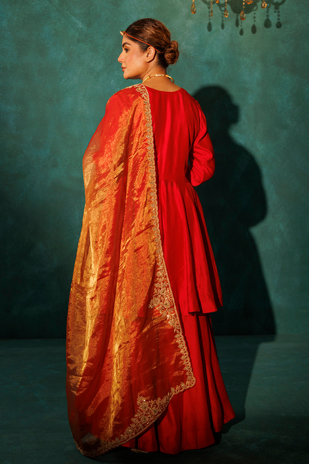 "Commanding Attention In A Vibrant Red, Crafted In Finest Silk, This Gharara Set Is Ideal For All You Celebratory Soirees.
