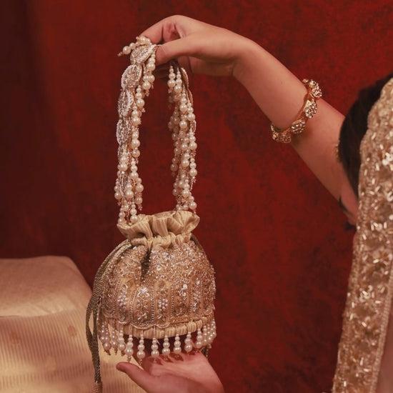 Elevate Your Ethnic Ensemble With Our Exquisite Sajni Pearl Embroidered Mini Potli, Crafted From Luxurious Poly Silk Brocade In A Subtle Yet Sophisticated Gold Hue. The Entire Body Is Adorned With Intricate Pearl Work, Giving It A Rich, Regal Texture. A Delicate Pearl Fringe Lace At The Bottom Adds Movement And Charm, While The Handle Crafted From Pearls Lends A Modern, Luxe Touch. Finished With Elegant Pearl Tassels, This Potli Is The Perfect Statement Accessory For Weddings, Festive Occasions, And Celebrations. The Soft Color Along With Its Craftsmanship Makes It Stand Out With Effortless Grace.