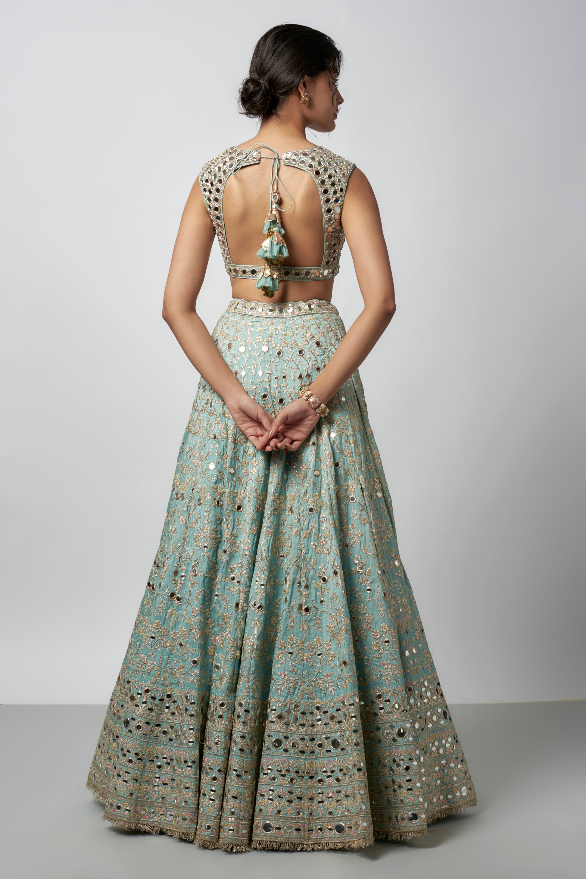 This Dreamy Lehenga Set Features A Hand Embroidered V-Neck Blouse With Intricate Mirror Work And Voluminous Lehenga Embroidered With Threadwork. Paired With Organza Dupatta With Mirror Detail Along The Border And Subtle Accents, Adding Charm.