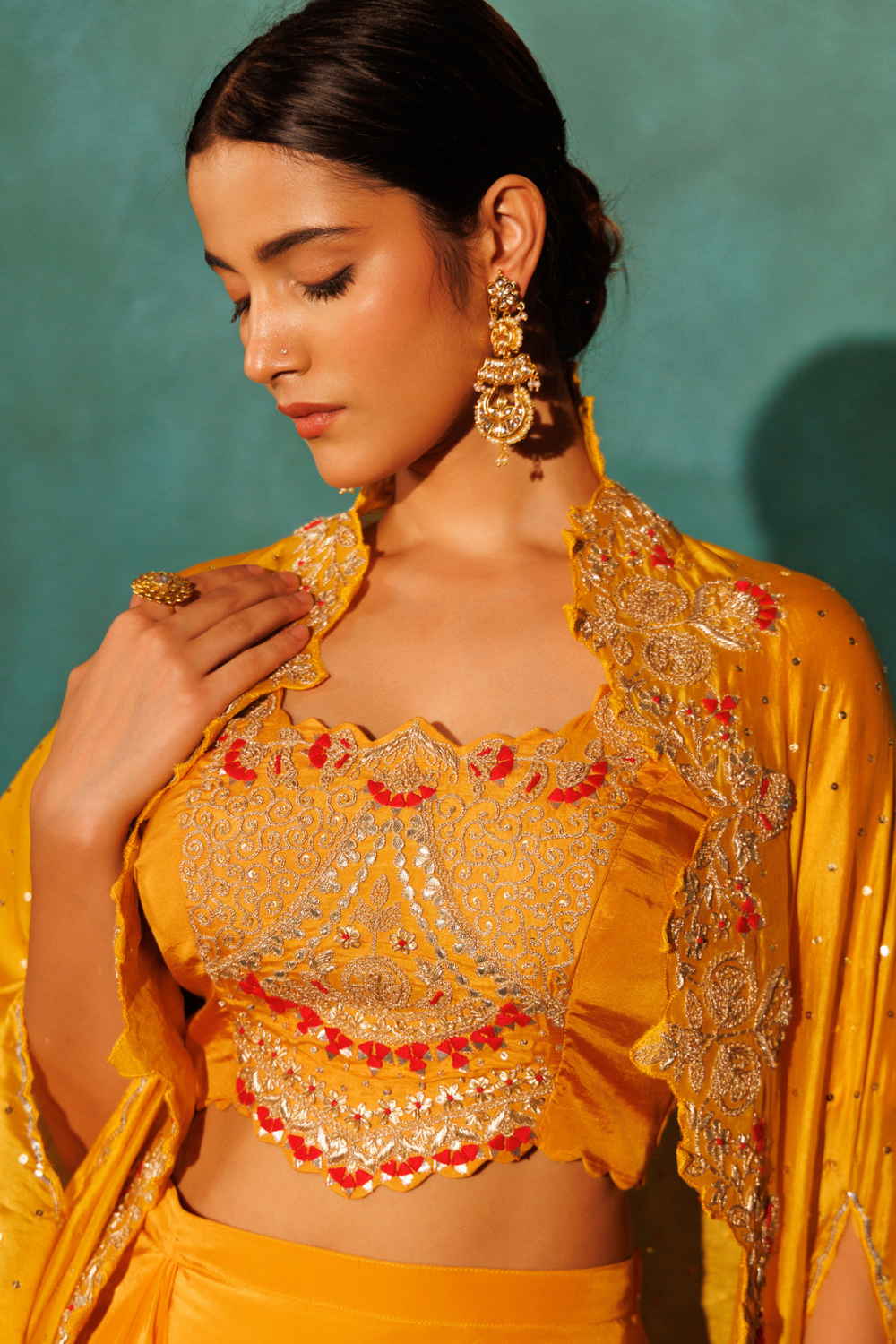 For The Woman Who Is A Burst Of Sunshine With Love Brimming Over, A Joyful Resplendent Silk Cape Set In Warm Yellow Saraswati Cape Keeps Tradition Alive By Reimagining Timeless Motifs In A Modern Silhouette. Crafted In Finest Silk, This Set Strikes A Statement With Our Signature Dori Marodi Embroidery Along With Reshamwork, Sequins, Tamba Gotta Patti & Zardozi.