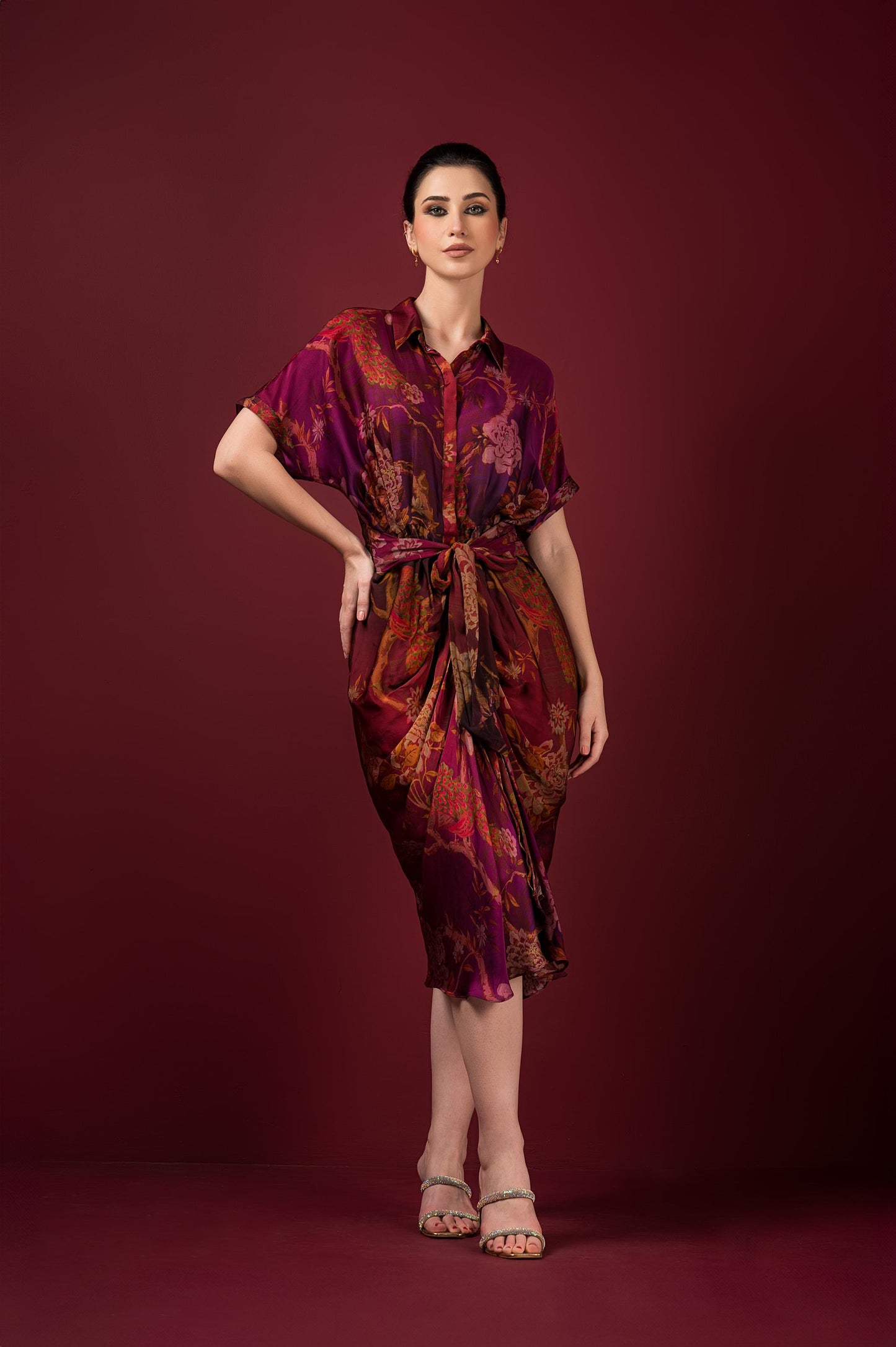 Satin Printed Drape Dress Shirt Collar And Front Opening With Broad Tie At Front.