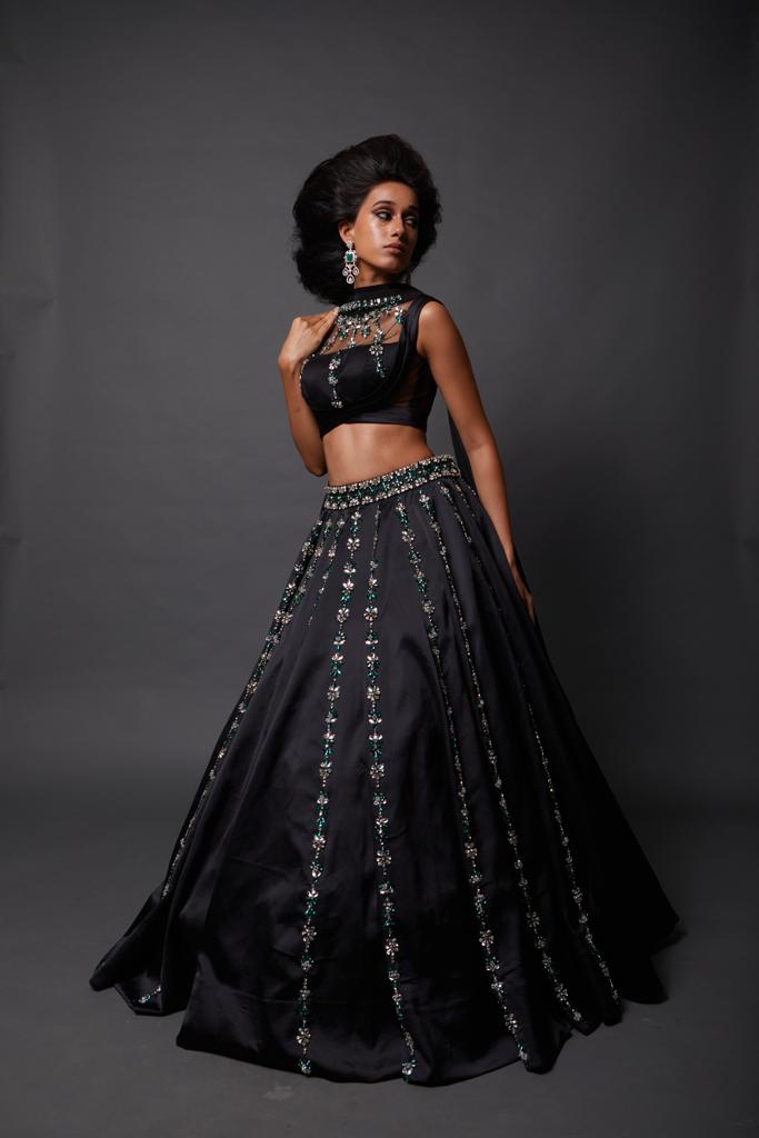 The Seher Black Lehenga Crafted From Sumptuous Turkish Satin Is Paired With A Crepe Blouse, Offering A Comfortable And Flattering Fit. Adorned With Glistening Crystals And Intricate Hand Embroidery, This Ensemble Transforms You Into A Radiant Vision. The Shimmering Crystals Catch The Light, Casting A Mesmerizing Glow, While The Meticulous Hand Embroidery Adds Depth, Texture, And A Touch Of Tradition To The Contemporary Design. Whether You'Re Attending A Wedding, A Grand Gala, Or Any Special Event, This Ensemble Ensures You'Ll Turn Heads And Leave A Lasting Impression. Pair The Seher Lehenga Set With Statement Jewellery, Elegant Heels, And A Clutch Bag To Make A Statement That'S Uniquely Yours.