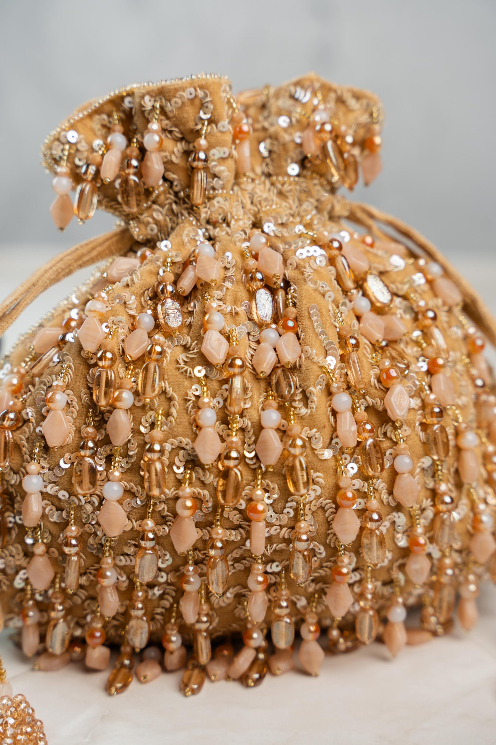This Tasseled Potli Is A Stunning Blend Of Elegance And Craftsmanship, Featuring Lustrous Beads And Intricate Work In A Cream And Gold Palette. Finished With Delicate Tassels, It’S The Perfect Accessory For Weddings, Festive Events, Or Evening Soirées.
