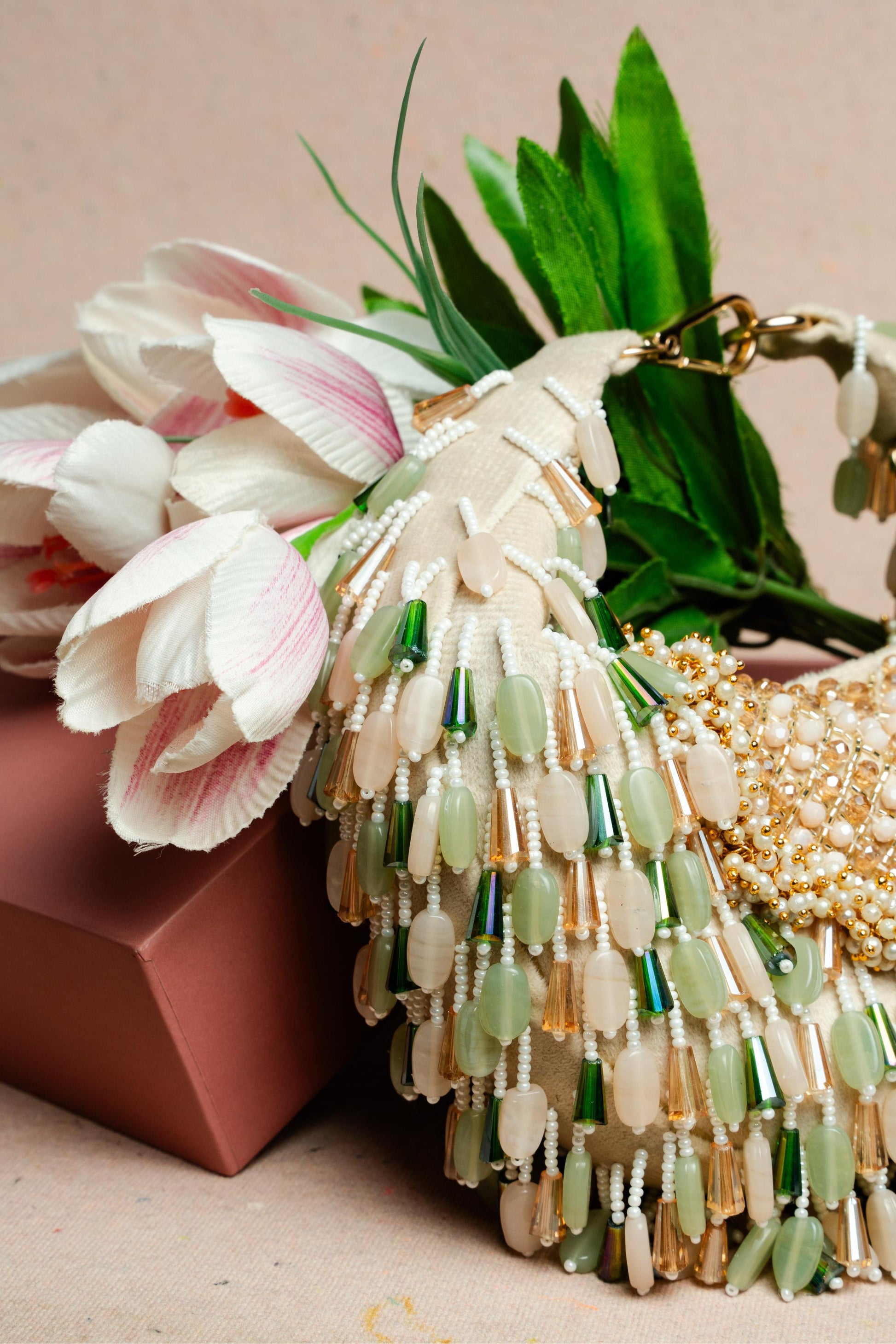 It Doesn't Get More Modish Than This Green And Cream Tasseled Potli Accompanied With Lattice Work And Beaded Tassels Throughout Making It An "Oh La La" Addition To Any Contemporary Fit.