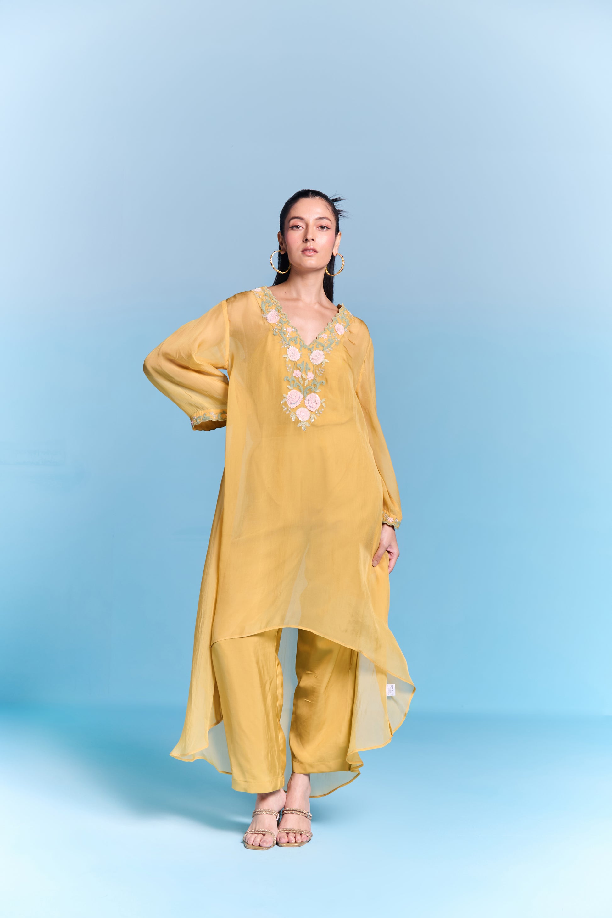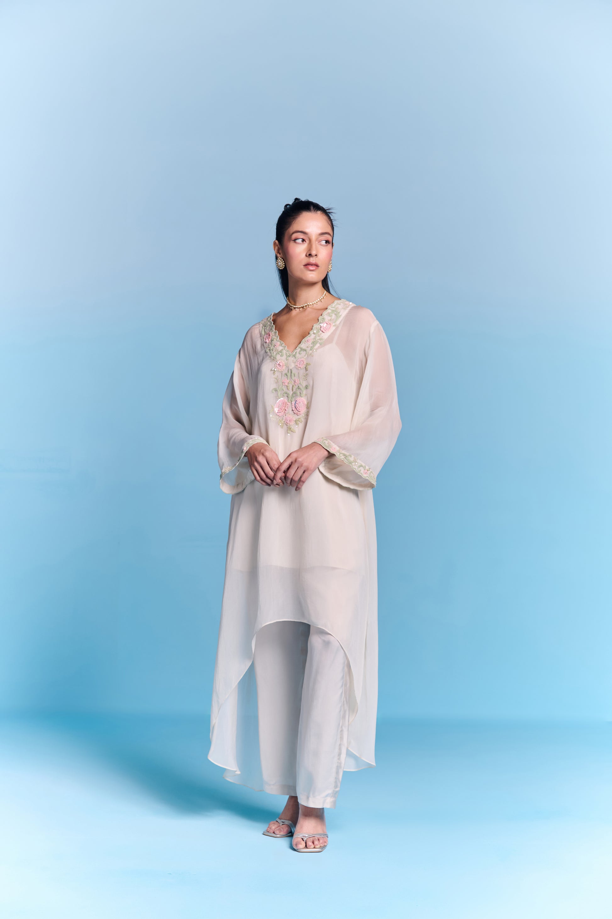 Step Into A Comfort Soothing Color And Pattern With Shaina Kaftan Set. A Subtle Combination Of Floral Embroidery On Relaxed Silhouette Is Designed With A Statement V-Neckline And Sleeves Detailing. Billowy Sleeves Add A Soft Movement. It Is Paired With Coordinated Pants. Perfect For Your Gatherings, Lunch Dates Or Holidays.