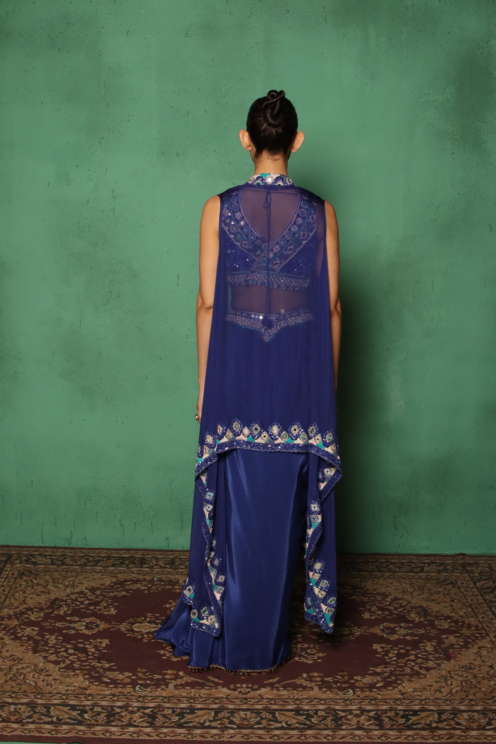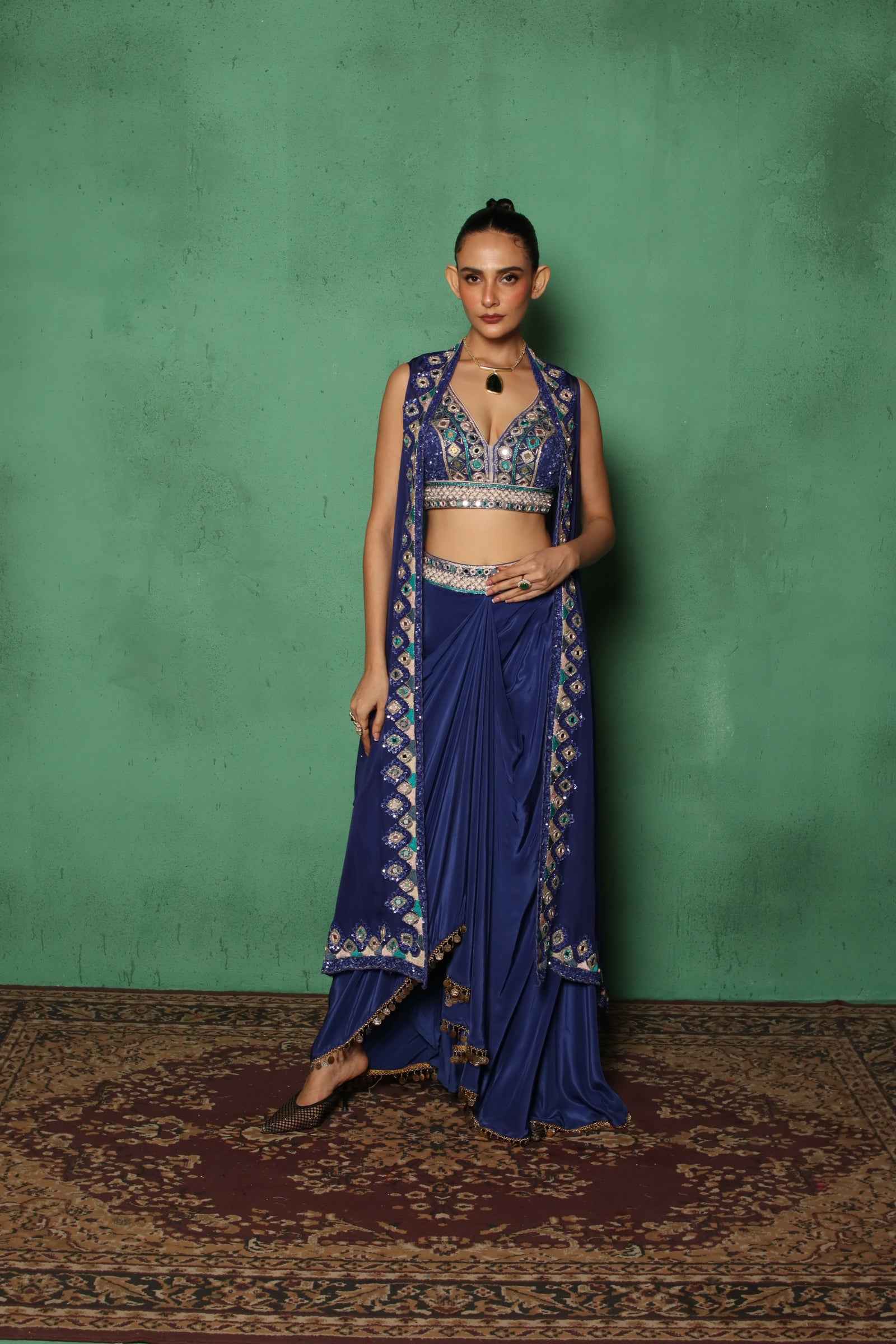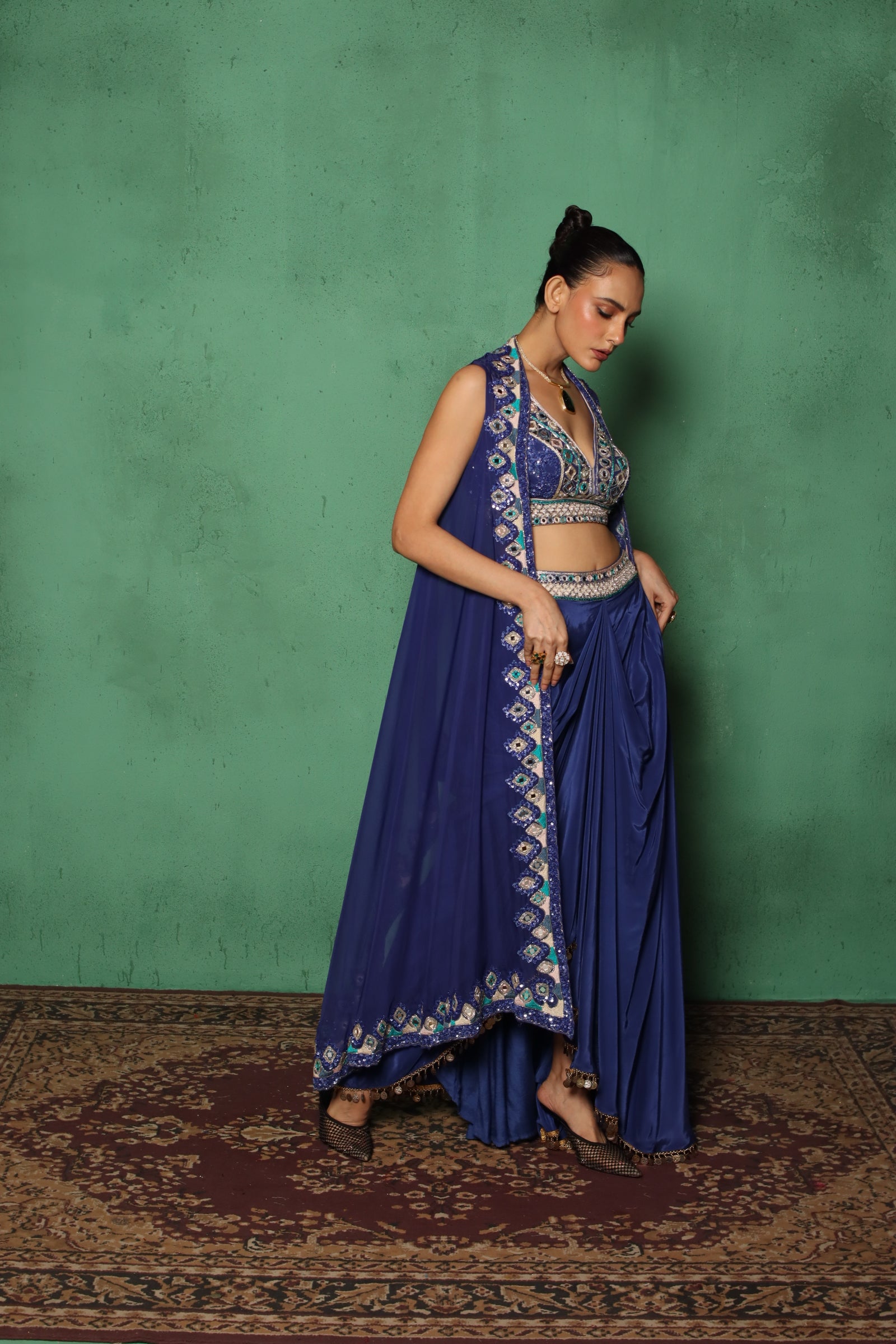 Step Into The Spotlight! This Embroidered Bustier, Cape & Draped Skirt Ensemble Is Designed For Mehandi, Haldi Or A Vibrant Carnival Celebration. The Shimmering Mirror Work Radiates Festive Brilliance.