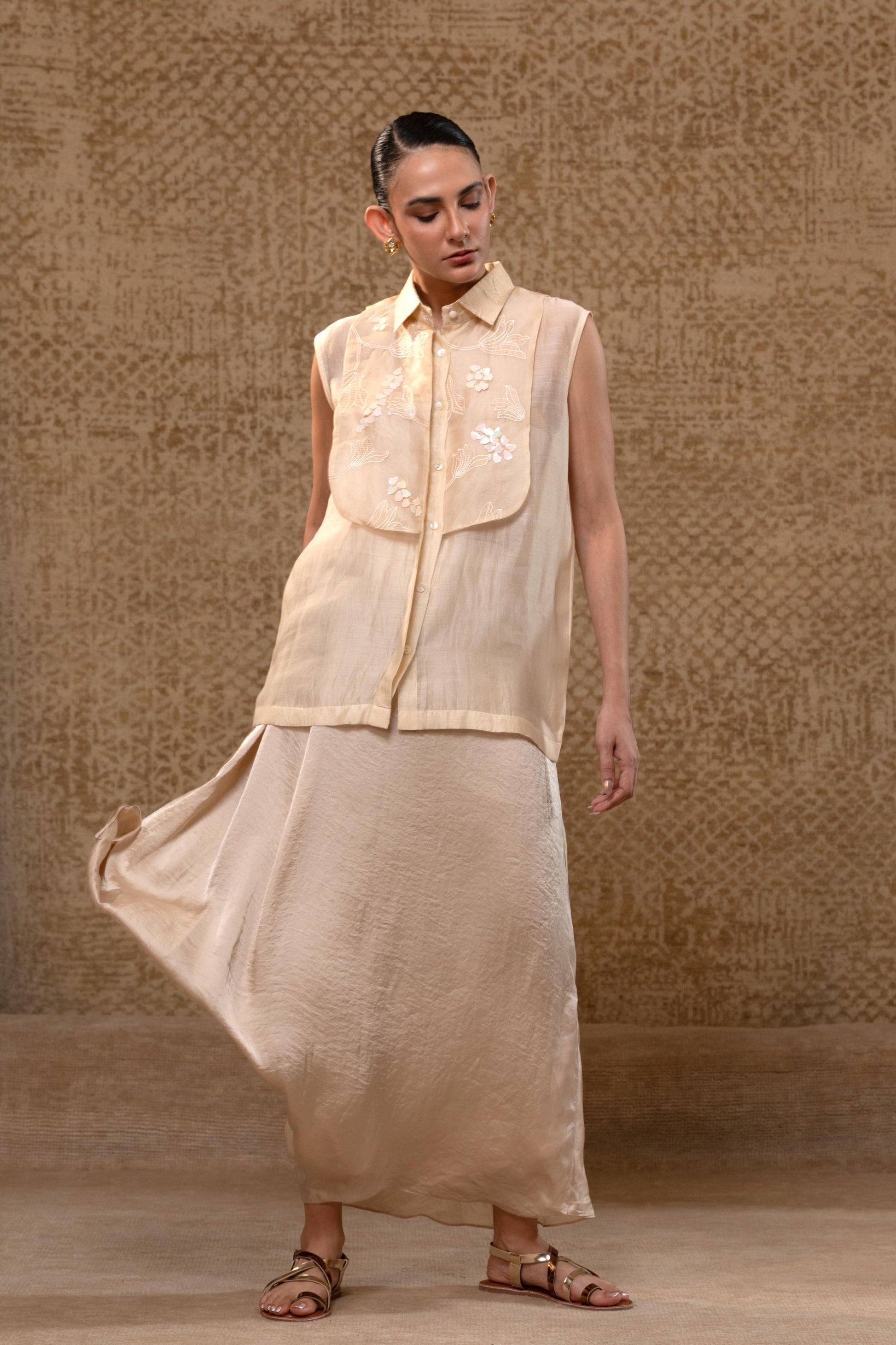 A Sleeveless Mul-Chanderi Shirt Elevated With A Sheer Organza Yoke, Intricately Appliquéd With Chanderi Zari Fabric And Hand-Embellished With Sequins. Paired With Fluid Wide-Leg Pants, The Silhouette Is Understated Yet Striking Perfect For Those Who Appreciate Quiet Luxury.
