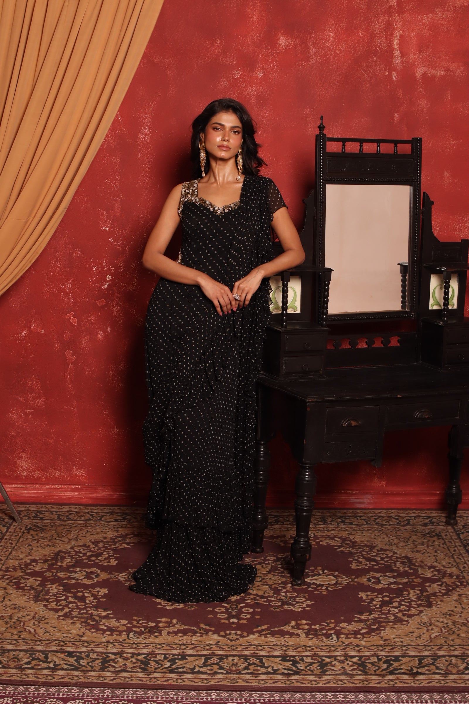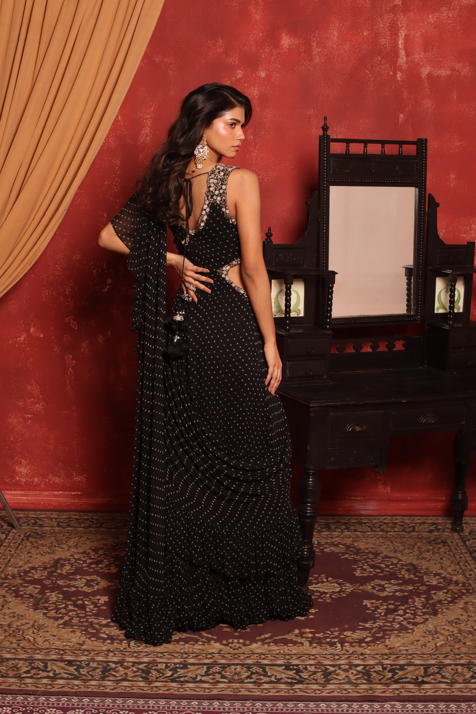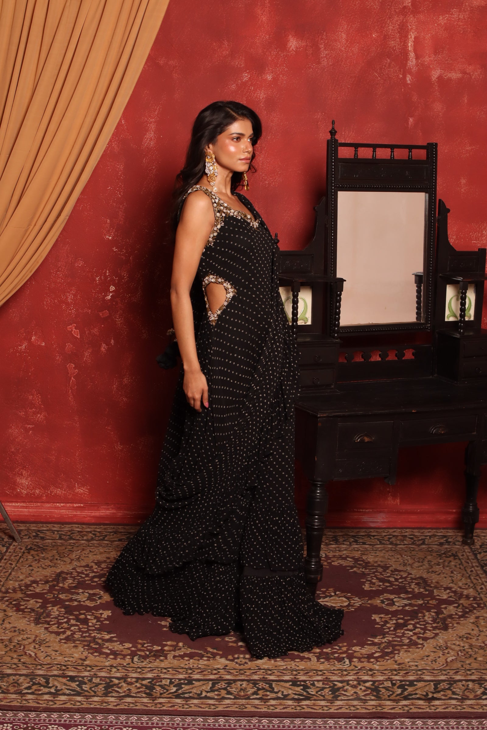 Black Magic! The Artistry Of Bandhani Shines In This Gown Saree With Drape. From The Pearl Work To The Katdana Detailing On The Neckline And Waist, Every Element Speaks Volumes.