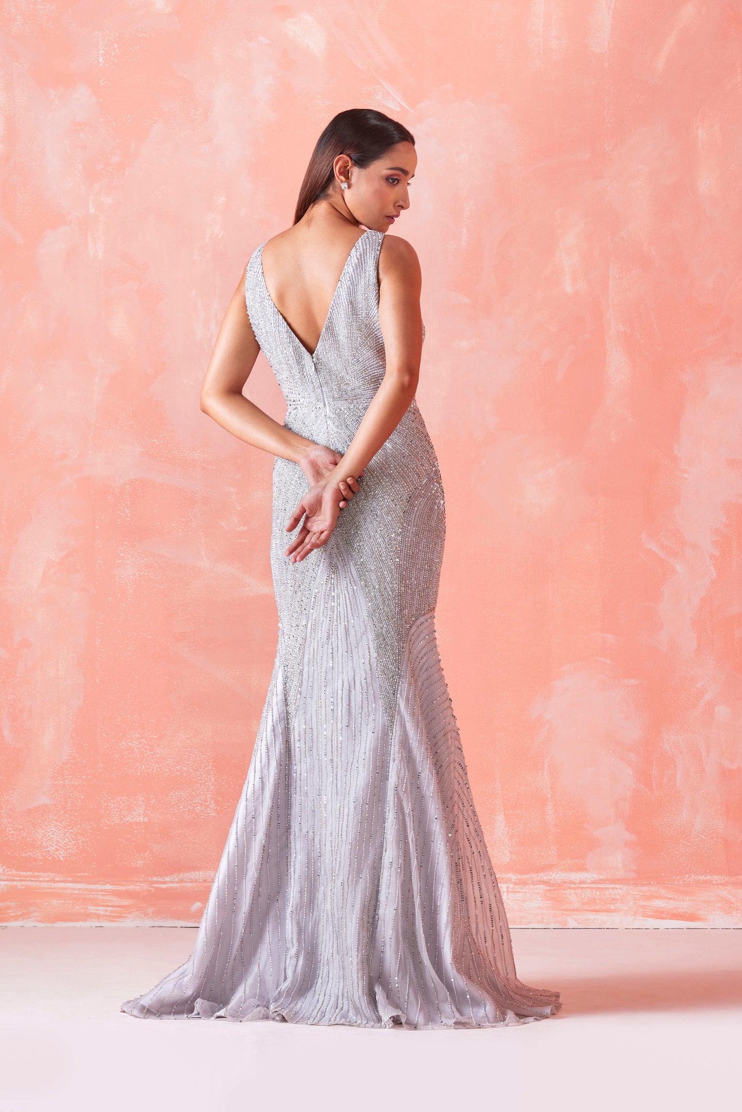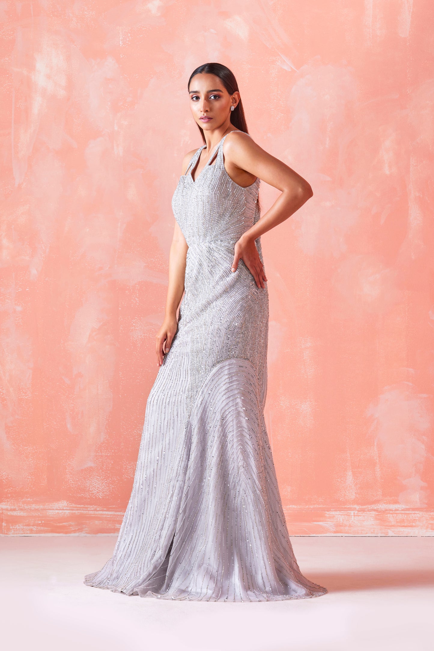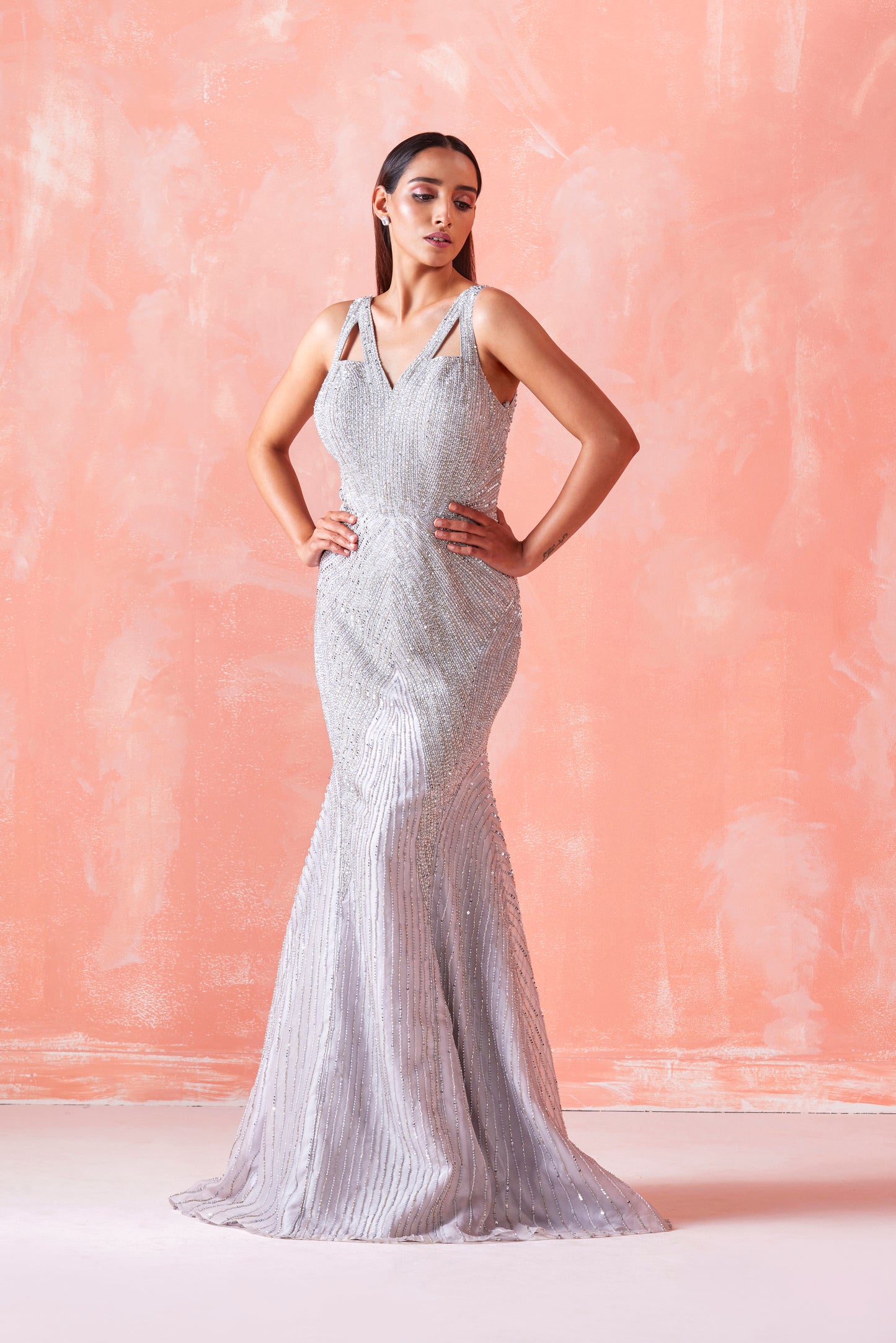 Silver Mermaid Gown Featuring A Contemporary Strap Sleeve Based On Organza- Highlights Tonal Sequin And Detailed Bead Embroidery.