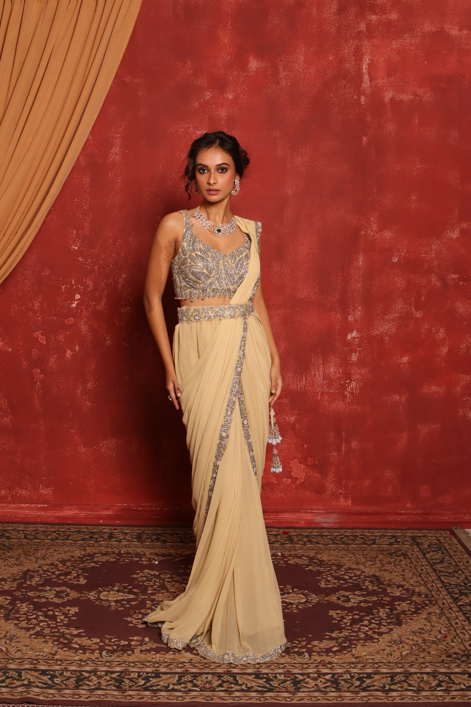 Leaves Us Speechless! This Gorgeous Saree Features Beautiful Leaf Detailing On The 3D Blouse And A Flowing Drape For A Sleek Look.