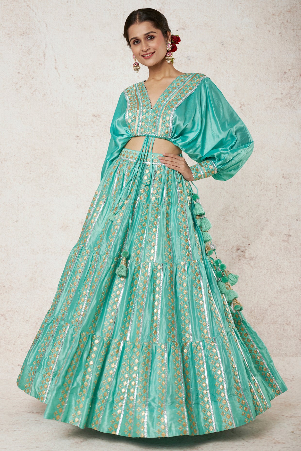 Classic Blue Blouse Based On Crepe Features Exquisite Zardosi Work, Enhance Neck And Drawstring In Front. It Is Paired With A Victorian Flared Skirt Based On Tussar Silk Embellished With Gold Leaf Detailing And Silver And Gold Gota Work.